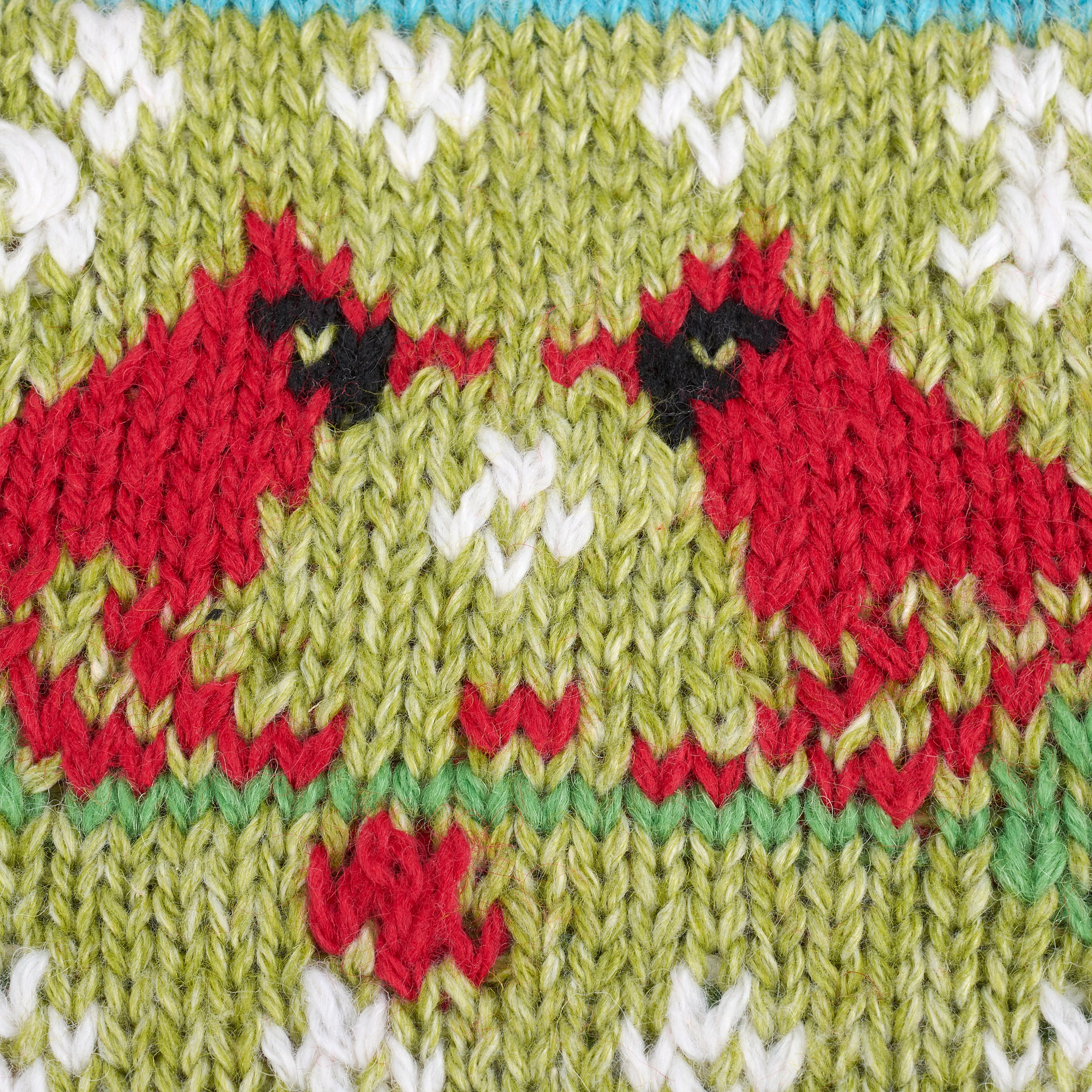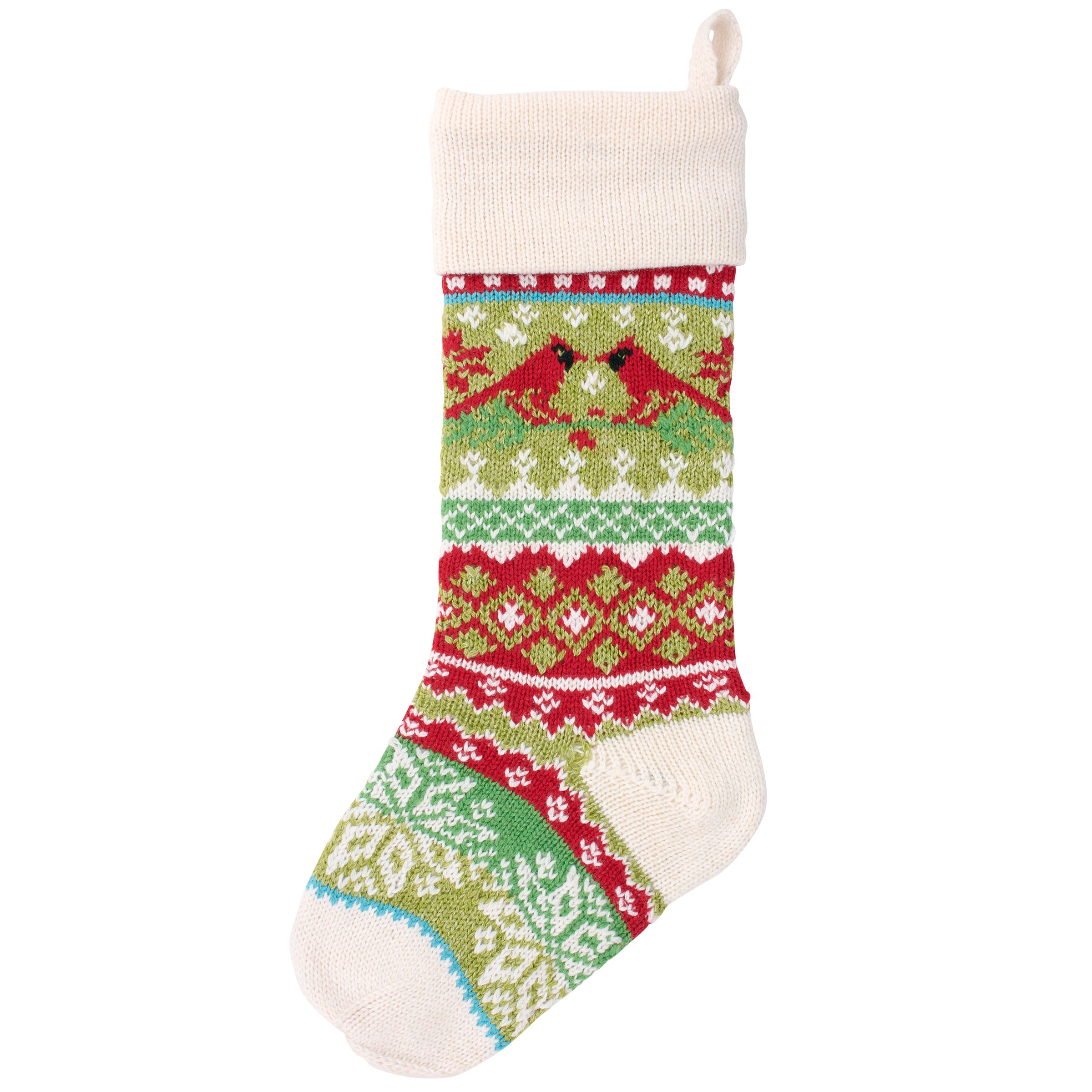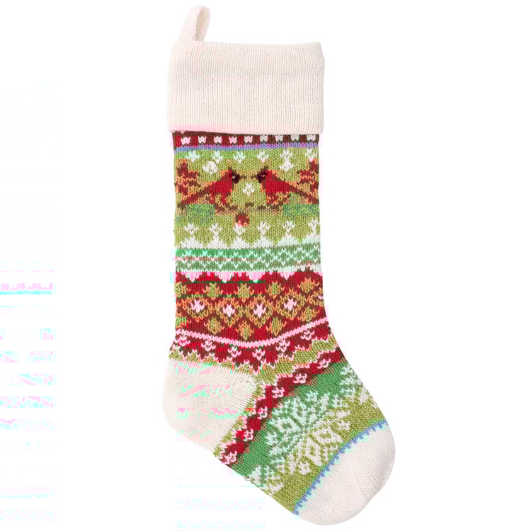 A double-sided stocking from our Christmas Collection displaying colorful knit designs of cardinals and classic holiday stocking patterns throughout the stocking. Our Knit Cardinals stocking is ready to hang via the loop attached to the top. A vintage Christmas home accent perfect for seasonal decorating and holiday gifting.