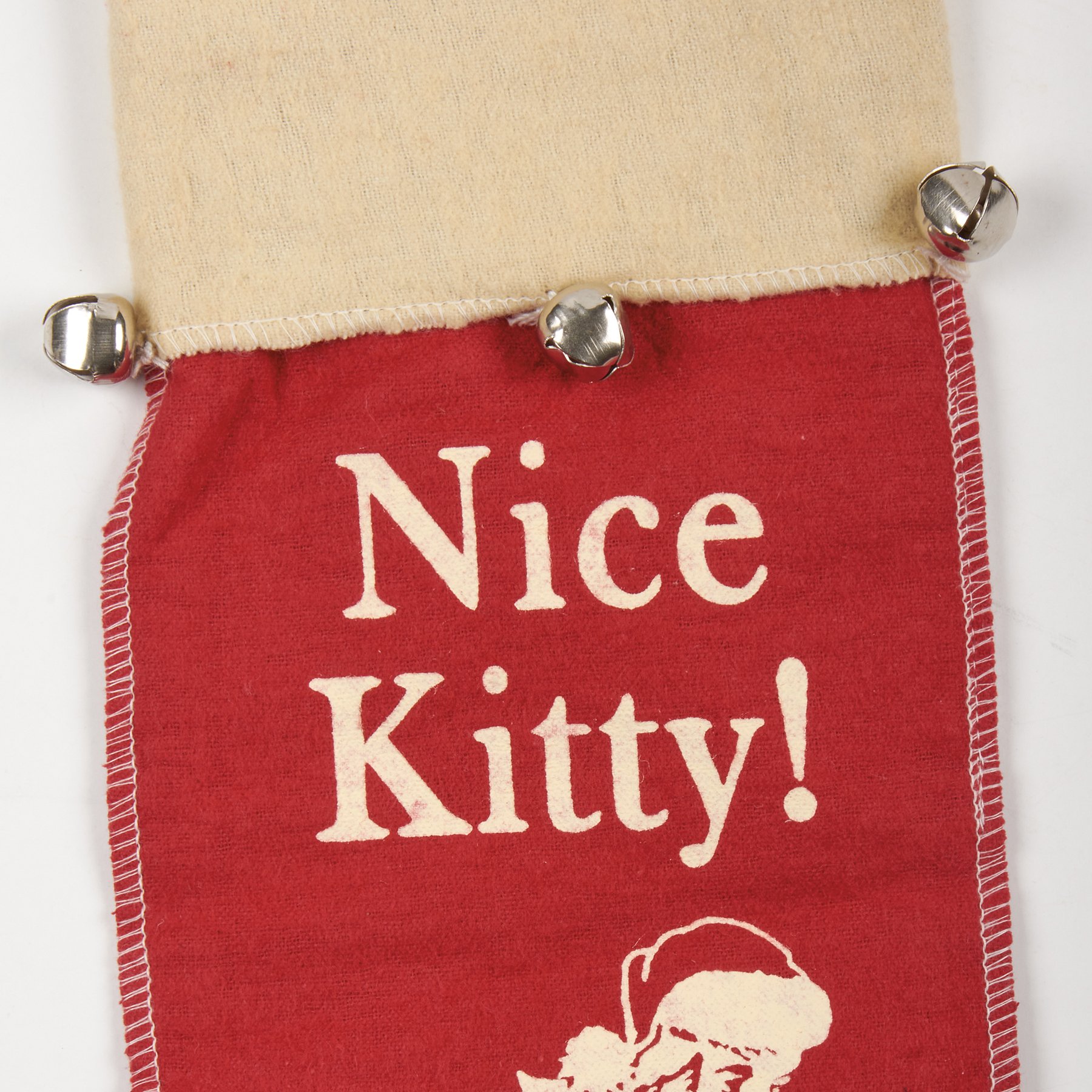A vintage fabric stocking from our Holiday Pet Collection displaying a "Nice Kitty!" sentiment with a design of Santa holding a treat for a cat and bells along the cuff. Our Nice Kitty! Christmas stocking includes a loop for easy hanging. A fun seasonal home accent.
