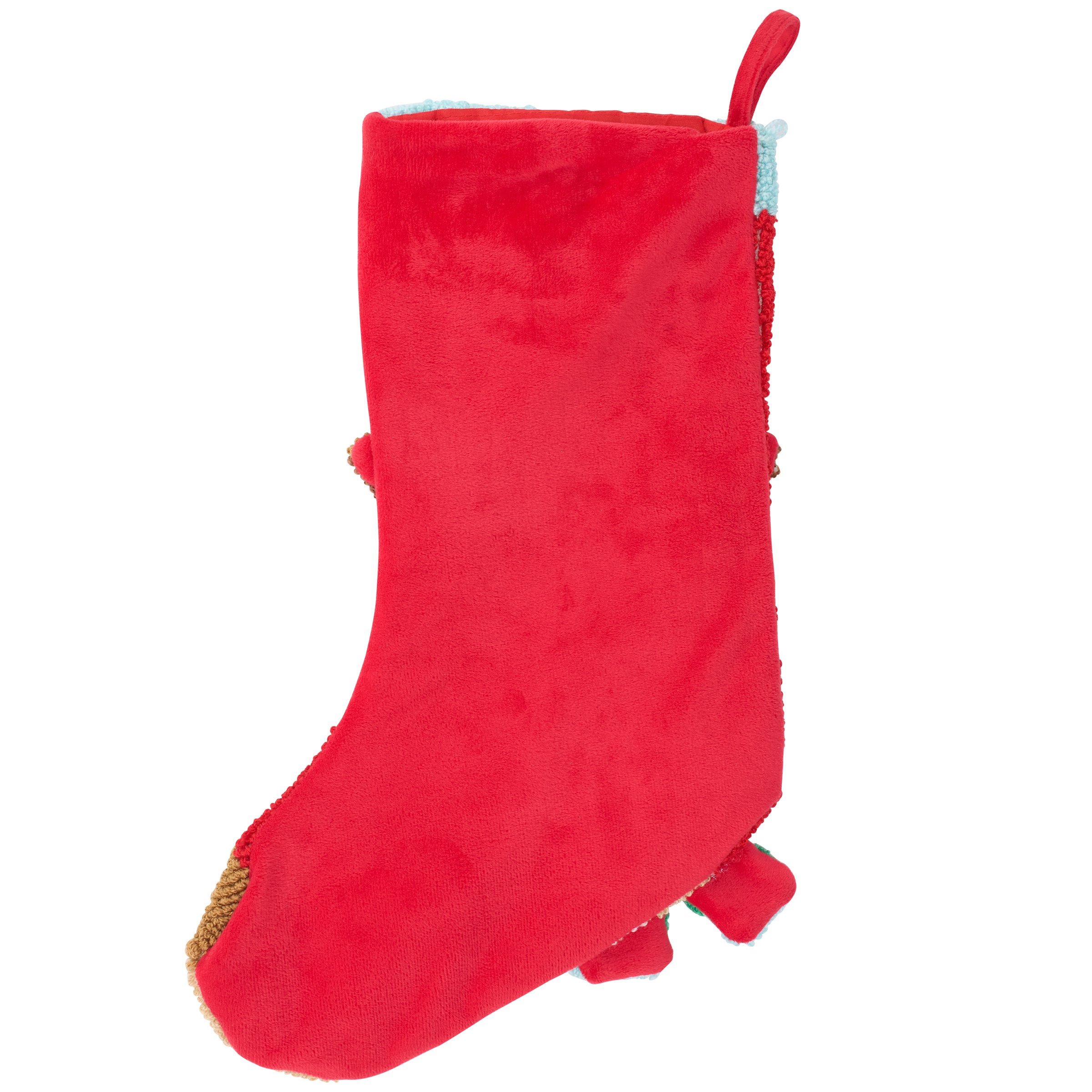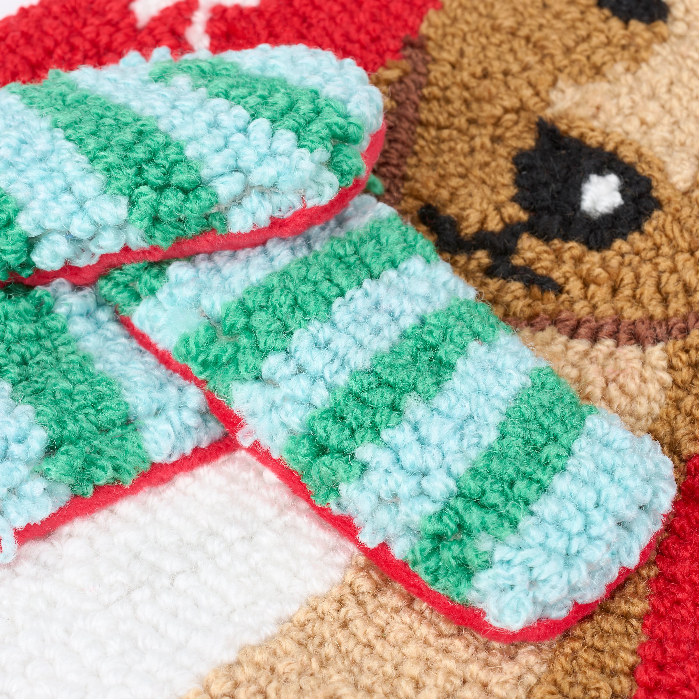 A stocking from our Christmas Collection displaying a colorful reindeer design made in a hand-hooked style for added texture with raised accents for the ears and scarf. Our Reindeer Scarf stocking is ready to hang via the loop attached to the top. A retro Christmas home accent perfect for seasonal decorating and holiday gifting.