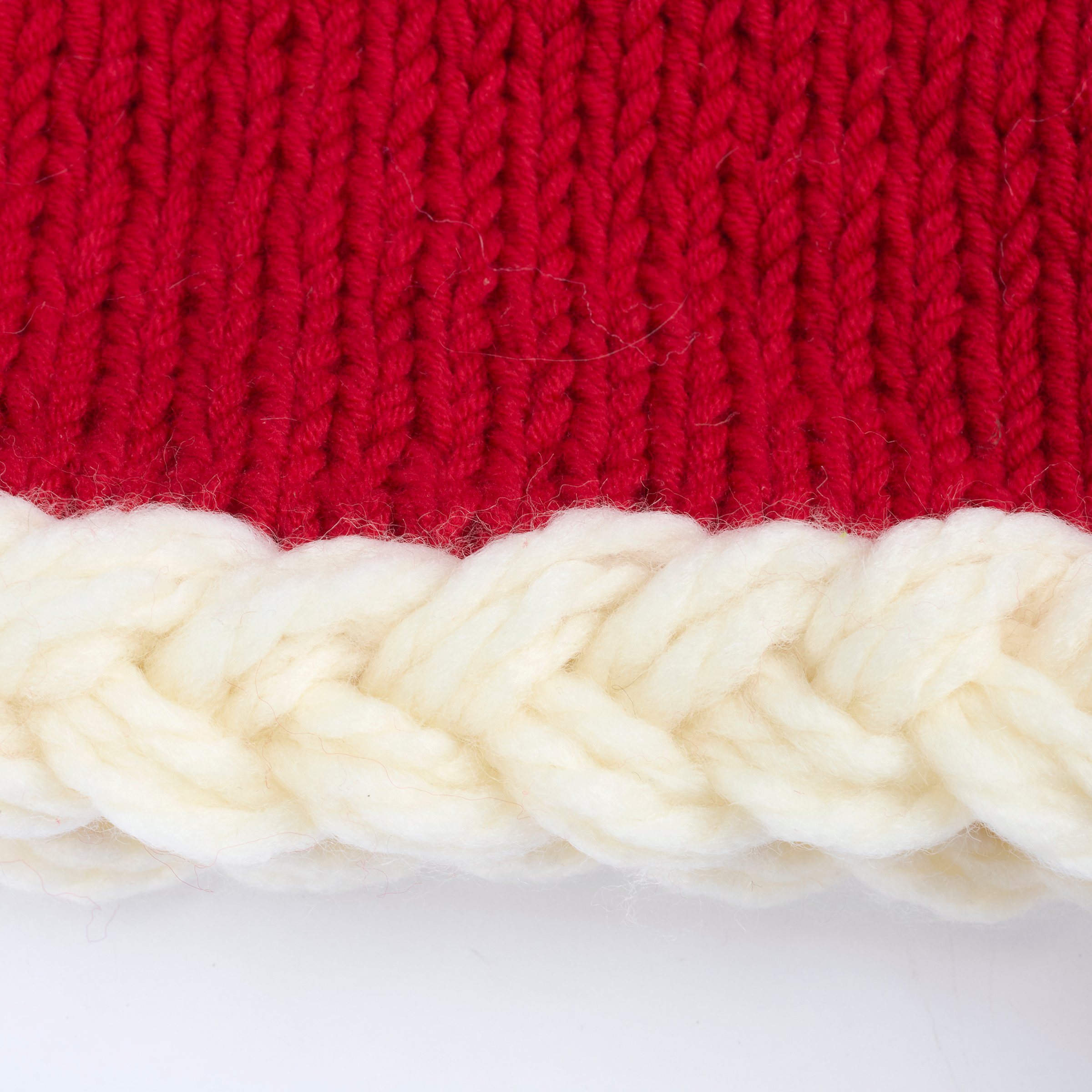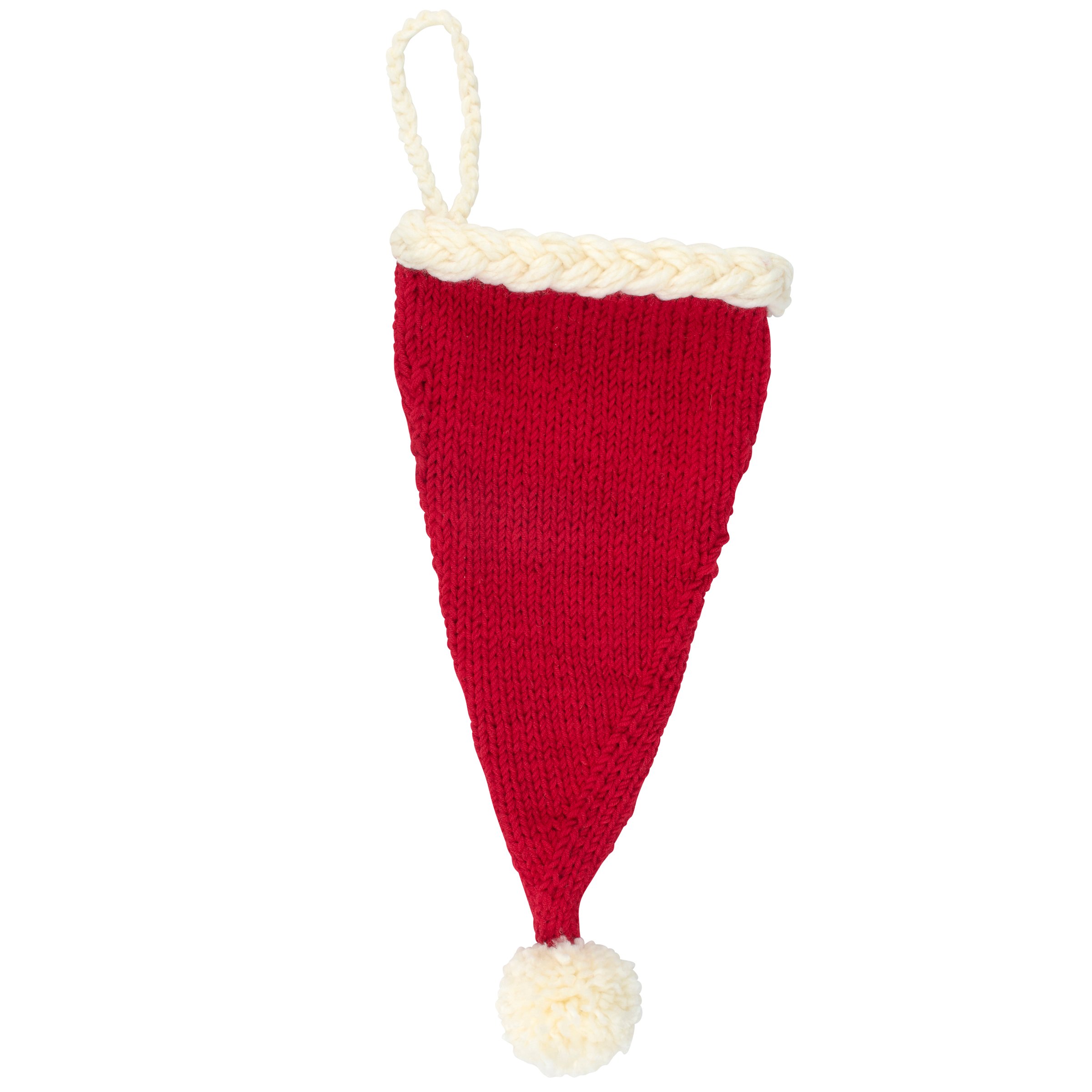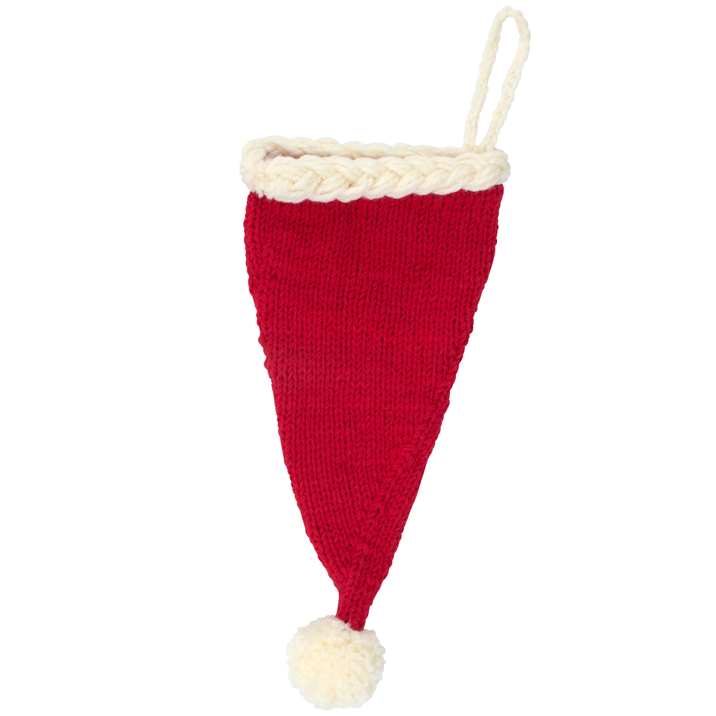 A stocking from our Christmas Collection displaying a upside down Santa hat design in a hand knit style that coordinates well with vintage seasonal decor. Our Santa Hat stocking is ready to hang via the string loop attached to the top. A vintage Christmas home accent perfect for seasonal decorating and holiday gifting.