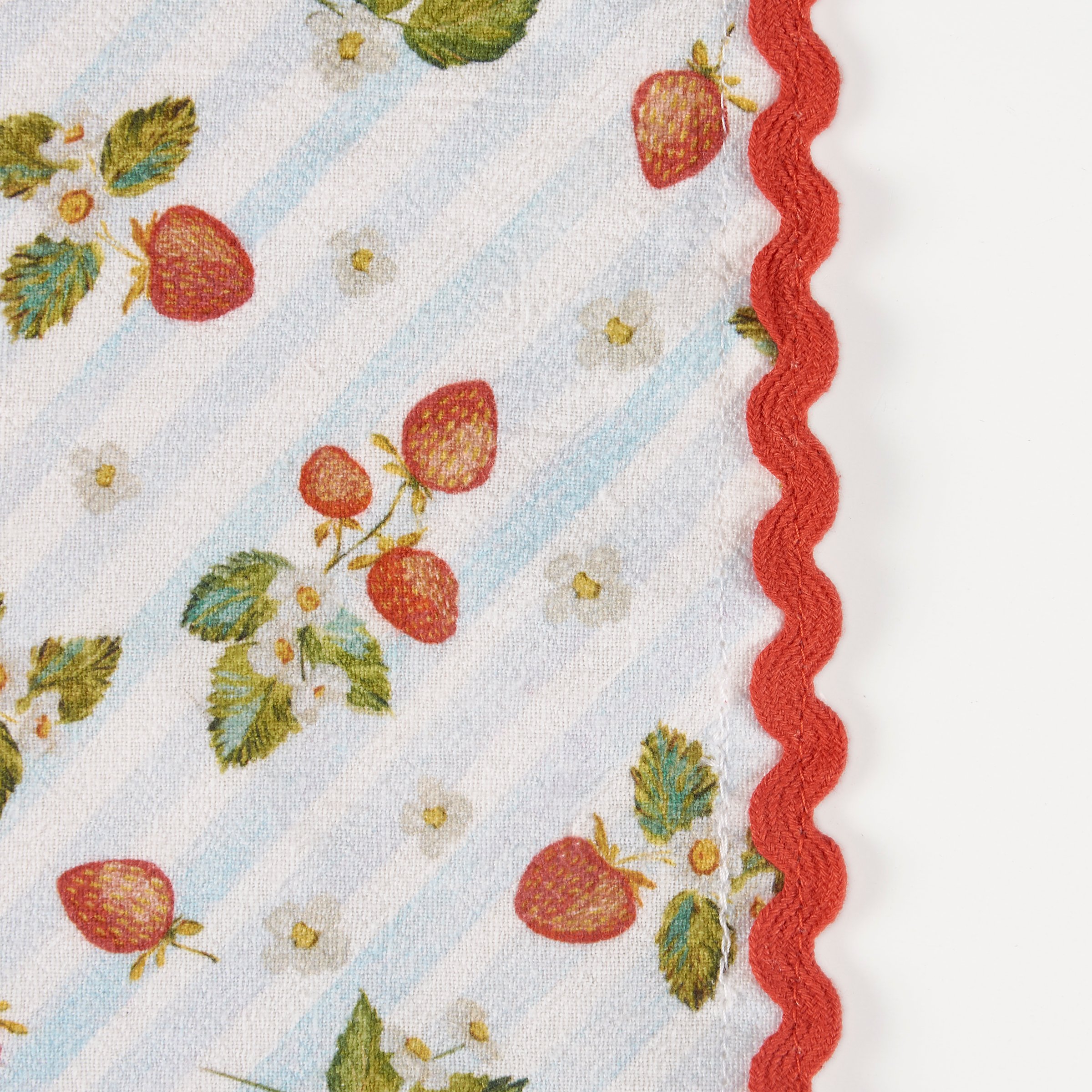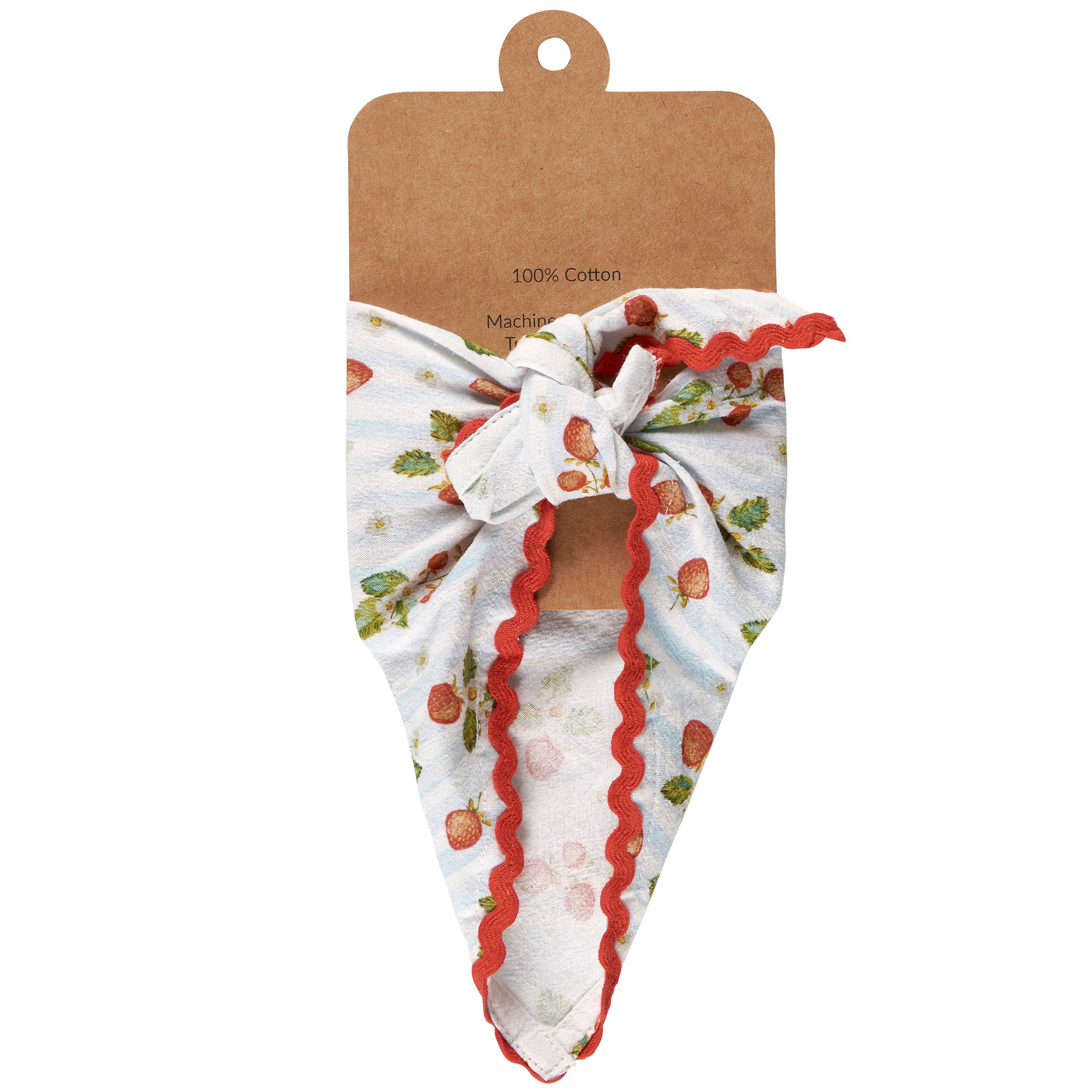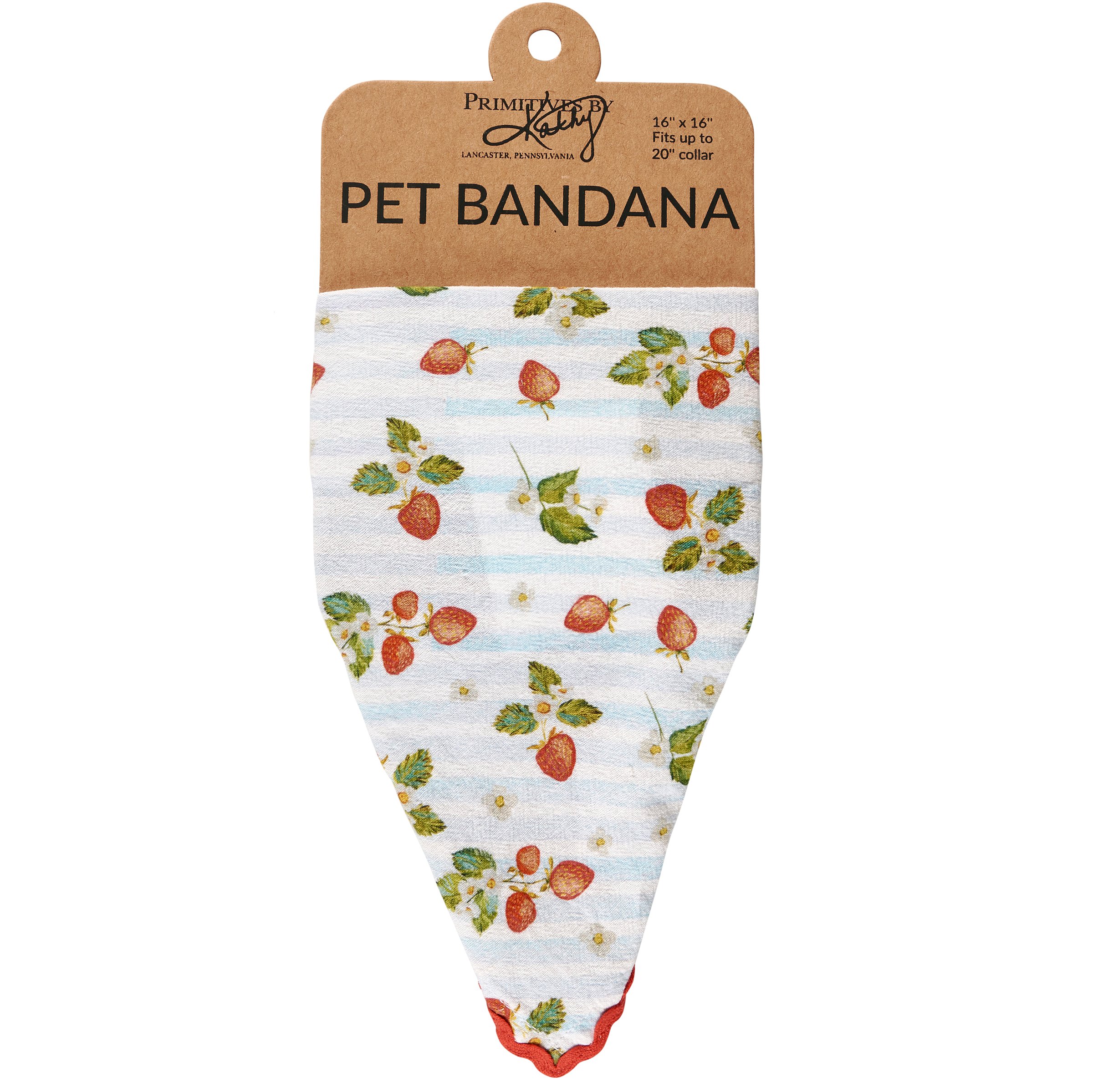 A small cotton pet bandana from our Pet Collection displaying an all-over pattern of wild strawberries with light stripe background and red rickrack trim. Designs are replicated from original art hand painted in a watercolor style. Our small Strawberry dog bandana is machine-washable for convenient cleaning. Packaged on a cardboard backer with hole to easily display on rack and wash instructions on the back. A charming strawberry-themed accessory perfect for any furry family member. Small size fits up to a 20 inch neck.