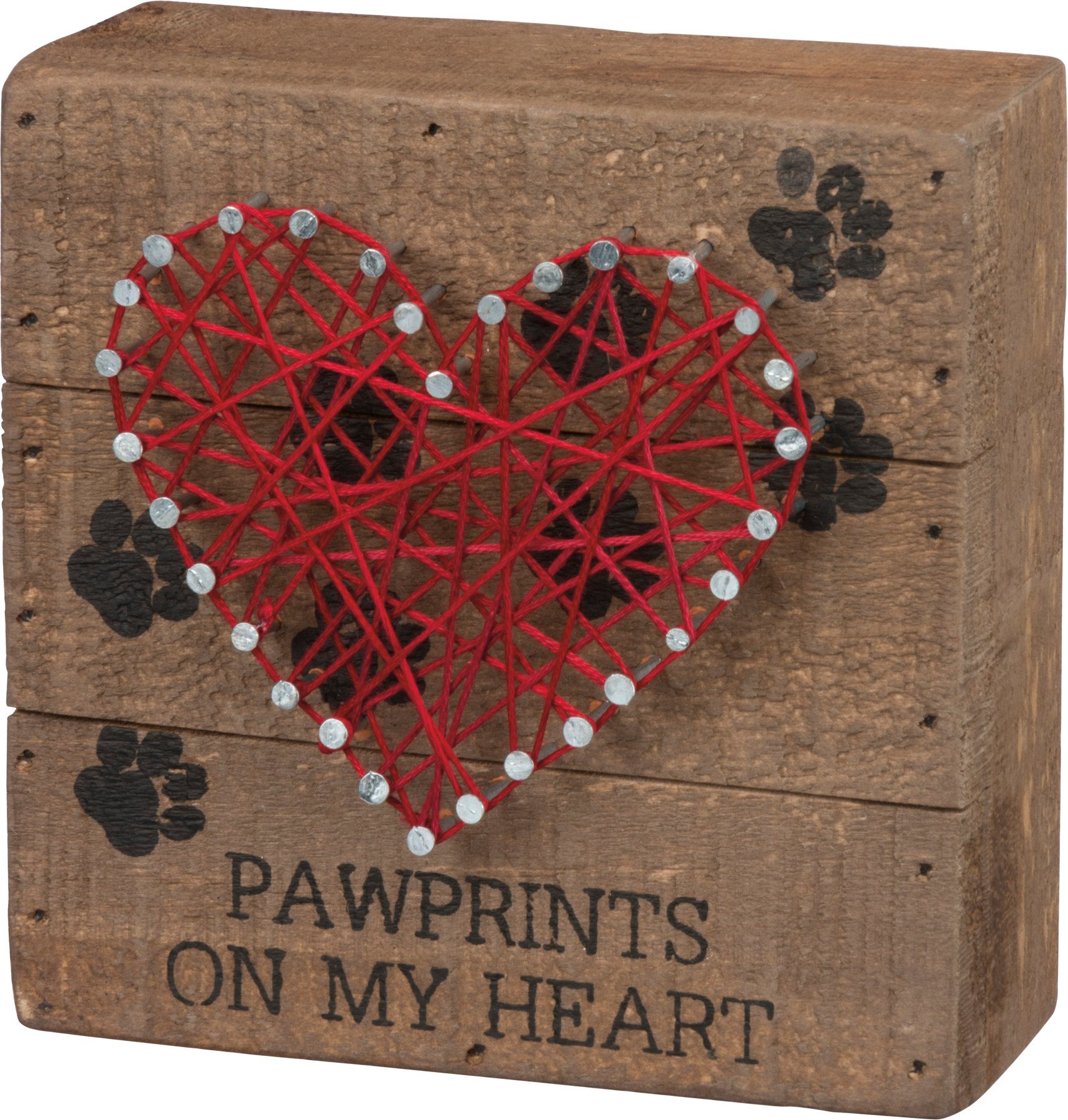 A wooden box sign featuring "Paw prints On My Heart" sentiment with paw print designs and hand-strung heart design. Easy to hang or can free-stand alone.