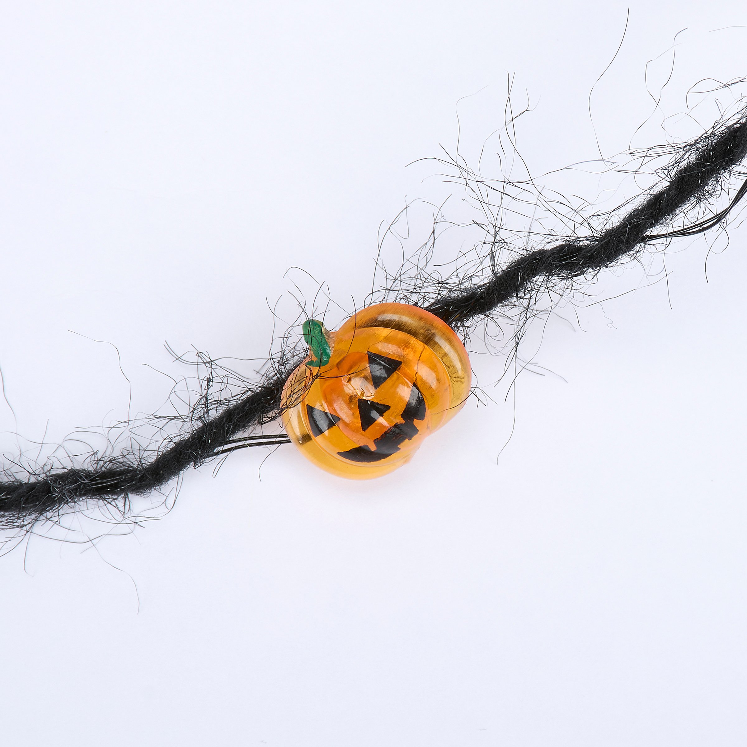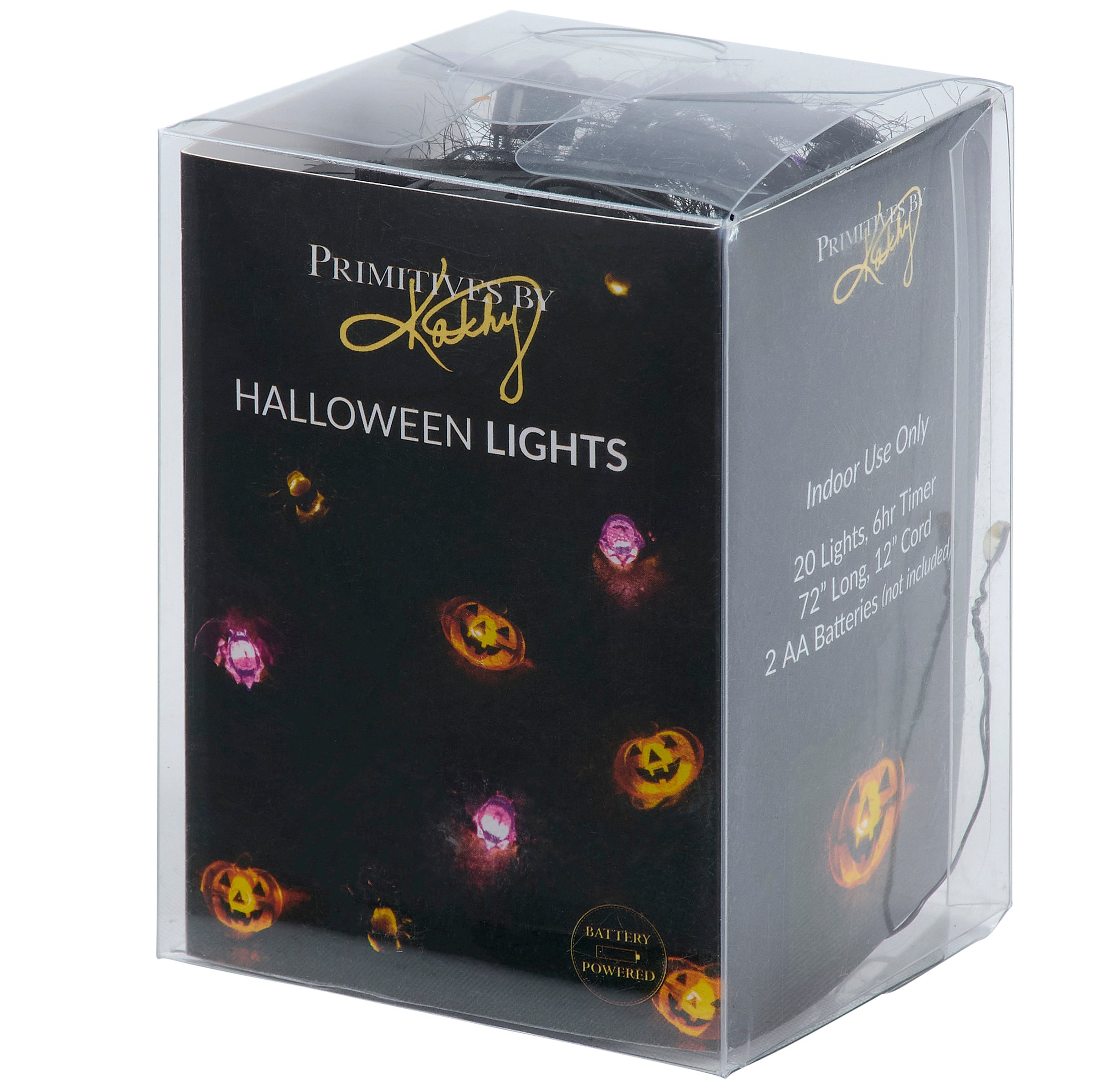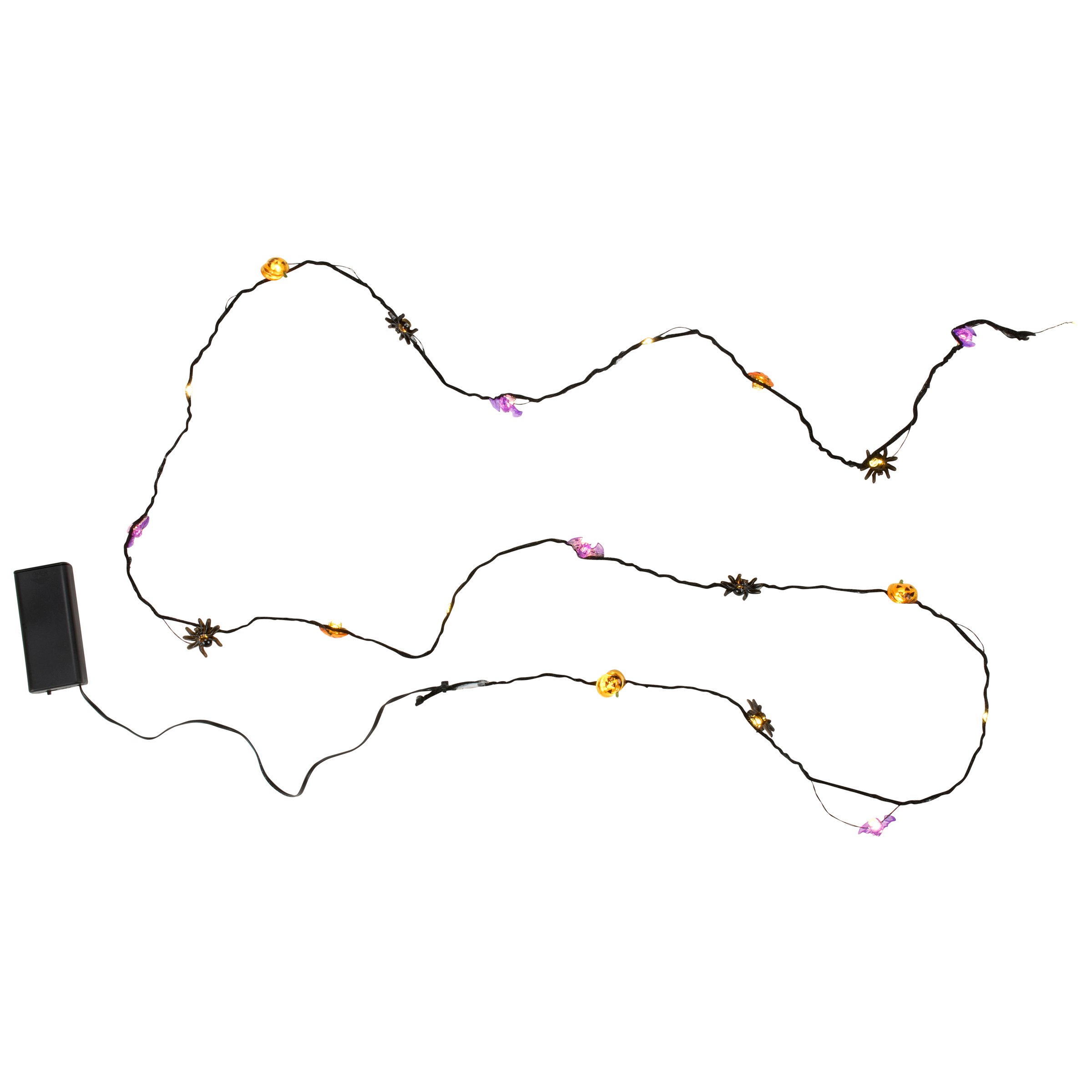 A set of string lights from our Halloween Collection featuring light up bats, jack o'lanterns, and spiders. This set of Halloween string lights includes 20 lights along a 72 inch wire attached to power source and 12 inch cord. Our Bats Jacks And Spiders string lights feature a convenient 6 hour timer powered by 2 AA batteries (not included). Indoor use only. Seasonal lights are packaged in an acrylic box with insert displaying working lights and product information. A fun Halloween home accent perfect for adding seasonal lighting to any room or display.