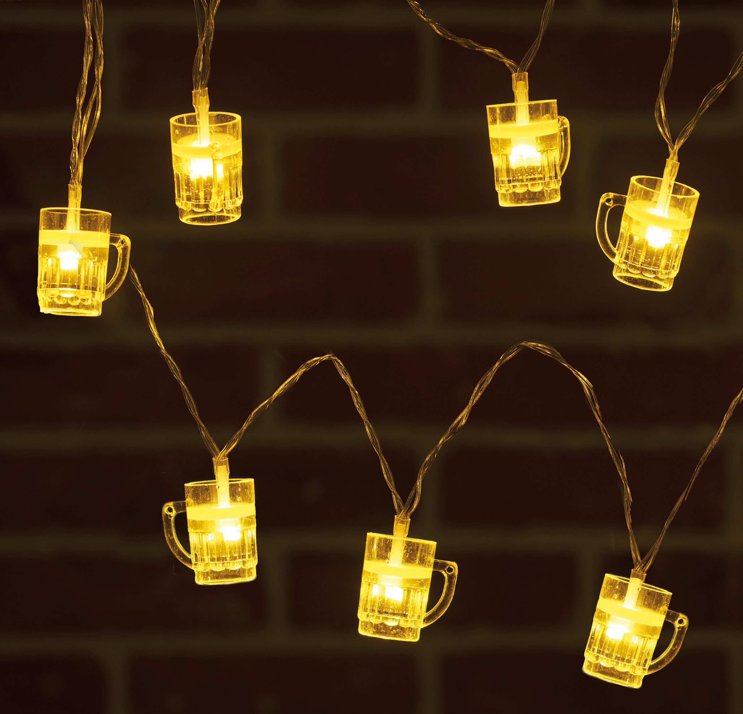 A fun set of string lights from our Alcohol Collection featuring light up beer mugs perfect for adding the charm of a favorite drink to any space. String light includes 10 beer mug lights along a 53 inch string attached to power source and 10 inch cord. Our Beer Mug string lights features a convenient 6 hour timer and runs on 2 AA batteries (not included). Indoor use only. Packaged in an acrylic box with insert displaying working lights and product information. A fun beer-themed home accent perfect for adding mood lighting to any room.