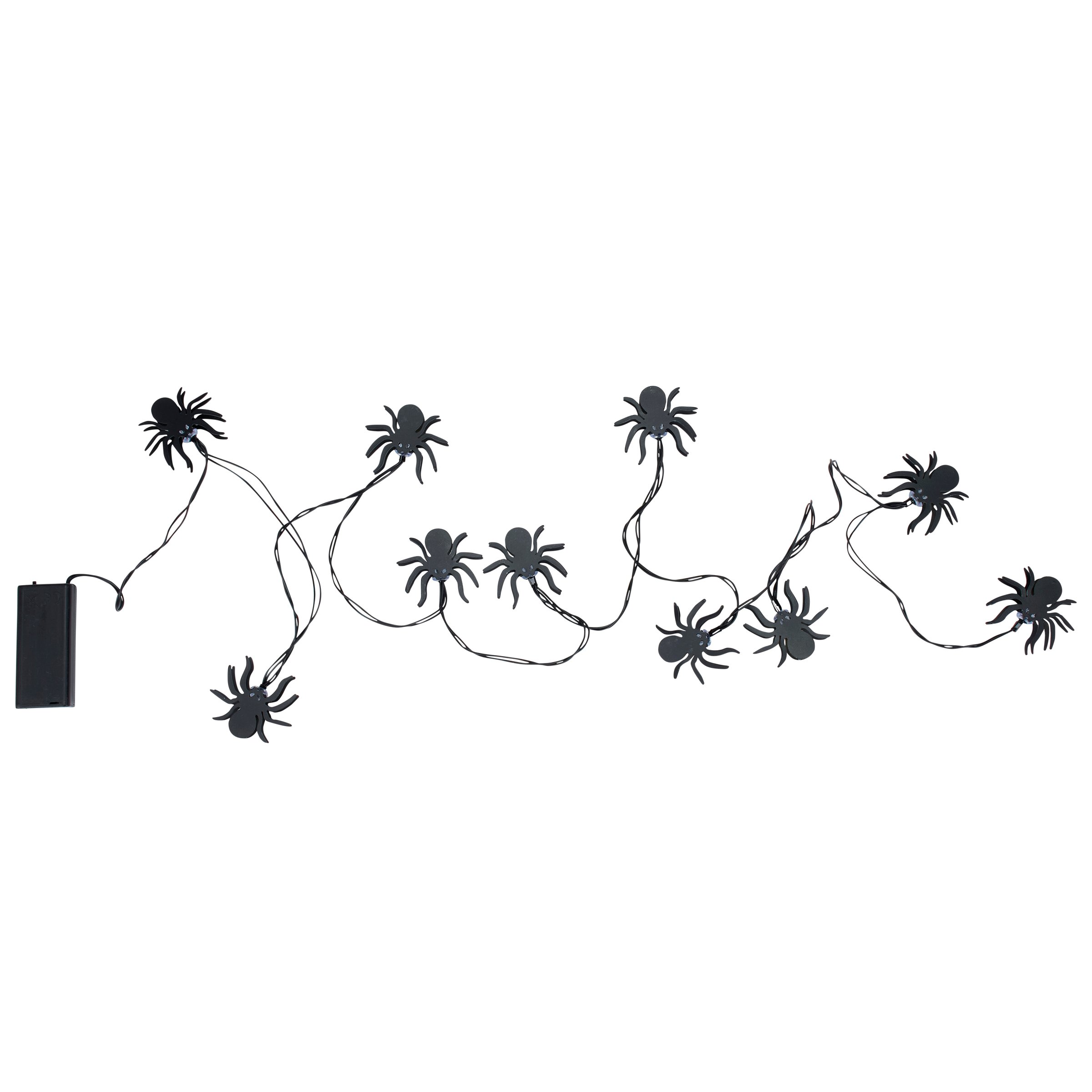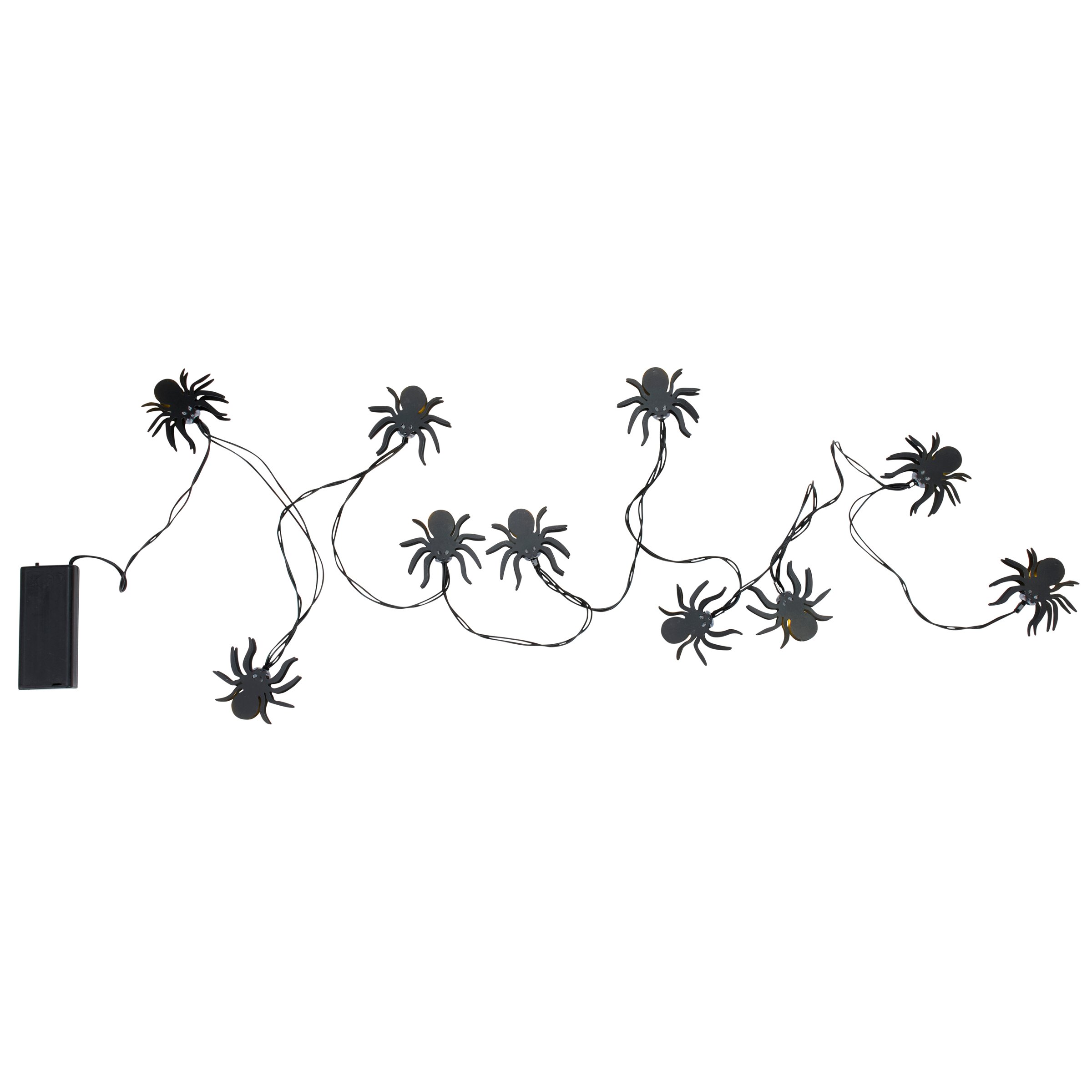 A set of string lights from our Halloween Collection featuring metal light up spider designs. This set of Halloween string lights includes 10 lights along a 71 inch wire attached to power source and 8 inch cord. Our Glowing Spider string lights feature a convenient 6 hour timer powered by 2 AA batteries (not included). Indoor use only. Seasonal lights are packaged in an acrylic box with insert displaying working lights and product information. A fun Halloween home accent perfect for adding seasonal lighting to any room or display.