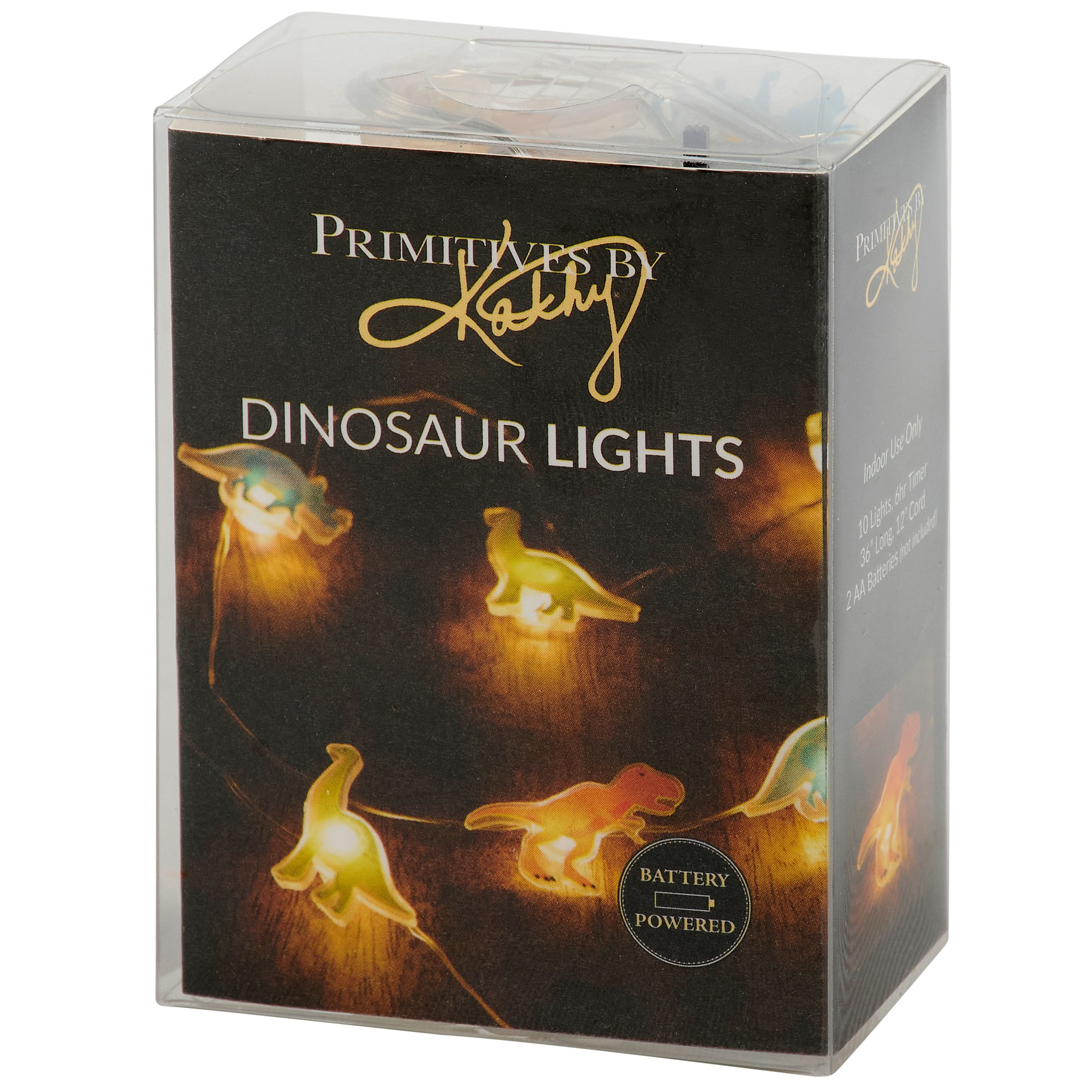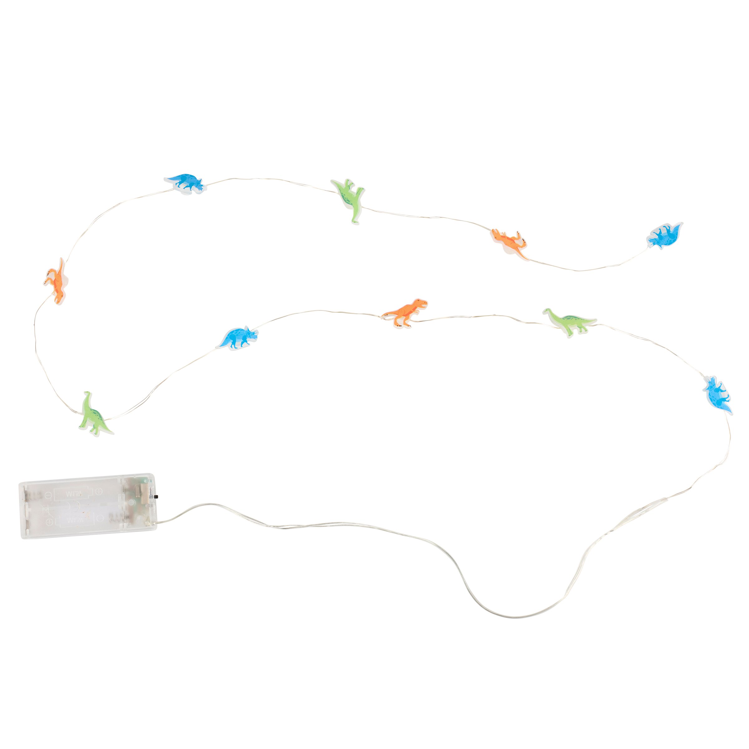 A set of string lights from our Lighting Collection featuring cute pastel dinosaur characters along a lighted wire that adds pastel flair to seasonal displays. String light includes 10 alternating dinosaur lights along a 36 inch wire attached to a power source and 12 inch cord. Our Multicolor Dinosaur string lights features a convenient 6 hour timer and runs on 2 AA batteries. Batteries not included. Indoor use only. Seasonal string light set is packaged in an acrylic box with insert displaying working lights and product information. A pastel dinosaur-themed home accent perfect for adding mood lighting to any home or work space.