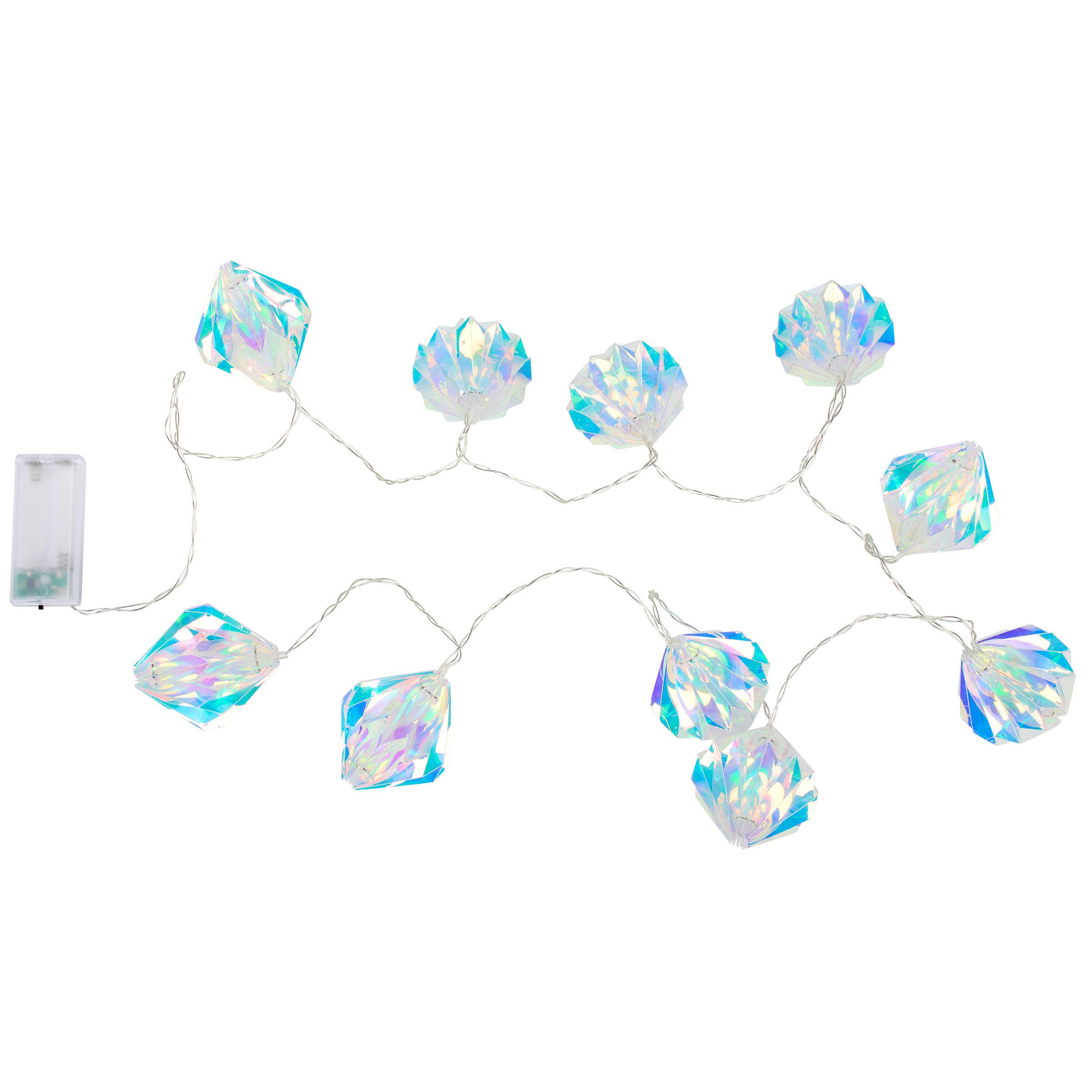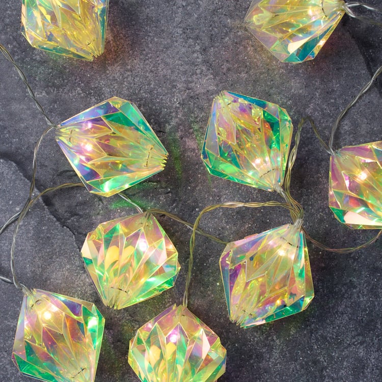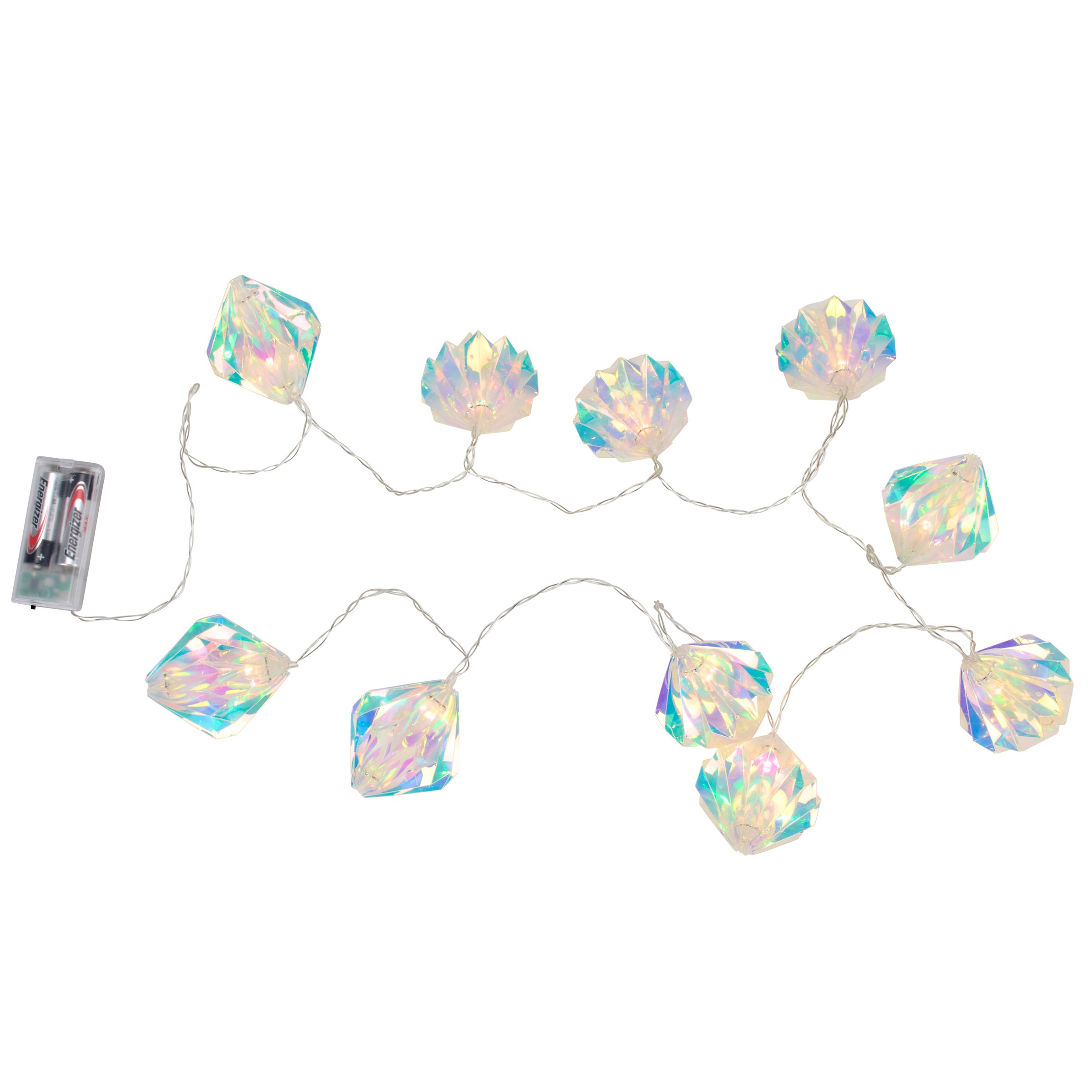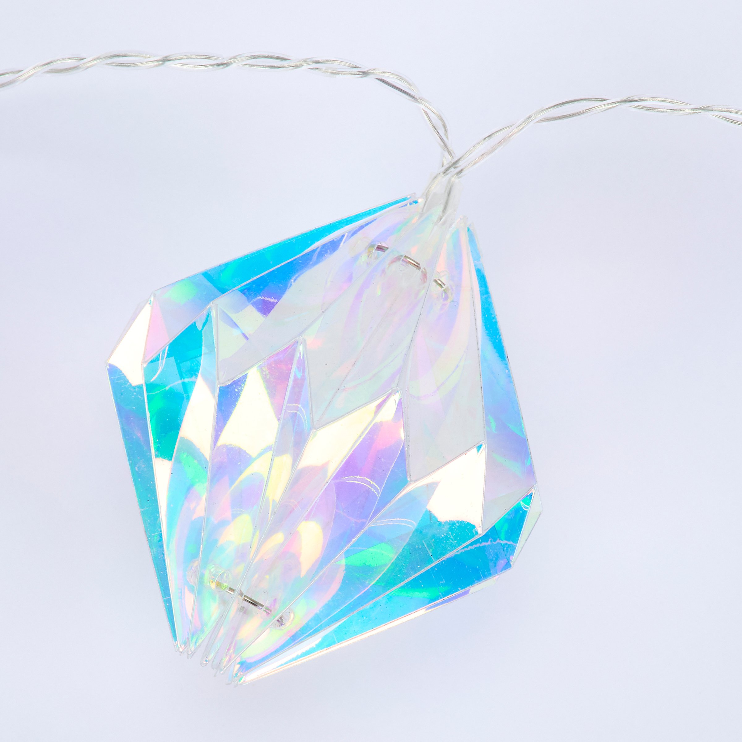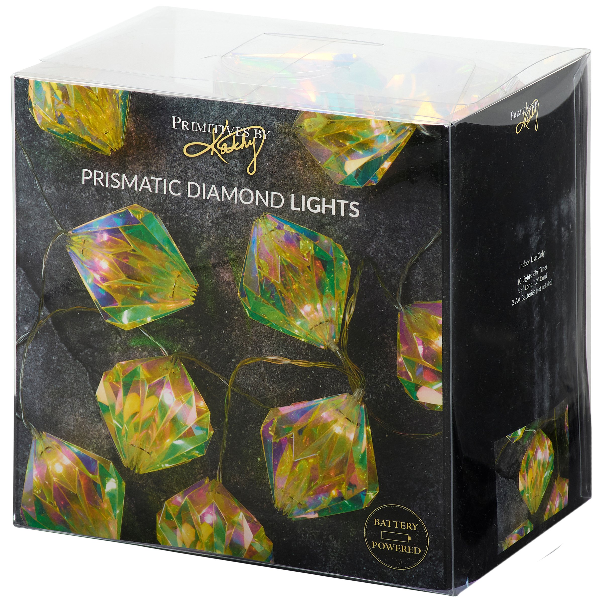 A set of string lights from our Christmas Collection featuring light up prismatic diamonds made with iridescent plastic. This set of iridescent string lights includes 10 lights along a 53 inch wire attached to power source and 12 inch cord. Our Prismatic Diamond string lights feature a convenient 6 hour timer powered by 2 AA batteries (not included). Indoor use only. Seasonal lights are packaged in an acrylic box with insert displaying working lights and product information. A retro Christmas home accent perfect for adding seasonal lighting to any room or Christmas tree.