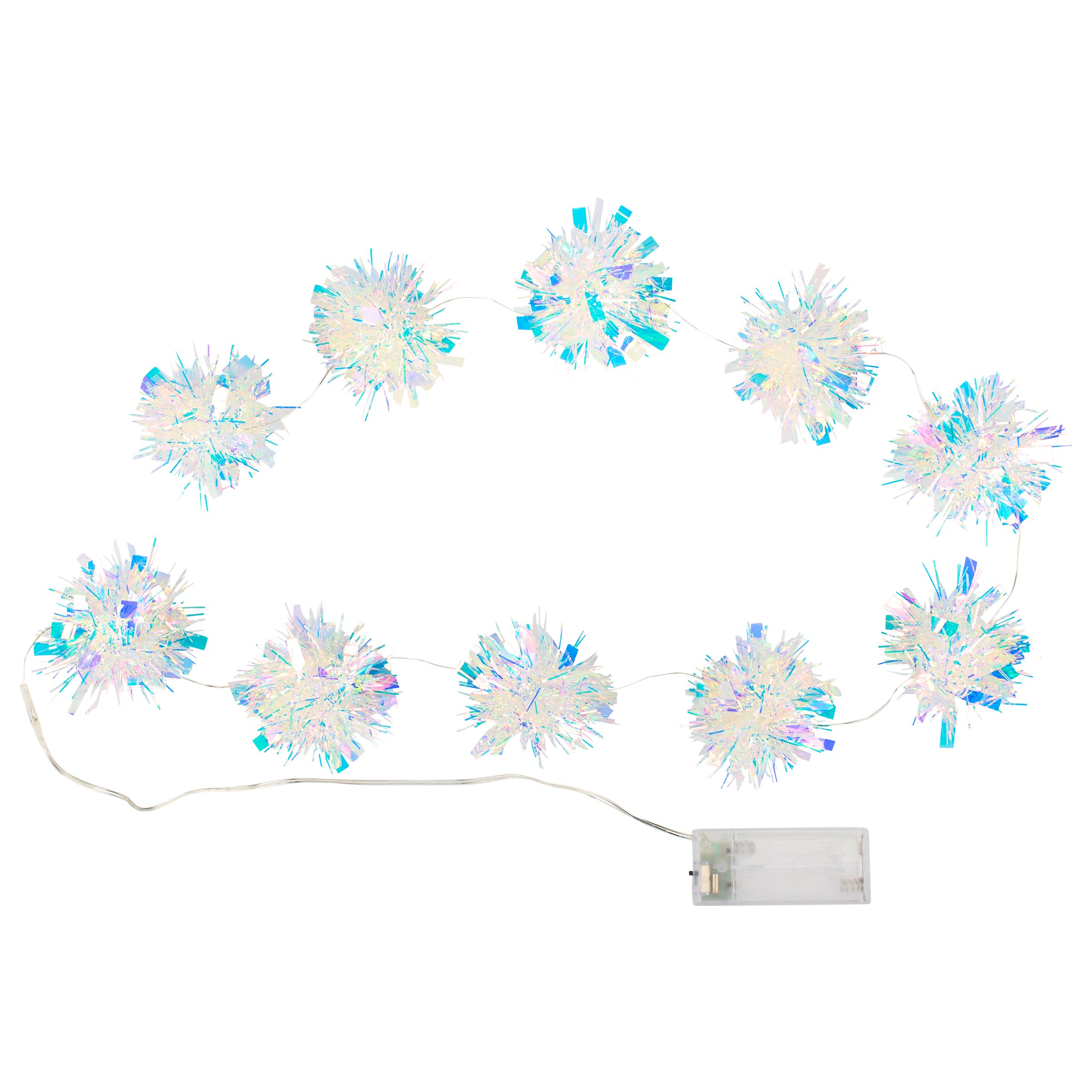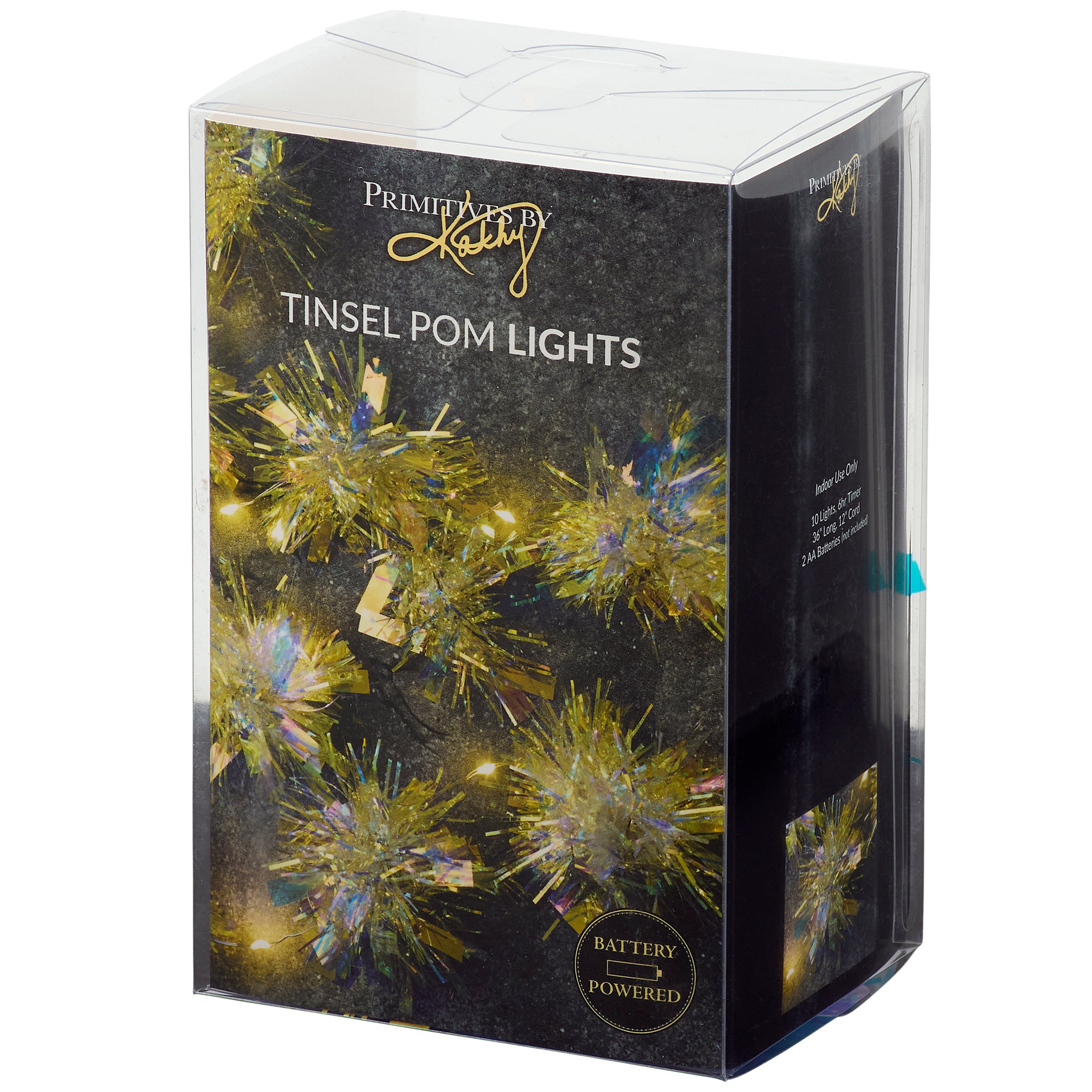 A set of string lights from our Christmas Collection featuring poms made with iridescent tinsel and accented with wire lights. This set of iridescent string lights includes 10 lights along a 60 inch wire attached to power source and 12 inch cord. Our Tinsel Poms string lights feature a convenient 6 hour timer powered by 2 AA batteries (not included). Indoor use only. Seasonal lights are packaged in an acrylic box with insert displaying working lights and product information. A retro Christmas home accent perfect for adding seasonal lighting to any room or Christmas tree.