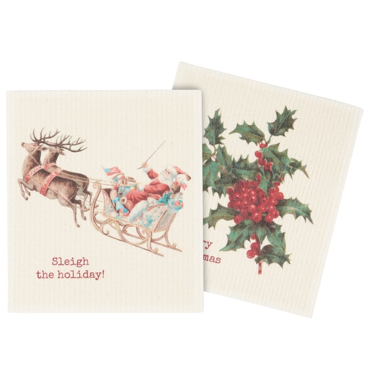Safe to use on all types of surfaces, eco-friendly Swedish Dishcloths dry quickly and are antibacterial for more hygienic cleaning with reduced waste. This set of two Swedish Dishcloths from our Christmas Collection features vintage holiday designs with coordinating puns on each. Designs include Santa in his sleigh with "Sleigh The Holiday!" sentiment on one dishcloth and holly berries with a "Berry Christmas" sentiment on the other dishcloth. Our Christmas Swedish Dishcloth set is conveniently machine-washable for easy cleaning. Seasonal dishcloths are attached to header card with hole for easy rack display. A fun set of Christmas-themed reusable dishcloths perfect for replacing dull sponges and paper towels with long-lasting colorful designs.