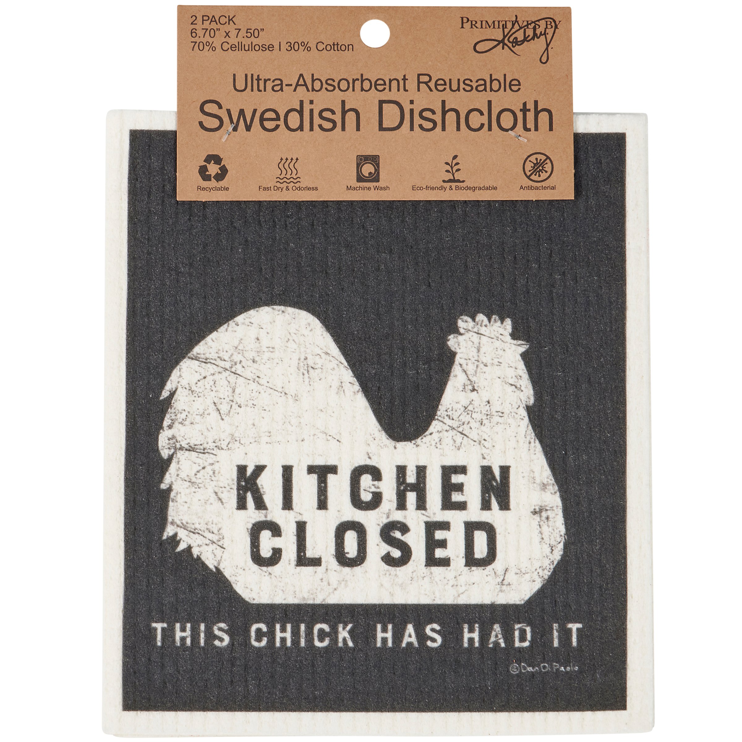 Safe to use on all types of surfaces, eco-friendly Swedish Dishcloths dry quickly and are antibacterial for more hygienic cleaning with reduced waste. This set of two Swedish Dishcloths from our Farmhouse Collection features rustic black and white designs with farm-themed sentiments. Designs include a chicken with a "Kitchen Closed - This Chick Has Had It" sentiment on one dishcloth and chickens above a "Sometimes You Just Gotta Say Cluck It And Walk Away" sentiment on the other dishcloth. Our Kitchen Is Closed Swedish Dishcloth set is machine-washable for convenient cleaning. Dishcloths are attached to header card with hole for easy rack display. An farm-themed set of reusable dishcloths perfect for replacing dull sponges and paper towels with long-lasting colorful designs.
