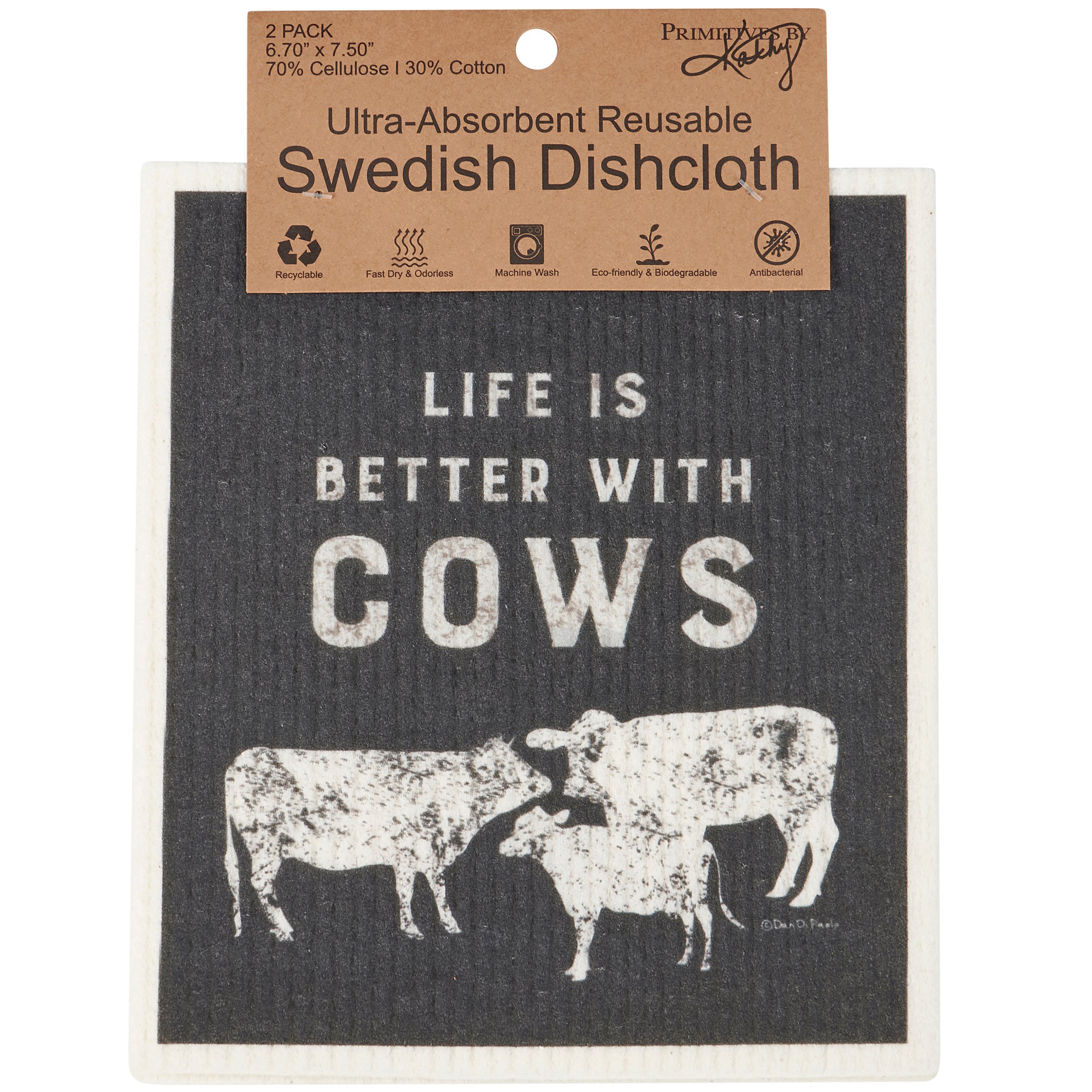 Safe to use on all types of surfaces, eco-friendly Swedish Dishcloths dry quickly and are antibacterial for more hygienic cleaning with reduced waste. This set of two Swedish Dishcloths from our Farmhouse Collection features rustic black and white designs with farm-themed sentiments. Designs include cows under a "Life Is Better With Cows" sentiment on one dishcloth and cow above a "Home Is Where The Herd Is" sentiment on the other dishcloth. Our Better With Cows Swedish Dishcloth set is machine-washable for convenient cleaning. Dishcloths are attached to header card with hole for easy rack display. An farm-themed set of reusable dishcloths perfect for replacing dull sponges and paper towels with long-lasting colorful designs.