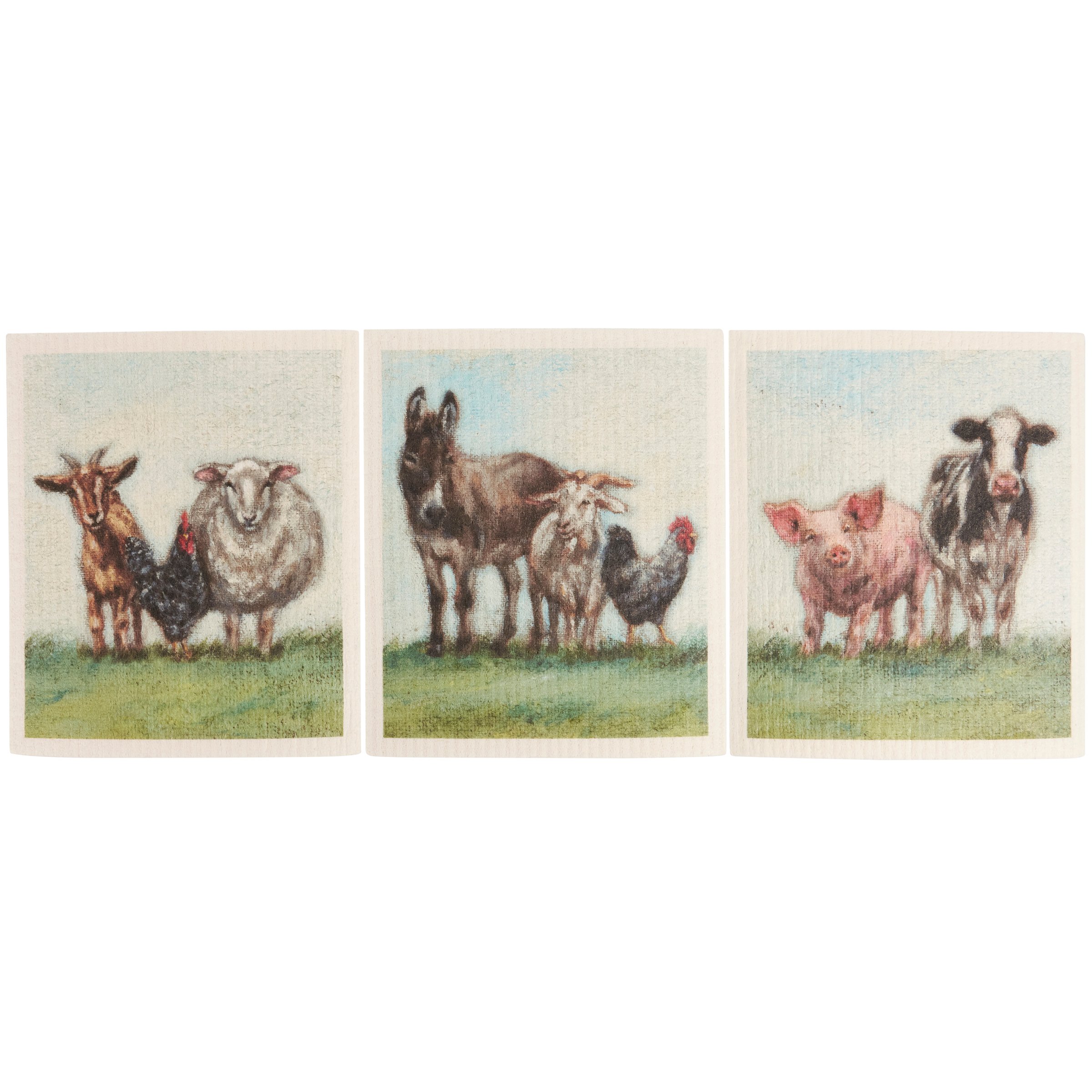 Safe to use on all types of surfaces, eco-friendly Swedish Dishcloths dry quickly and are antibacterial for more hygienic cleaning with reduced waste. This set of 3 Swedish Dishcloths from our Farmhouse Collection features charming scenes of farm animals together in a field. Farm animals designs are replicated from original artwork painted onto burlap canvas, giving the art a unique depth and texture. Our Farm Family Swedish cloth set is ultra-absorbent and conveniently machine-washable for easy cleaning and reuse. Dishcloths are attached to header card with hole for easy rack display. A rustic farm-themed set of reusable dishcloths perfect for replacing dull sponges and paper towels with long-lasting colorful designs.