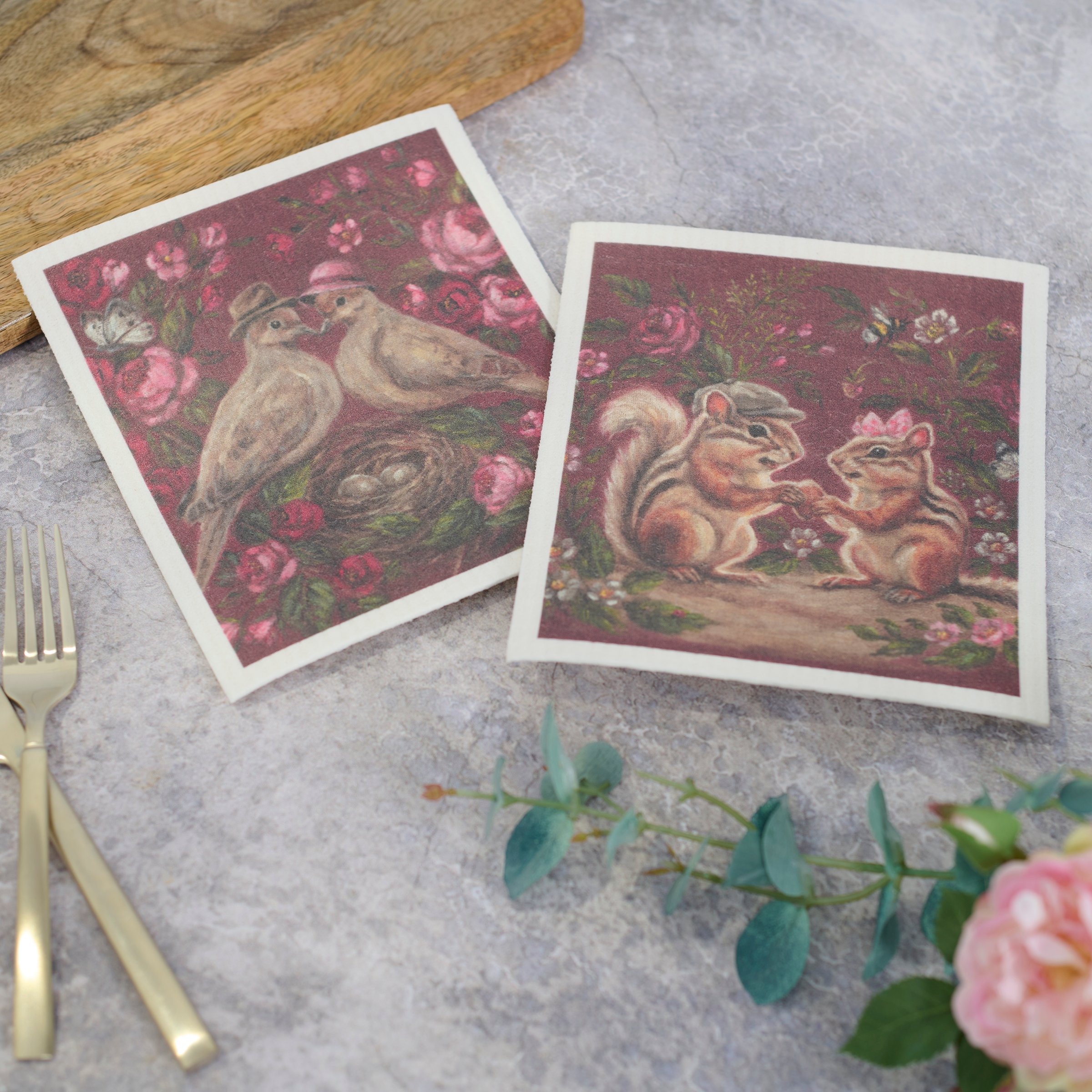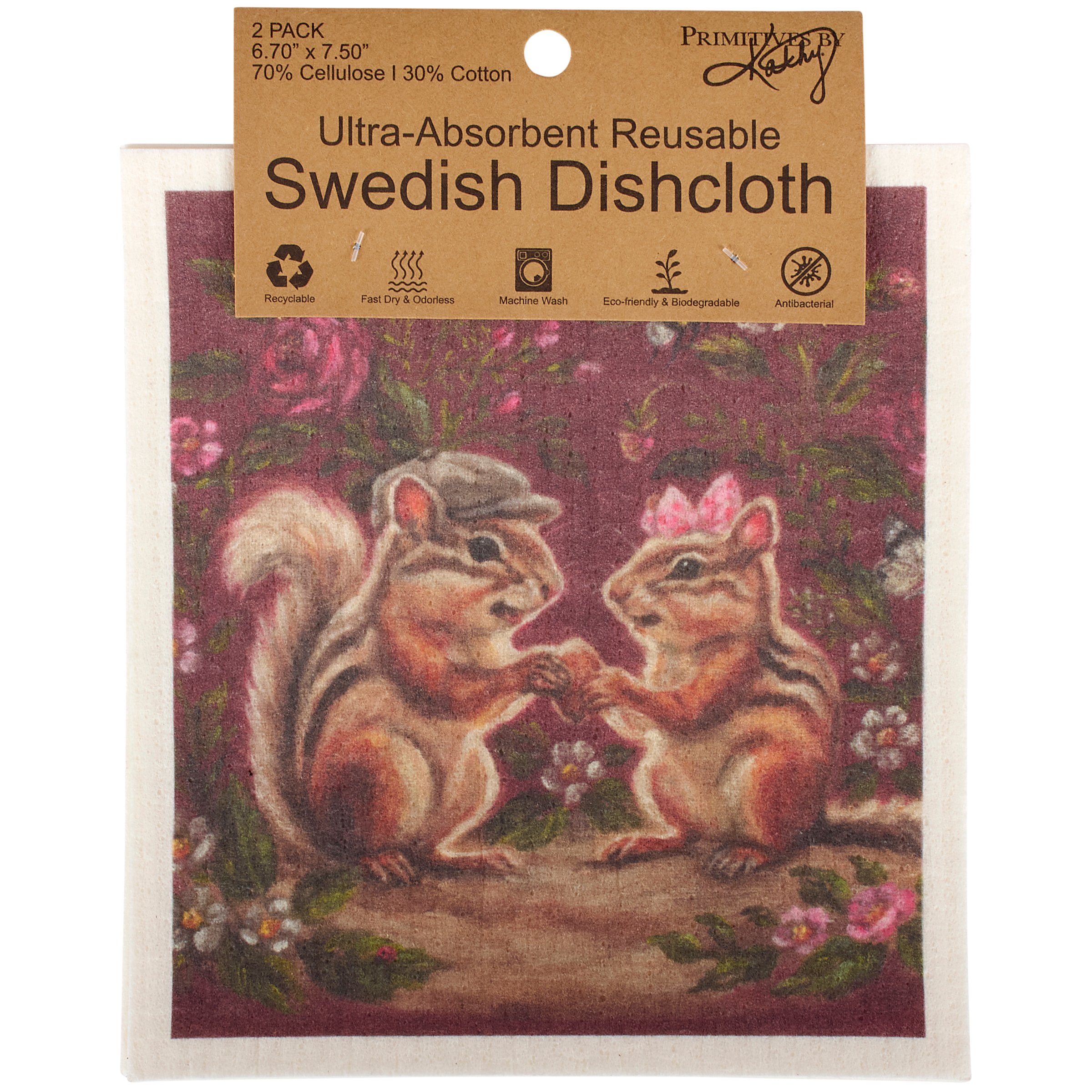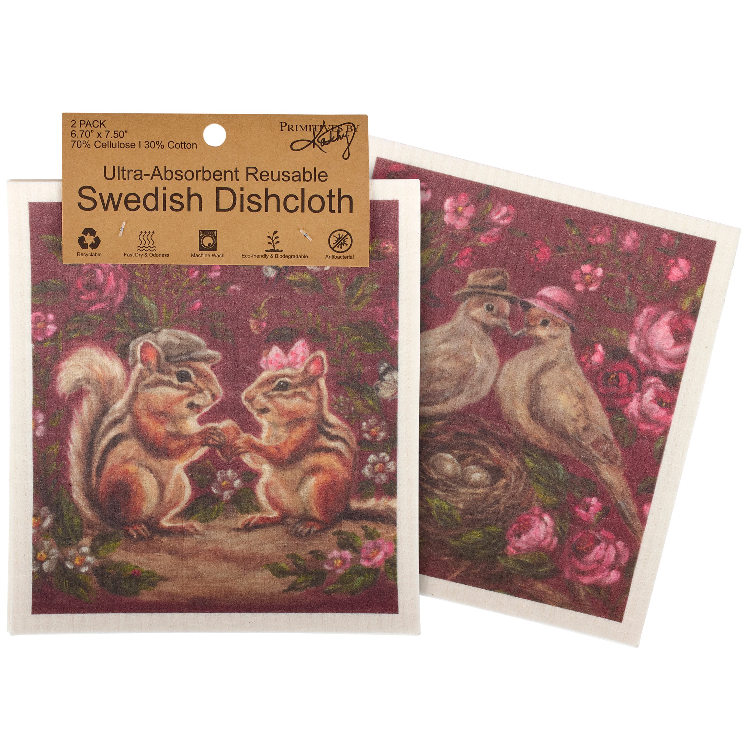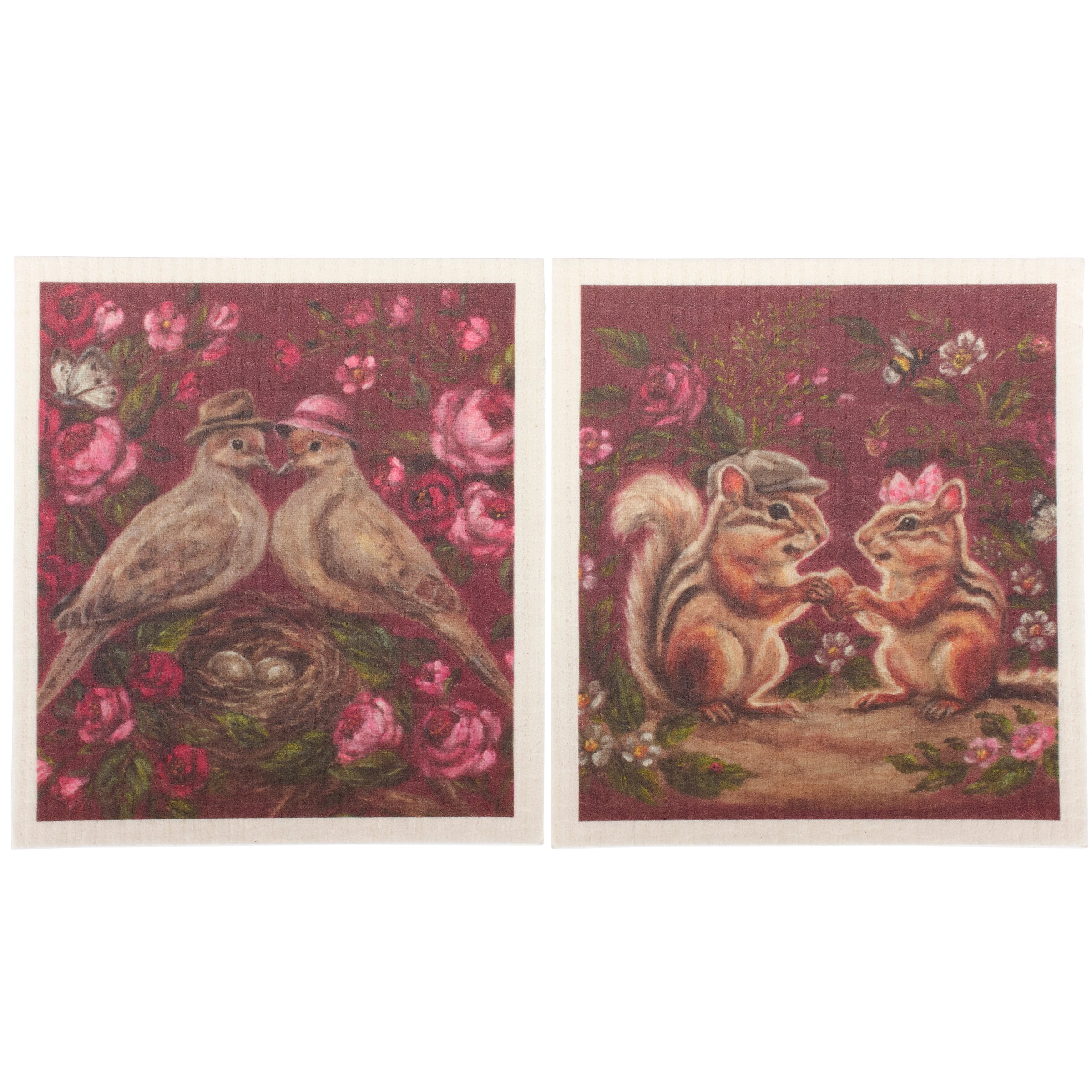 Safe to use on all types of surfaces, eco-friendly Swedish Dishcloths dry quickly and are antibacterial for more hygienic cleaning with reduced waste. This set of two Swedish Dishcloths from our Valentine's Day Collection features charming scenes of woodland animal couples surrounded by moody florals. Valentine animal designs are replicated from original artwork painted onto burlap canvas, giving the art a unique depth and texture. Our Garden Love Swedish Dishcloth set is machine-washable for convenient cleaning. Seasonal dishcloths are attached to header card with hole for easy rack display. A love-themed set of reusable dishcloths perfect for replacing dull sponges and paper towels with long-lasting colorful designs.
