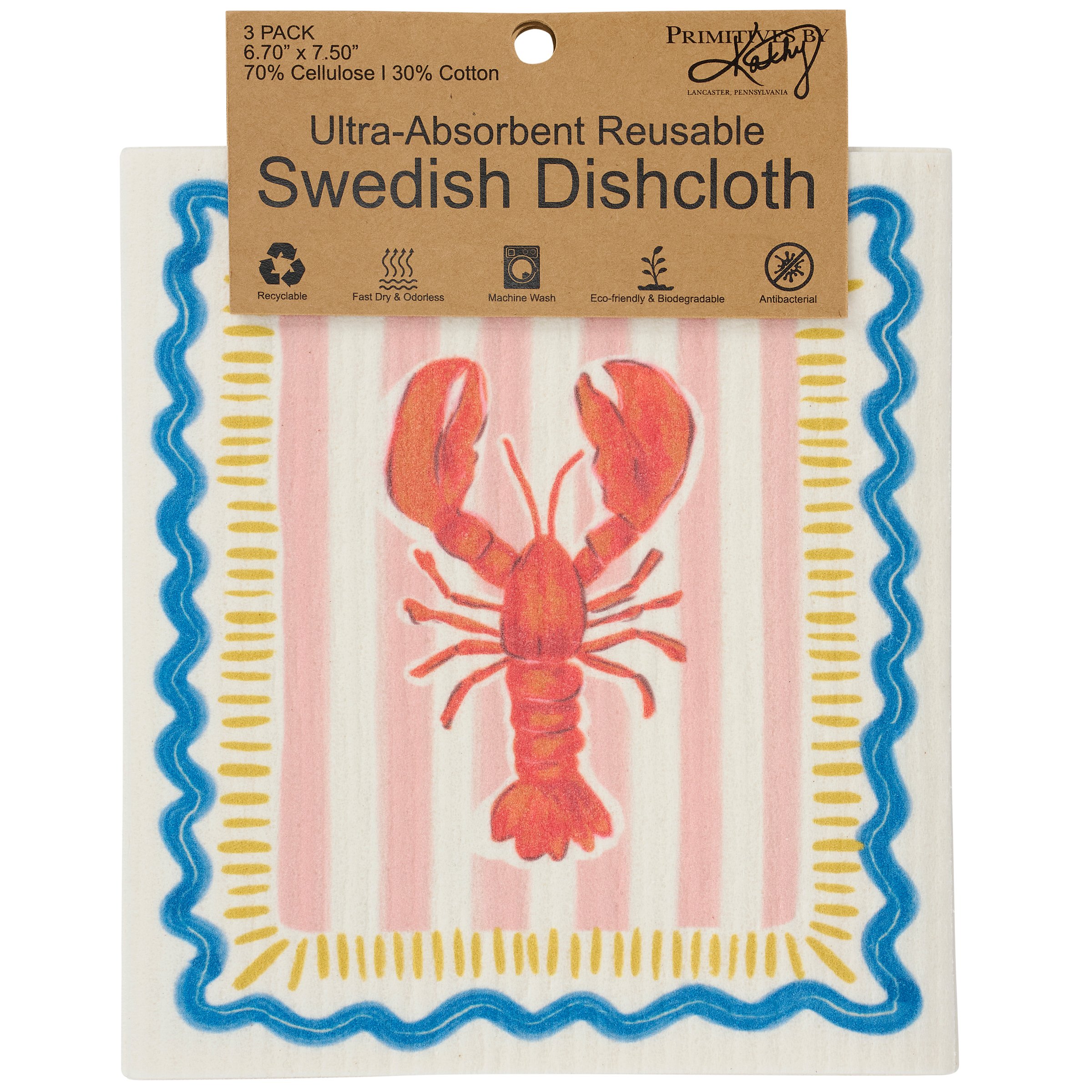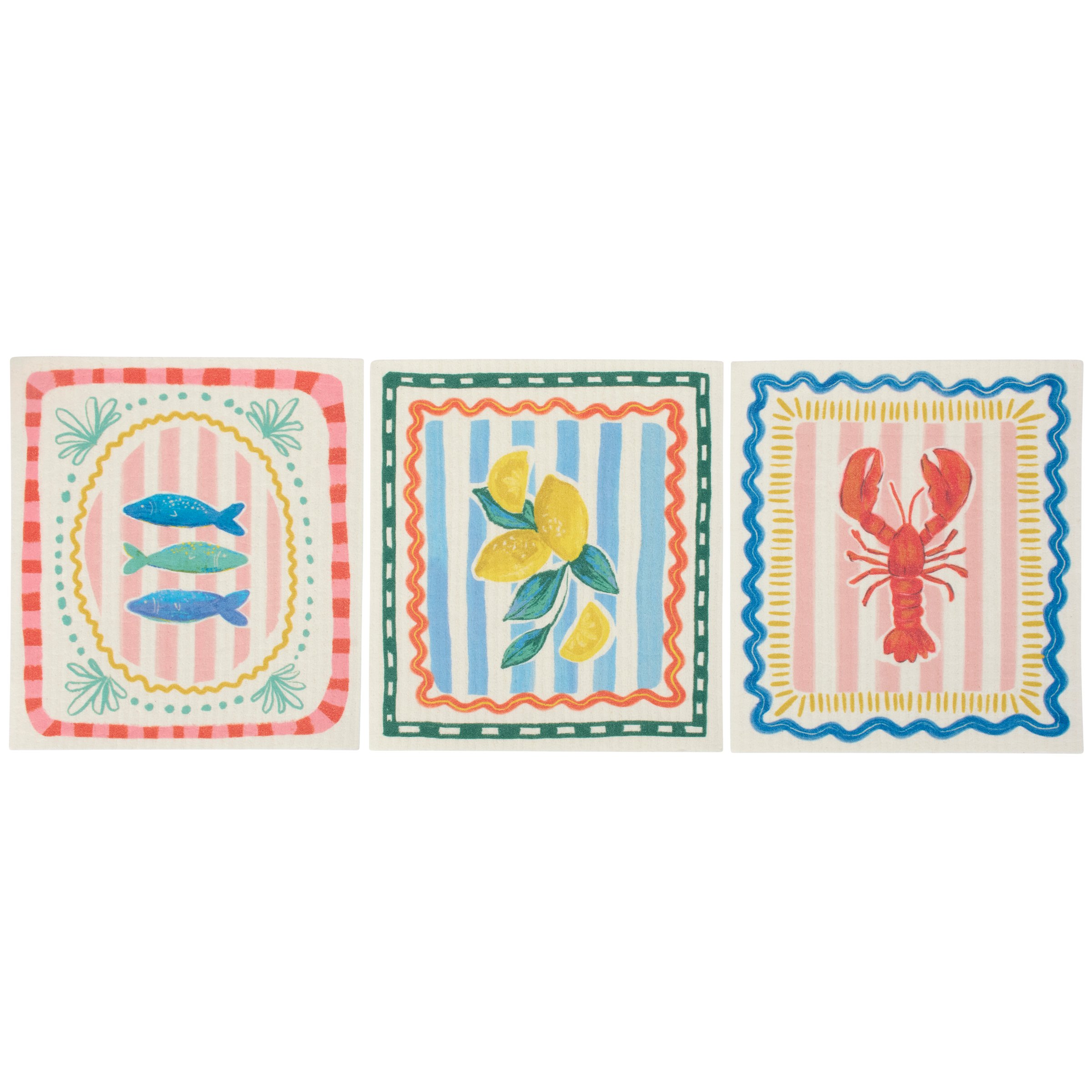 Safe to use on all types of surfaces, eco-friendly Swedish Dishcloths dry quickly and are antibacterial for more hygienic cleaning with reduced waste. This set of 3 Swedish Dishcloths from our Beach Collection features colorful seafood themed designs inspired by Italian coastal style. Coastal designs are replicated from original hand painted watercolor art. Our Italian Coastal Swedish cloth set is ultra-absorbent and conveniently machine-washable for easy cleaning and reuse. Dishcloths are attached to header card with hole for easy rack display. A stylish beach themed set of reusable dishcloths perfect for replacing dull sponges and paper towels with long-lasting colorful designs.