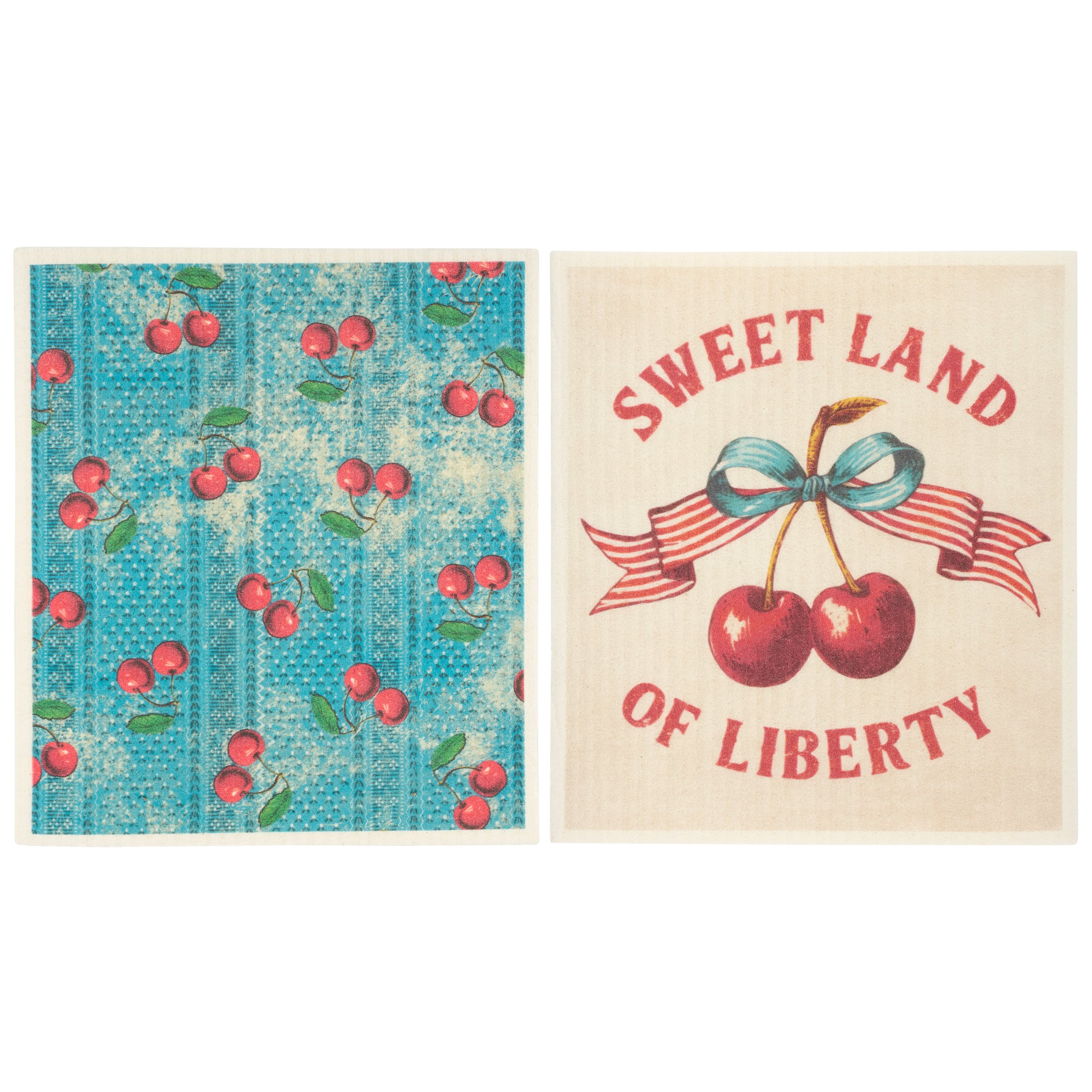Safe to use on all types of surfaces, eco-friendly Swedish Dishcloths dry quickly and are antibacterial for more hygienic cleaning with reduced waste. This set of 2 Swedish Dishcloths from our Patriotic Collection features cherry themed designs and a "Sweet Land Of Liberty" sentiment inspired by vintage Americana style. Our Sweet Land Of Liberty Swedish cloth set is ultra-absorbent and conveniently machine-washable for easy cleaning and reuse. Patriotic dishcloths are attached to header card with hole for easy rack display. A patriotic set of reusable dishcloths perfect for replacing dull sponges and paper towels with long-lasting colorful designs.