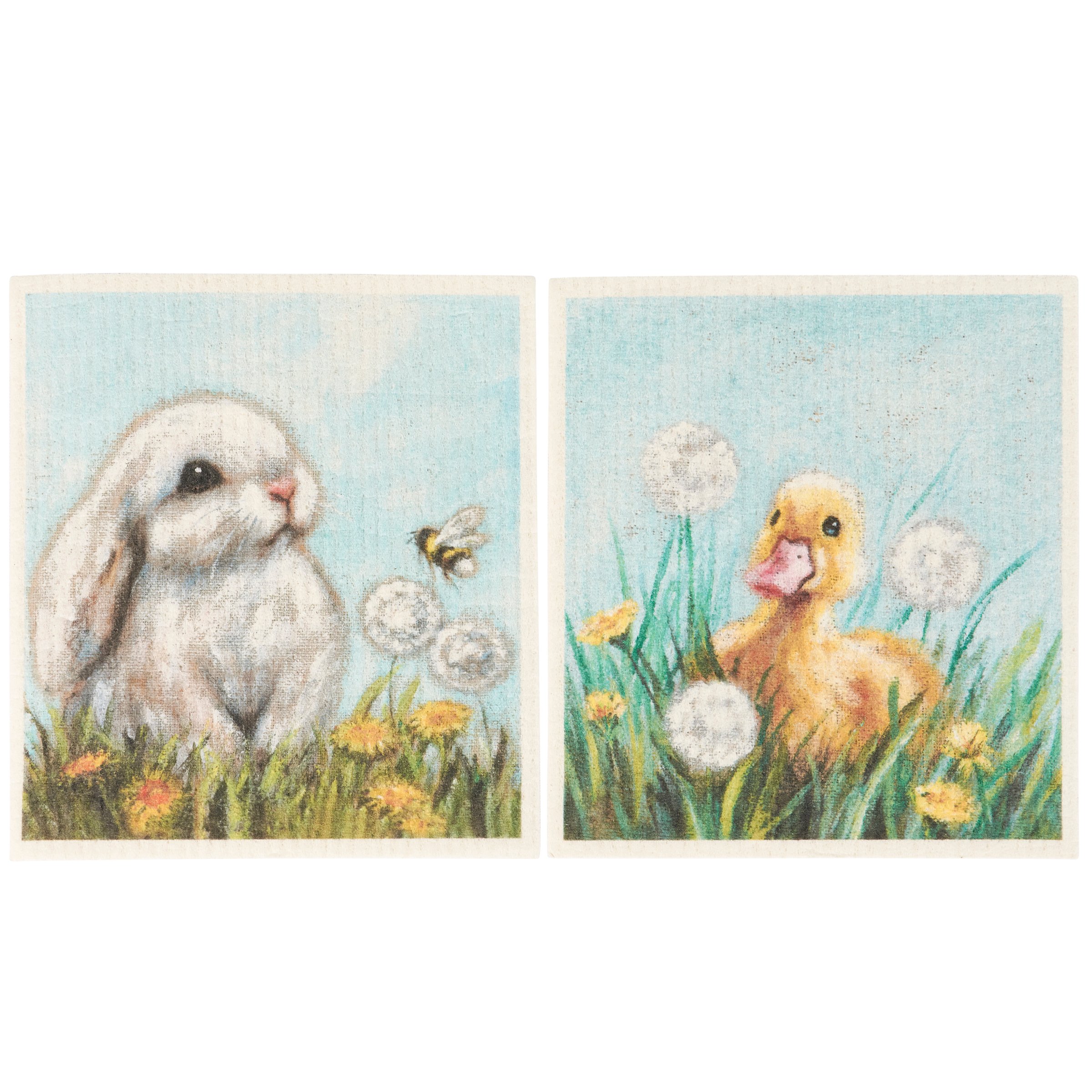 Safe to use on all types of surfaces, eco-friendly Swedish Dishcloths dry quickly and are antibacterial for more hygienic cleaning with reduced waste. This set of 2 Swedish Dishcloths from our Easter & Spring Collection features charming scenes of a white bunny and duckling with spring flowers. Designs are replicated from original artwork painted onto burlap canvas, giving the art a unique depth and texture. Our White Bunny Swedish Dishcloth set is machine-washable for convenient cleaning. Dishcloths are attached to header card with hole for easy rack display. A spring-themed set of reusable dishcloths perfect for replacing dull sponges and paper towels with long-lasting colorful designs.