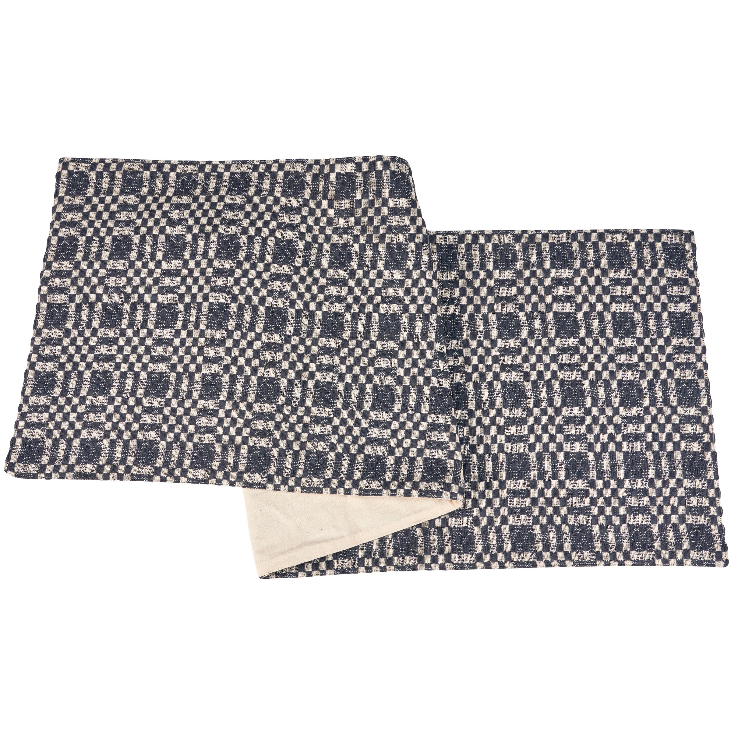 A cotton table runner from our Primitive Collection displaying a checkered pattern in navy and cream. Runner can be used for table settings or as an accent to a home décor display. Our Navy Check table runner is conveniently machine-washable for easy cleaning. Includes 52 inches of length for plenty of coverage. A rustic home accent with a variety of display options.