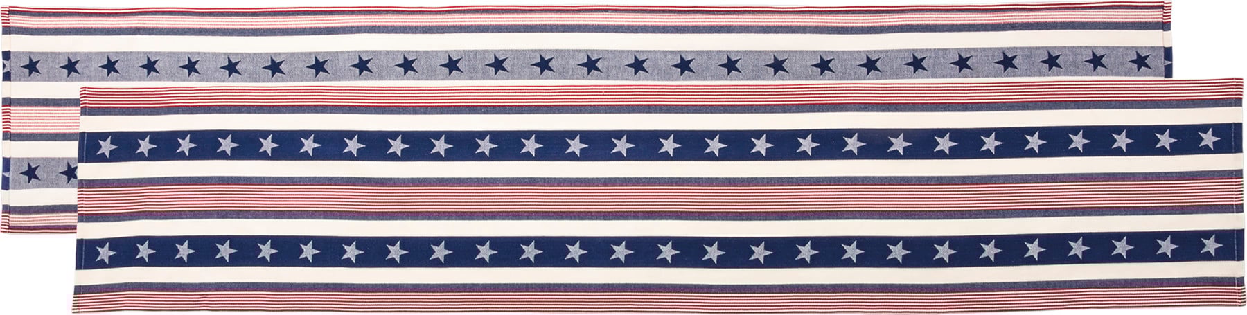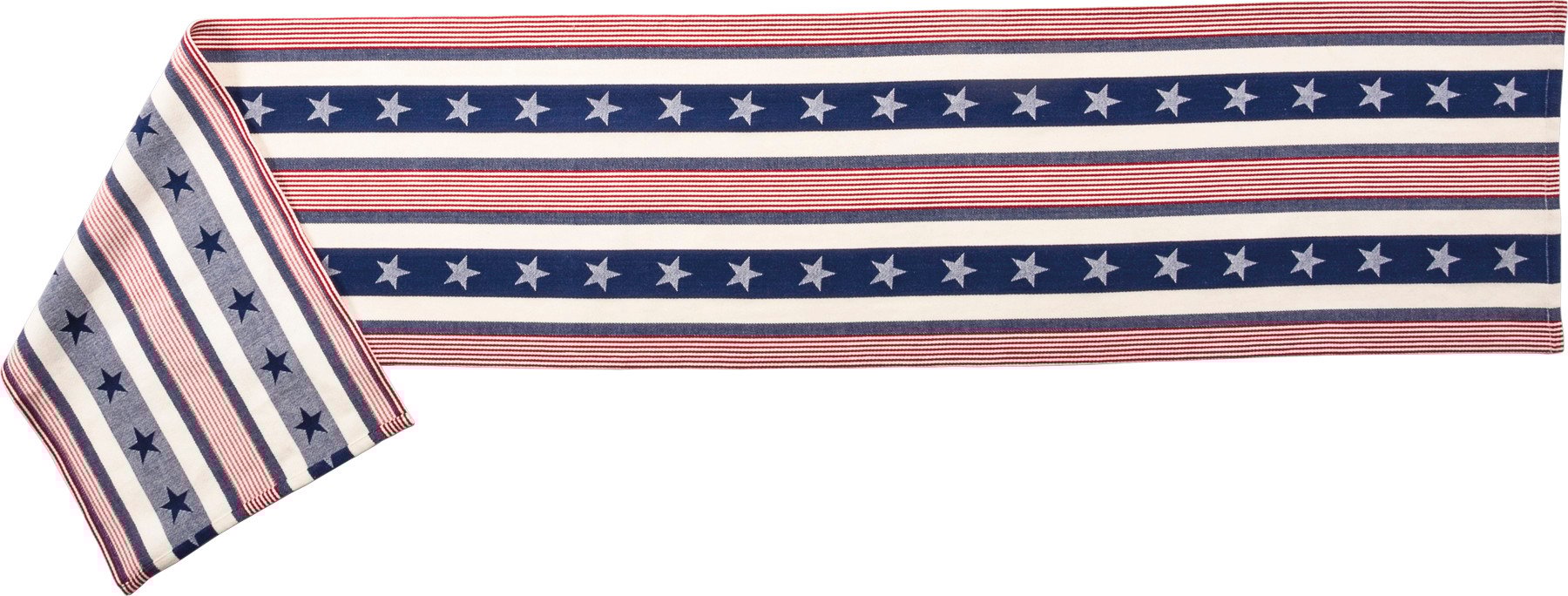 A patriotic-inspired double-sided table Stars & Stripe runner from our Patriotic Collection featuring 100% cotton jacquard woven thread and patriotic stars and stripes designs.