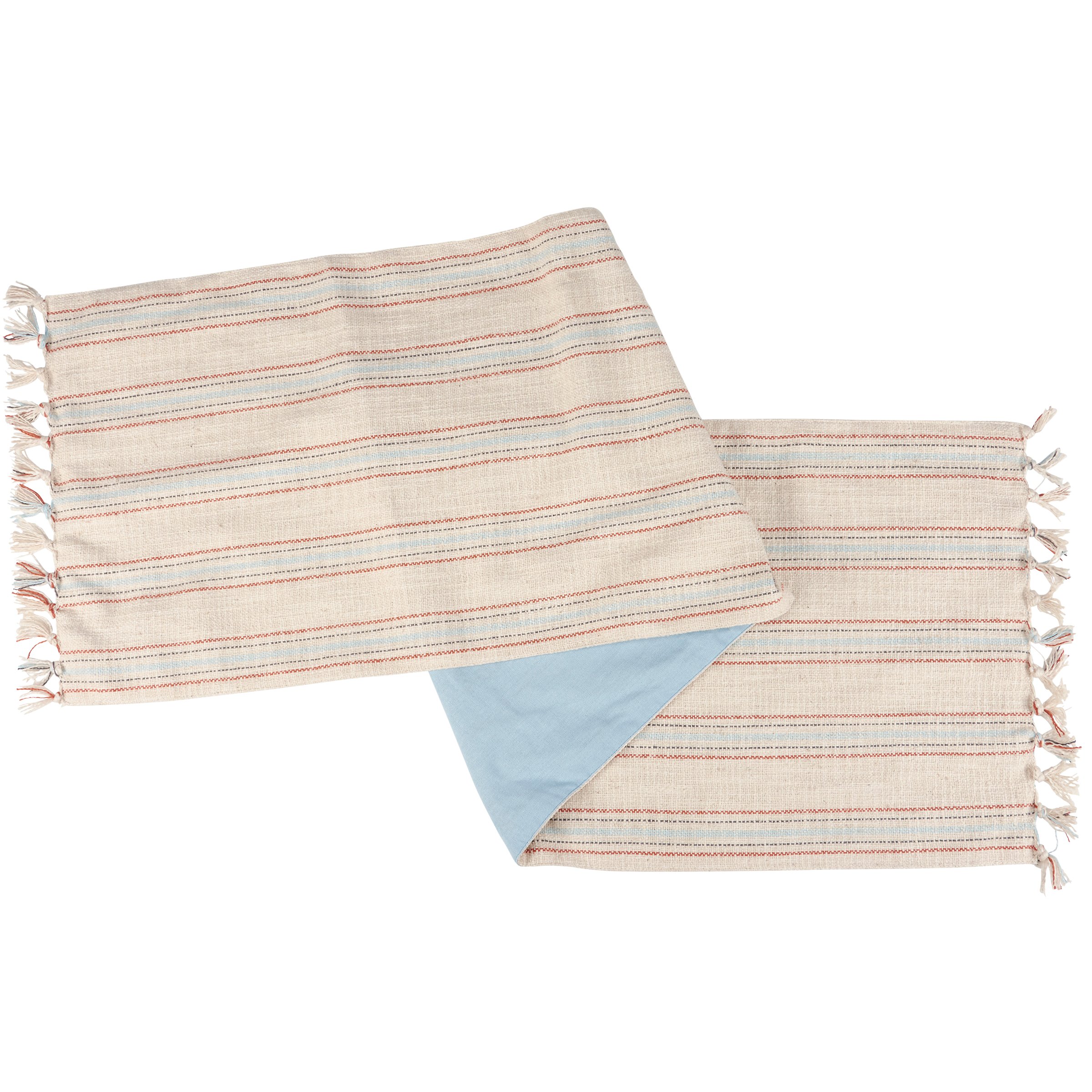 A cotton table runner from our Farmhouse Collection displaying a rustic ticking stripe pattern in red and blue with coordinating blue color on the back and tassels at each end. Runner can be used for table settings or as an accent to a home décor display. Our Ticking Stripe table runner is conveniently machine-washable for easy cleaning. Includes 56 inches of length for plenty of coverage. A rustic home accent with a variety of display options.