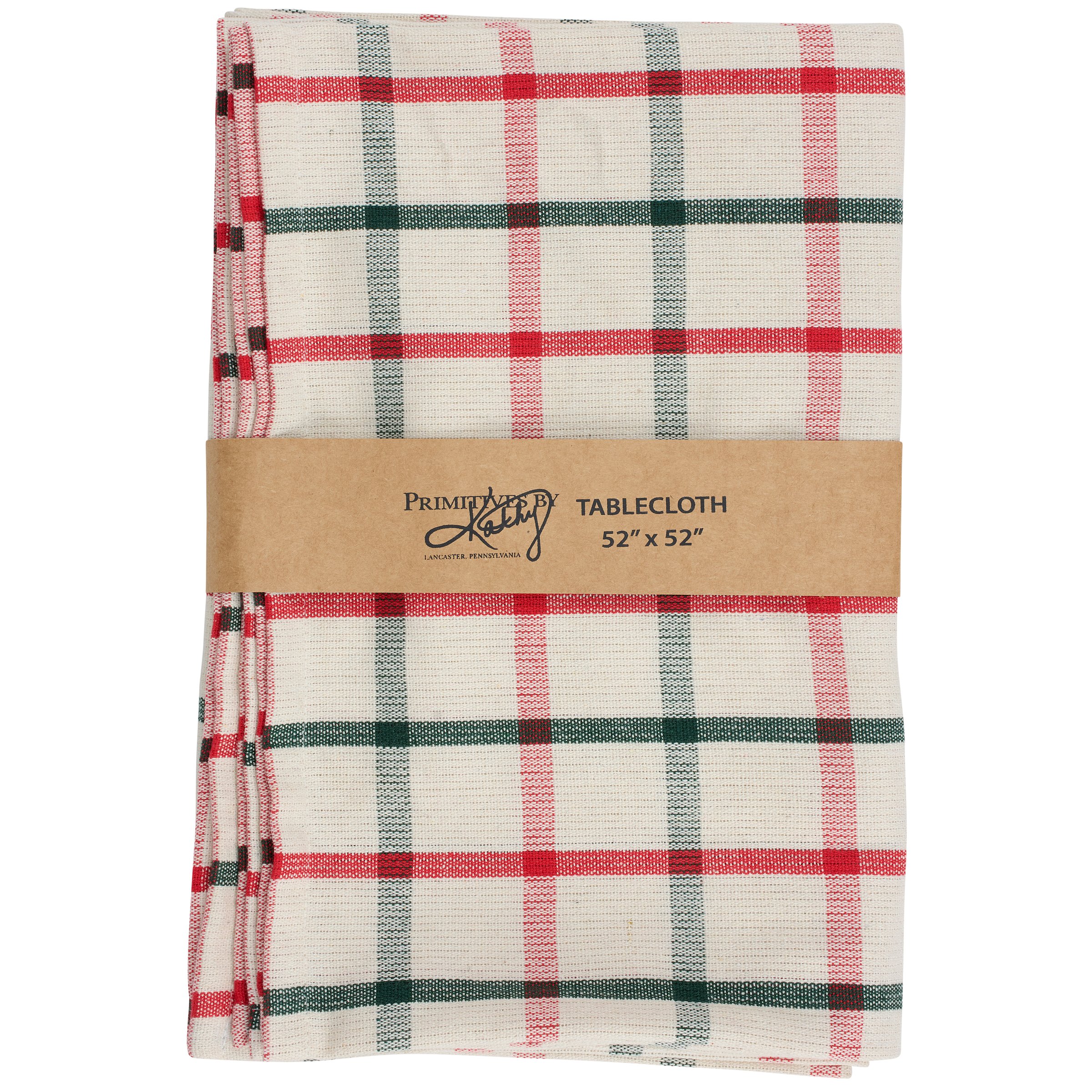 A cotton tablecloth from our Christmas Collection displaying a holiday red and green check pattern. This Christmas tablecloth can be used as table décor or as an accent to a seasonal home décor display and features a size of 52 inches by 52 inches for plenty of coverage. Our Christmas Check tablecloth is conveniently machine-washable for easy cleaning. A rustic Christmas home accent with a variety of display options.