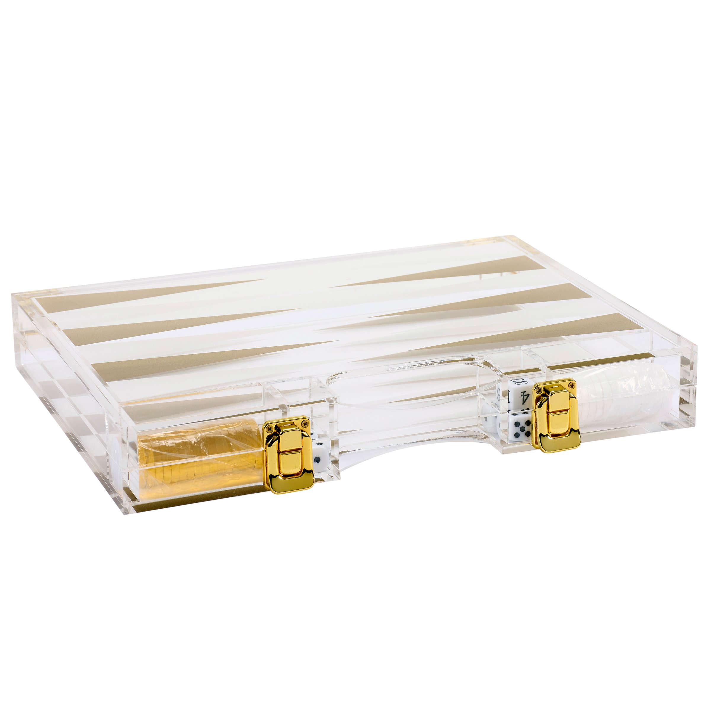 Don't settle for traditional fun and games. This high-quality acrylic version of classic backgammon flaunting a stylish design is ready for play and looks great on a shelf or coffee table in between game nights. Our acrylic Backgammon tabletop game includes 32 playing pieces that neatly fit inside a folding backgammon board with latches to secure closed. The acrylic design also offers the option to customize in any way they like to express themselves.