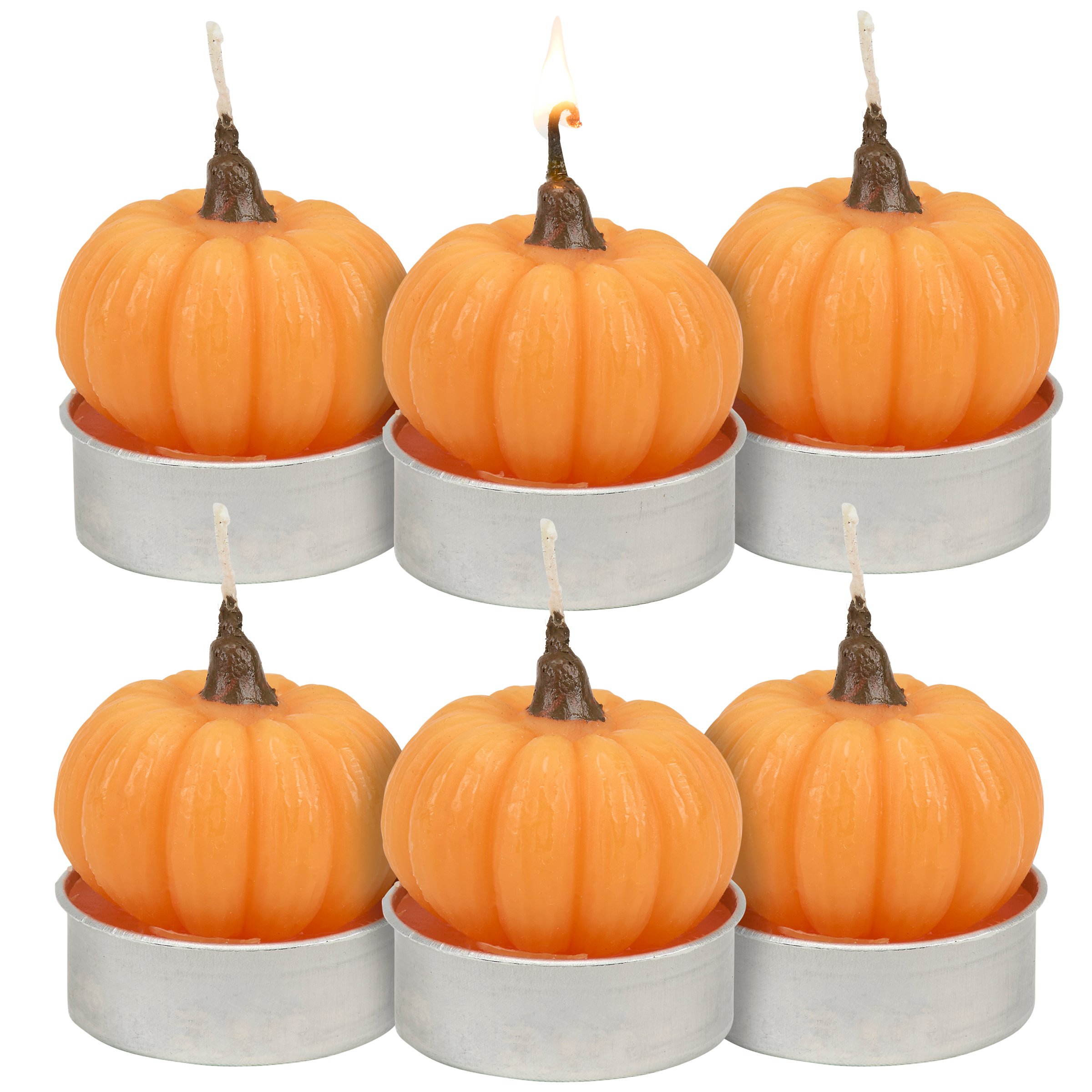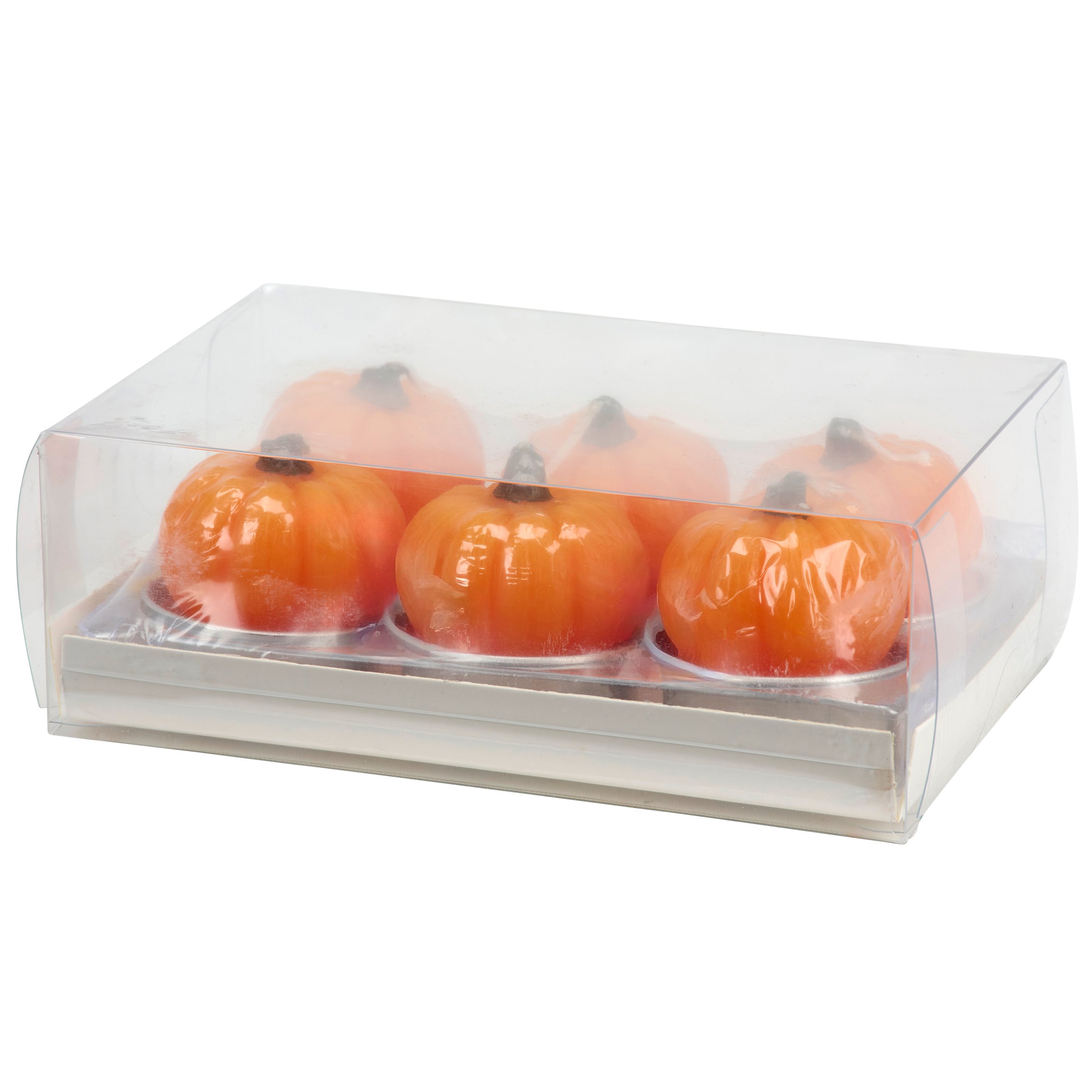 A set of 6 shaped tealight candles from our Fall & Harvest Collection displaying fun orange pumpkin figural designs with colored details. Each fall tealight candle features ready-to-burn cotton wicks and each piece can free stand on flat surface for display. Our Pumpkins tealight candle set is packaged in a clear acrylic box to view candle designs for easy store display. A set of fall home accents perfect for adding fun lighting to any space.