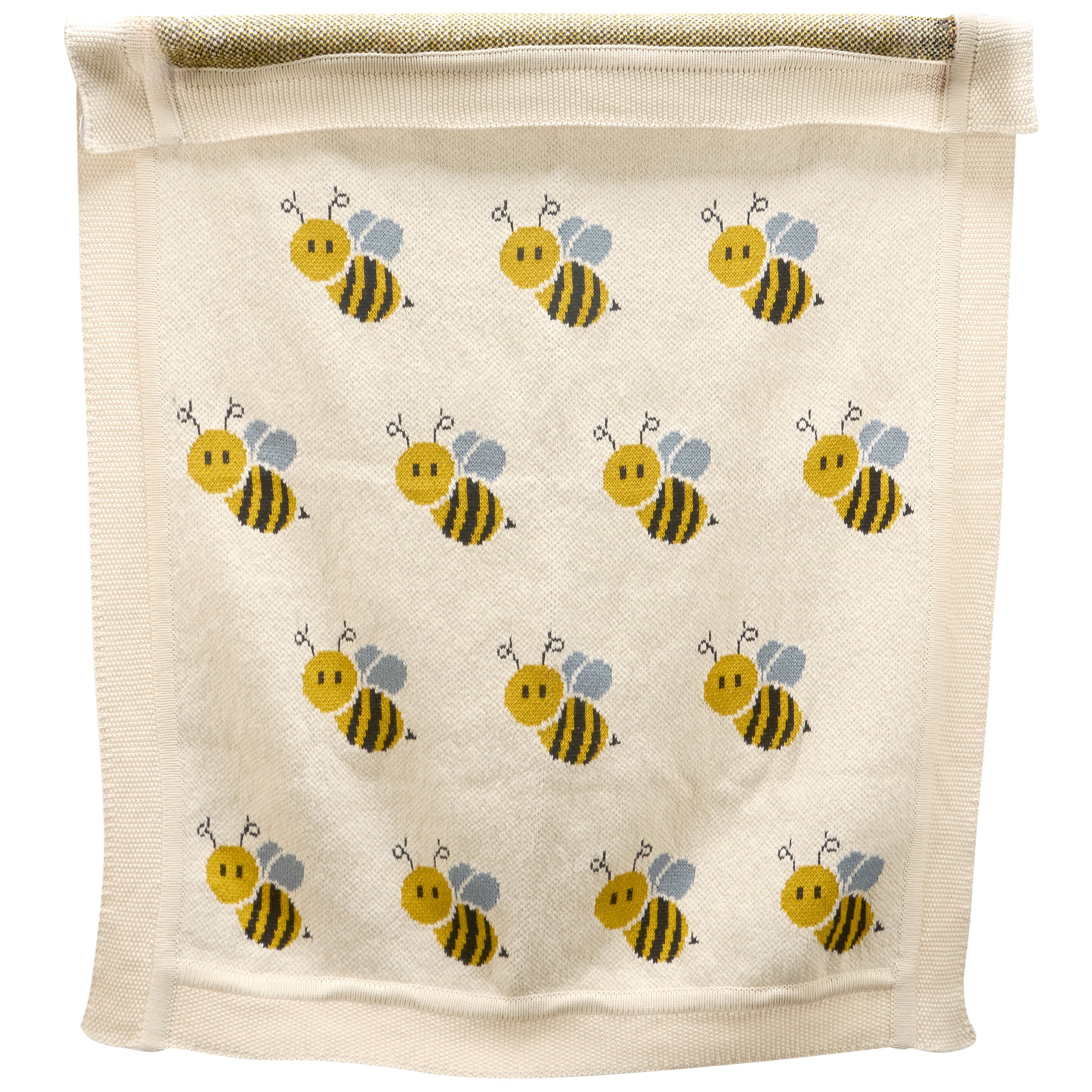 A cotton throw blanket from our Baby & Kids Collection displaying a cute pattern of baby bees woven into the blanket. Bee throw blanket measures 32 inches by 40 inches for plenty of coverage to accent furniture or kids to cozy up under the blanket. Our Baby Bee blanket is conveniently machine-washable for easy cleaning. A cute bee-themed home accent perfect for children's room decor.