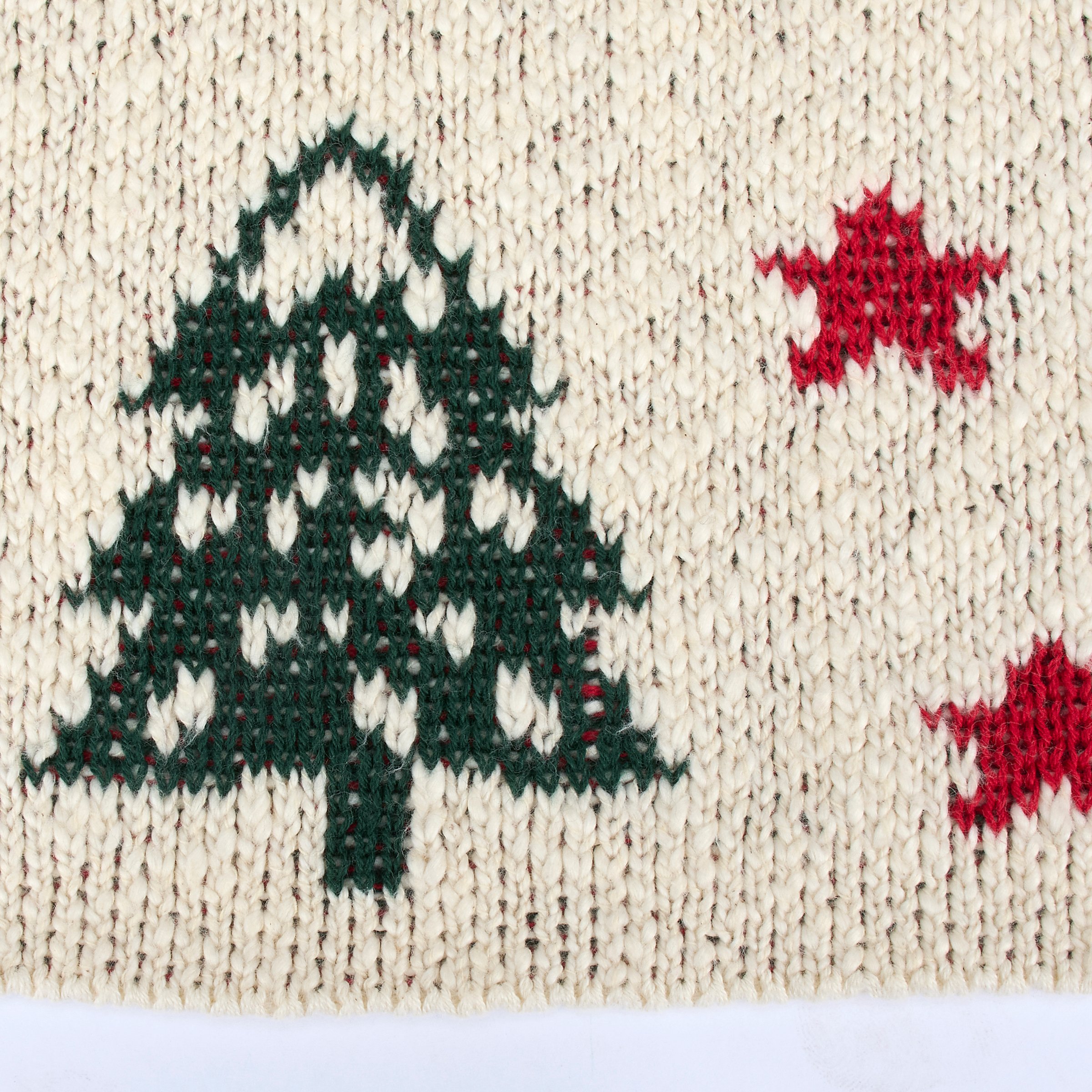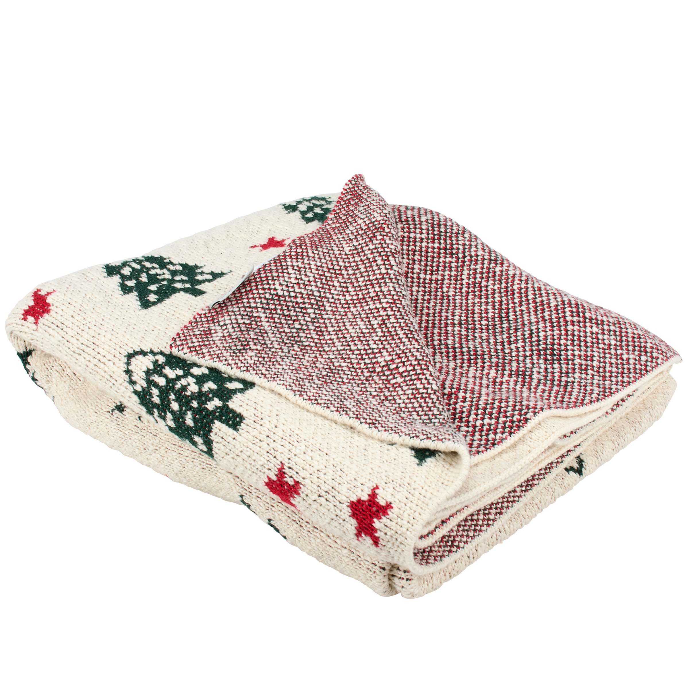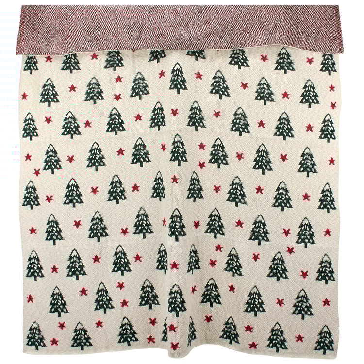 A cotton throw blanket from our Christmas Collection displaying a knit pattern of Christmas trees and stars. Christmas throw blanket measures 50 x 60 inches giving plenty of coverage to accent furniture or to cozy up under the blanket. Our Christmas Tree throw blanket is conveniently machine-washable for easy cleaning. A Christmas home accent perfect for adding seasonal style to any room.