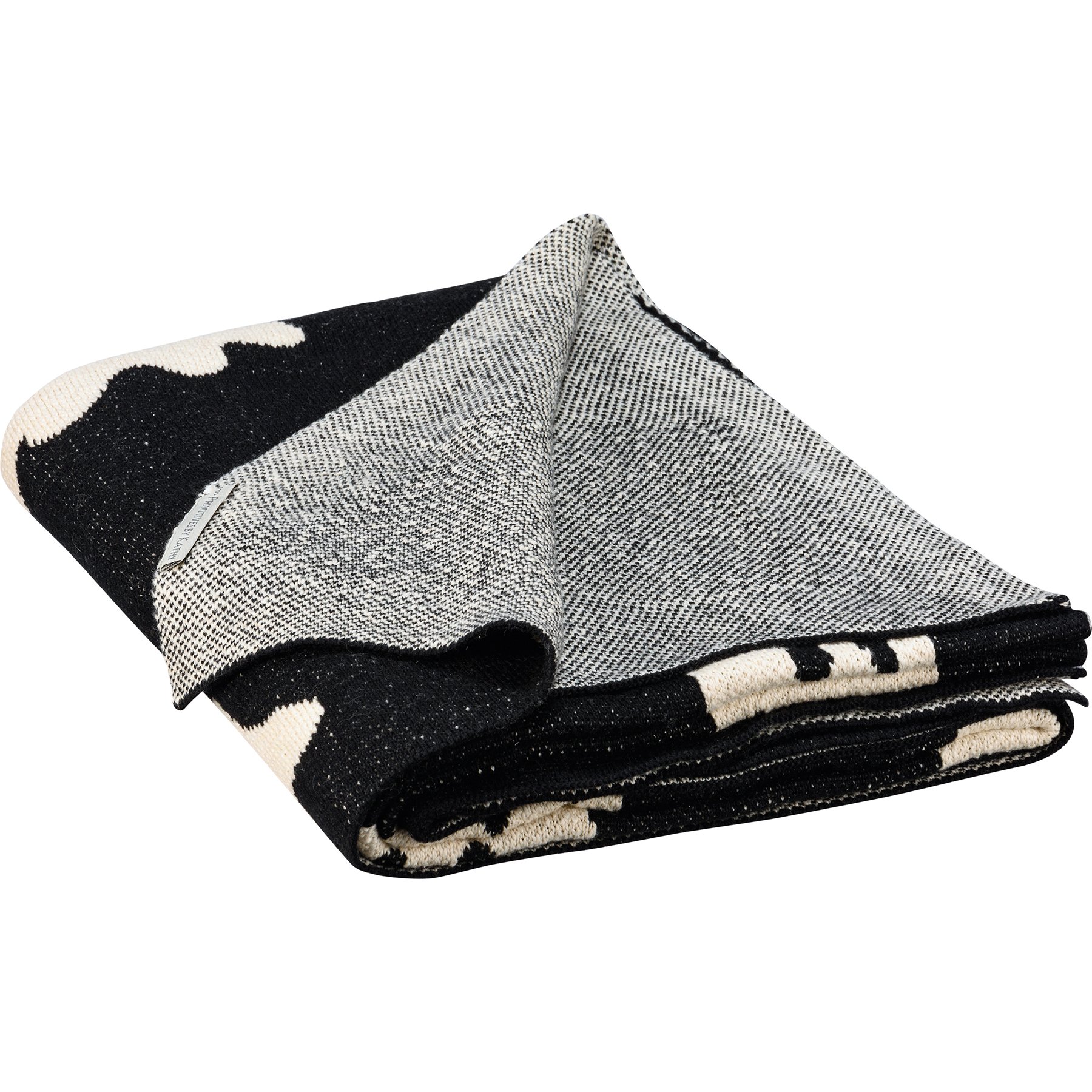 A machine-knitted black cotton throw featuring ghost designs. 50" x 60". Our Ghosts throw is machine-washable.