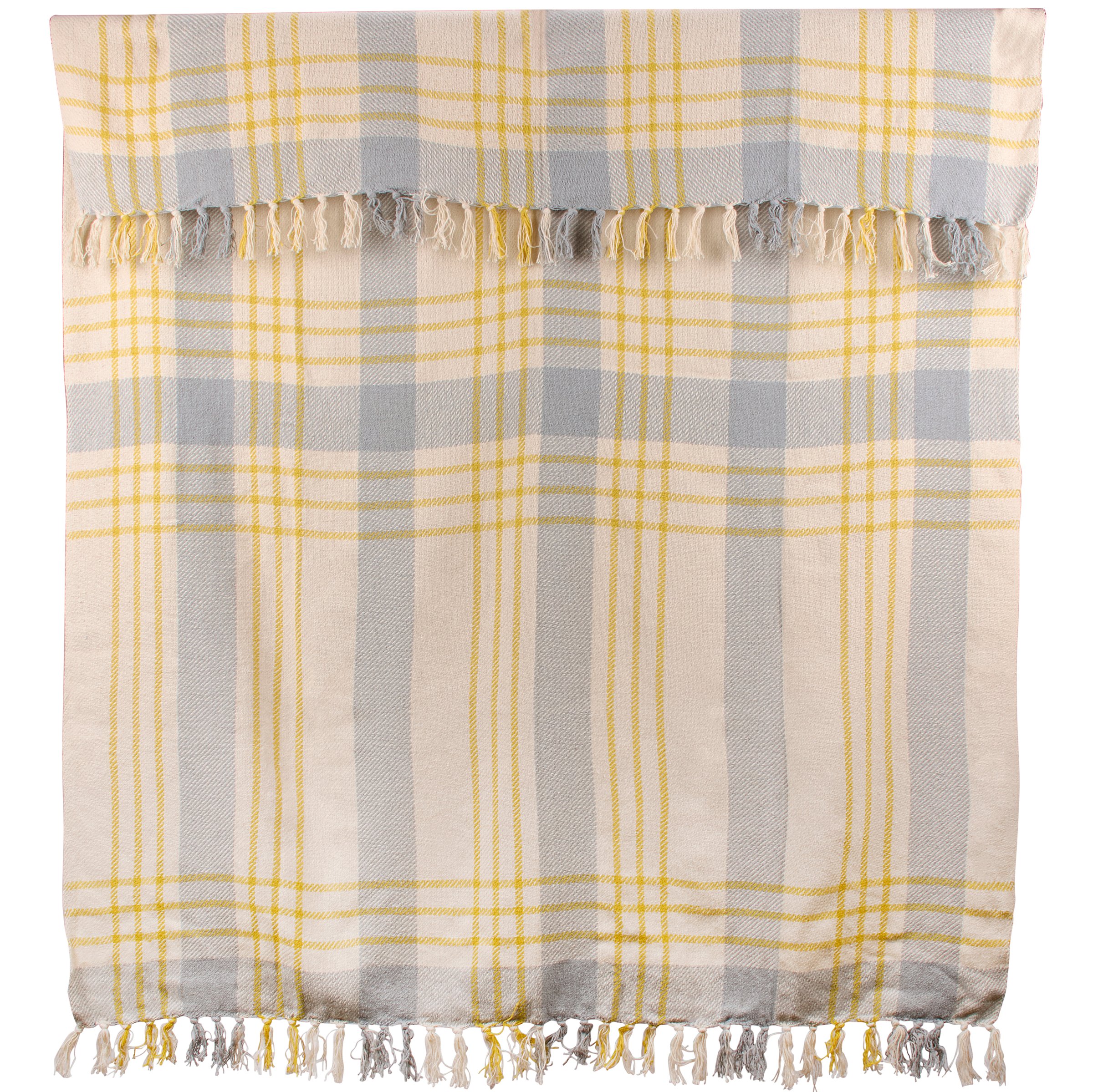 A cotton throw blanket from our Garden Collection displaying a plaid pattern woven throughout in a garden flower inspired blue and gold color palette with tassels on top and bottom edge. This throw blanket measures 50 x 60 inches giving plenty of coverage to accent furniture or to cozy up under the blanket. Our Misty Blue Plaid throw blanket is conveniently machine-washable for easy cleaning. A garden-themed home accent perfect for adding rustic style to any room.