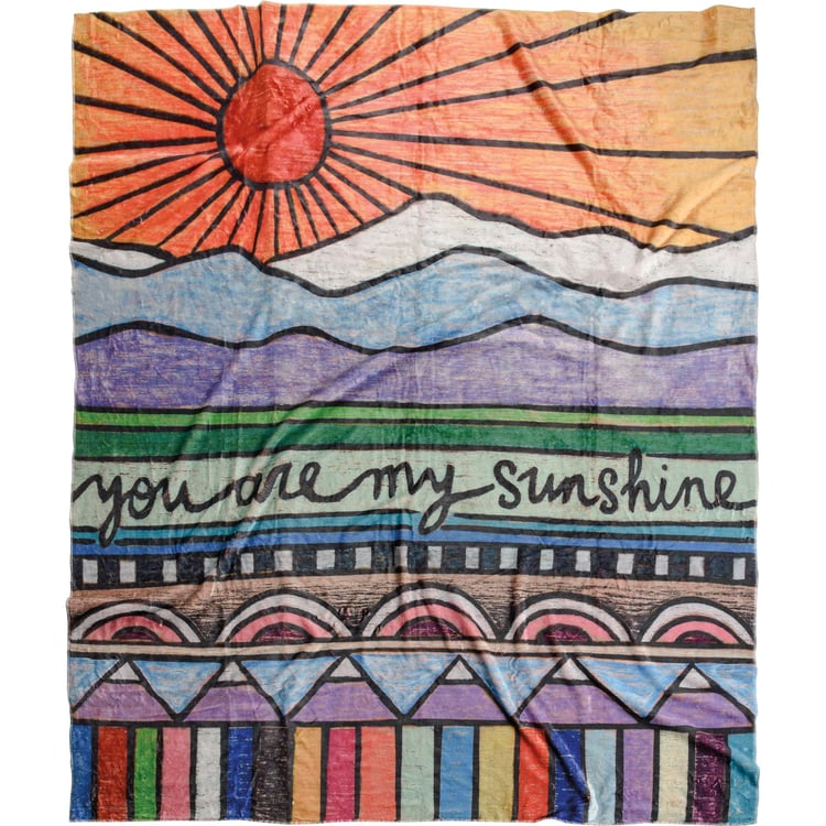 A plush flannel throw featuring vibrant woodburned designs and hand lettered "You Are My Sunshine" sentiment. Blanket comes rolled and wrapped with cotton tape and includes a hangtag. 50" x 60". Reverse side features solid color. Machine-washable.