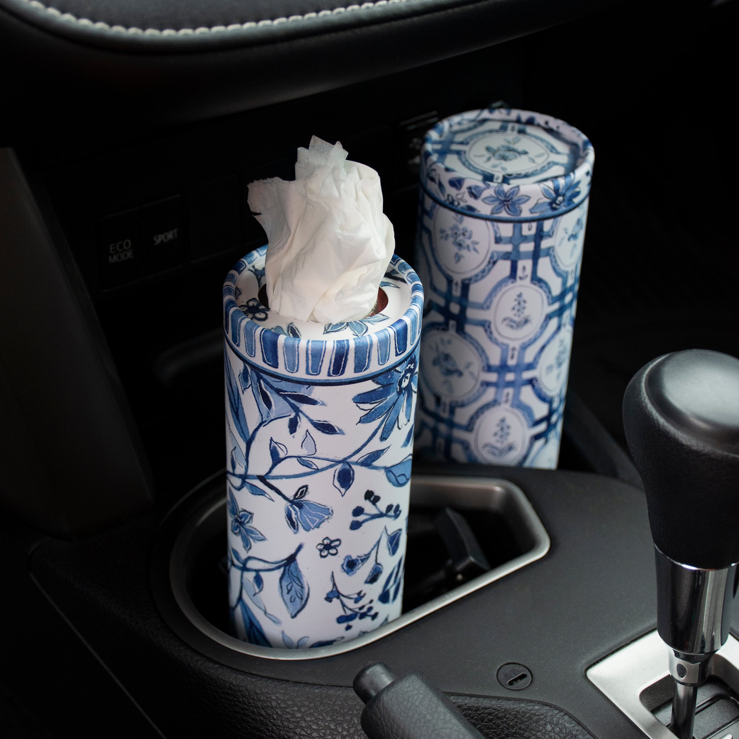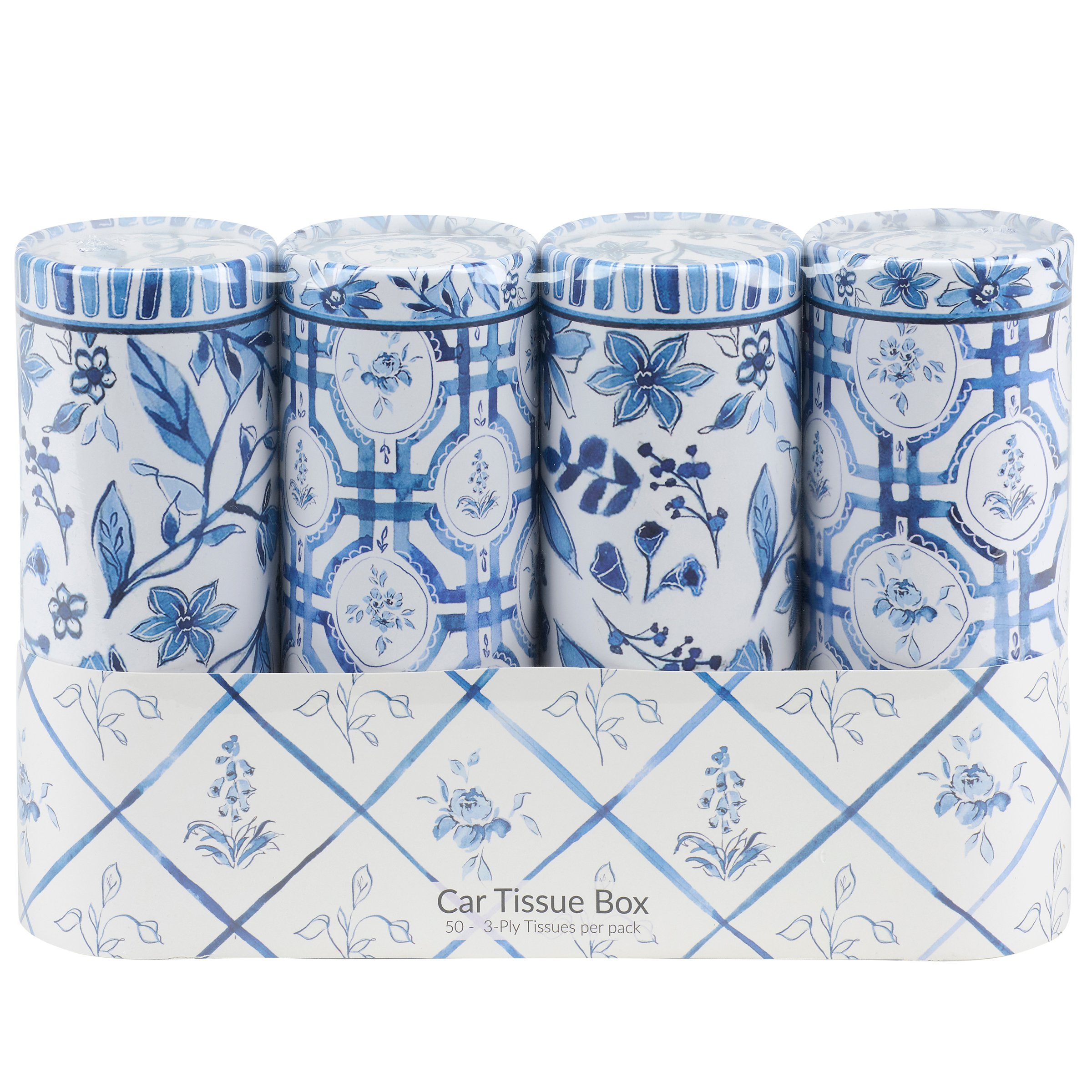 A stylish tissue box set from our Indigo Collection featuring 4 cylindrical tissue boxes displaying full wrap-around designs of various patterns of blue florals on each box. Blue floral designs are replicated from original art hand painted in a unique watercolor style. Tissue boxes feature a size and shape perfect for placing in a car cup holder for stylish on the go function or for easy placement around the house and at work. Our Blue Florals tissue box set includes 50 facial tissues per box for 200 3-ply tissues in total. Car tissue boxes are packaged in a decorative cardboard holder and shrink wrapped to easily view each design on store display.