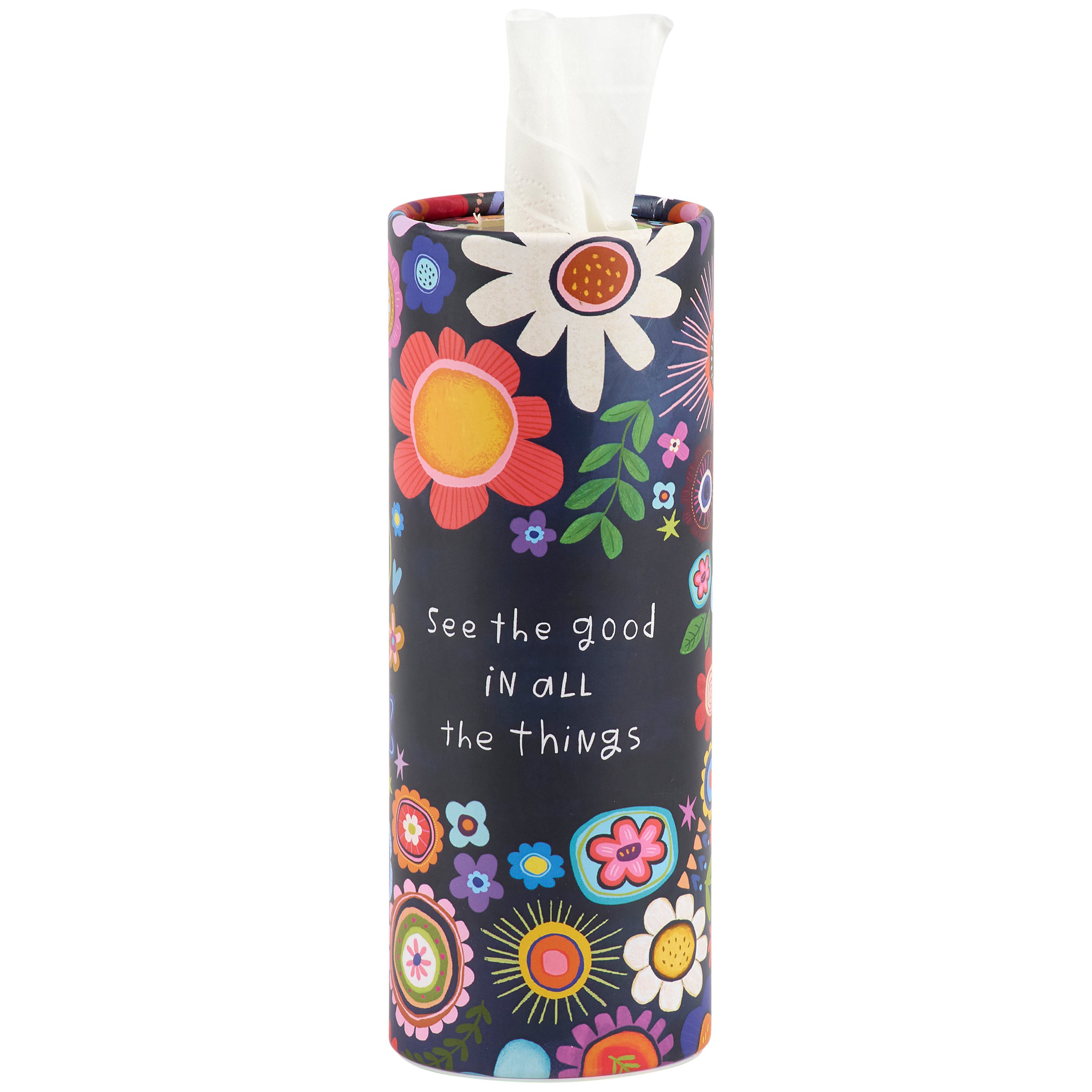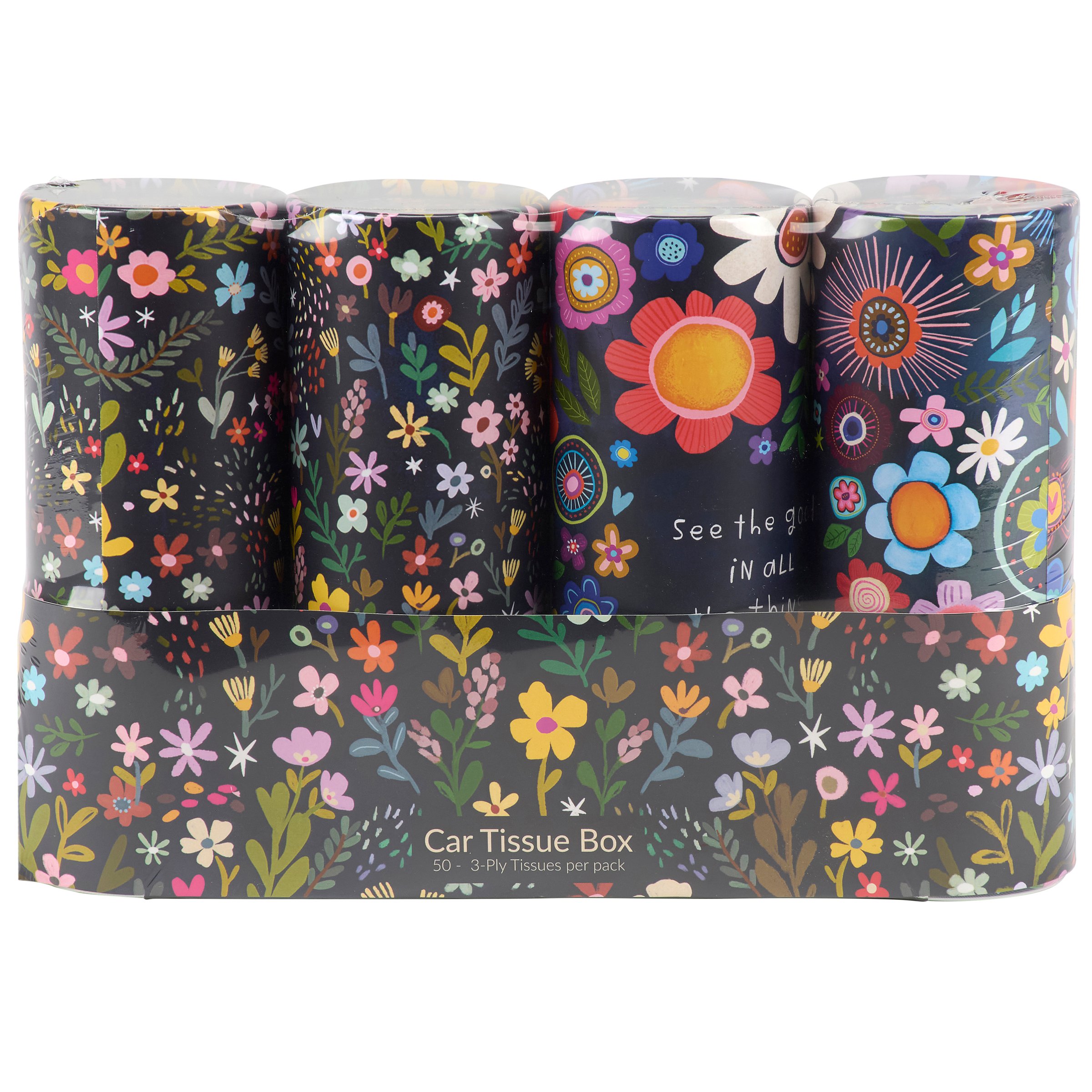 A stylish tissue box set from our Inspiration & Blooms Collection featuring 4 cylindrical tissue boxes displaying full wrap-around designs of colorful florals and inspirational sentiment on each box. Set includes 2 of each design. Inspirational floral designs are replicated from original art hand painted in a unique watercolor style. Tissue boxes feature a size and shape perfect for placing in a car cup holder for stylish on the go function or for easy placement around the house and at work. Our Dark Floral tissue box set includes 50 facial tissues per box for 200 3-ply tissues in total. Car tissue boxes are packaged in a decorative cardboard holder and shrink wrapped to easily view each design on store display.
