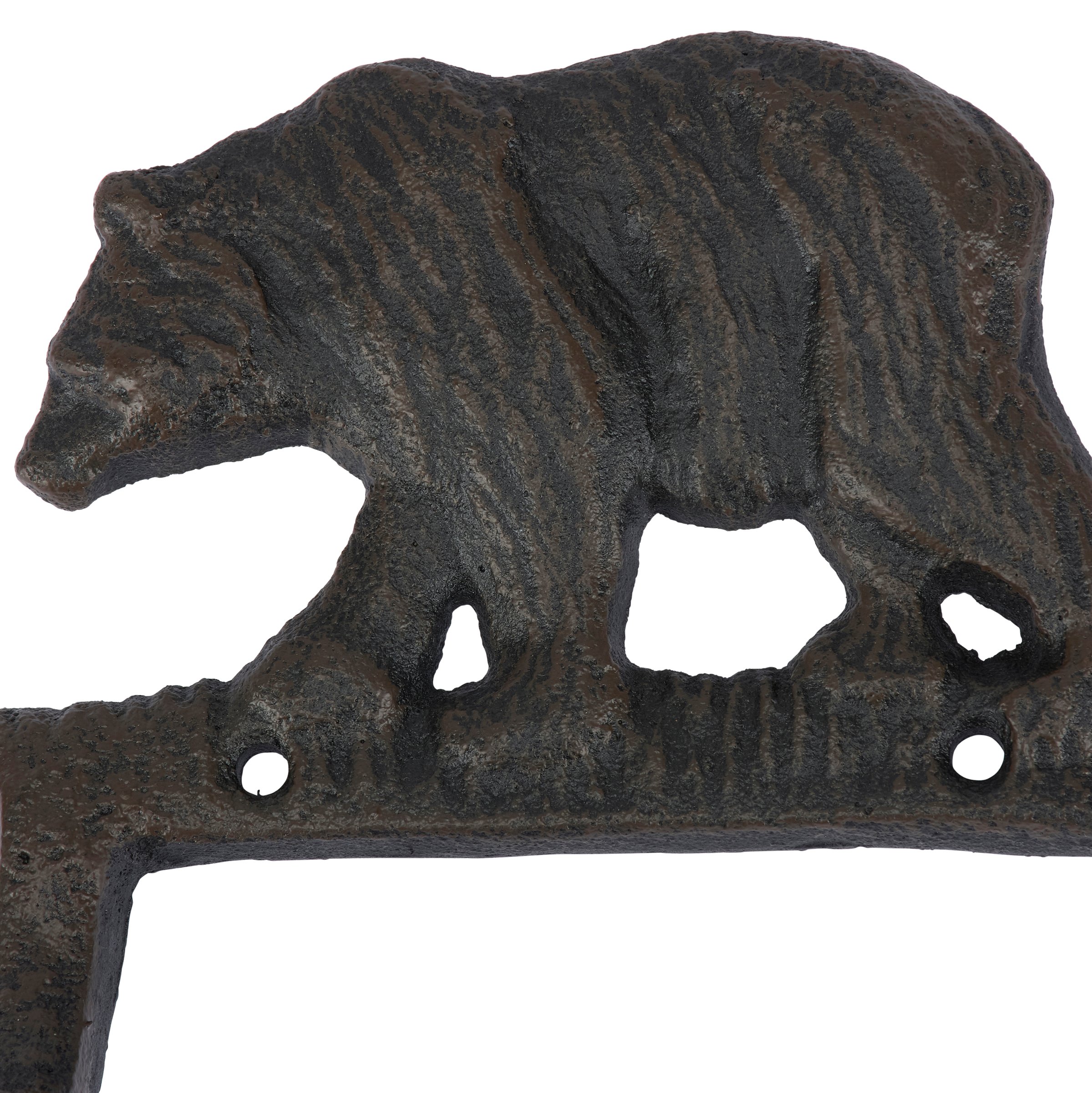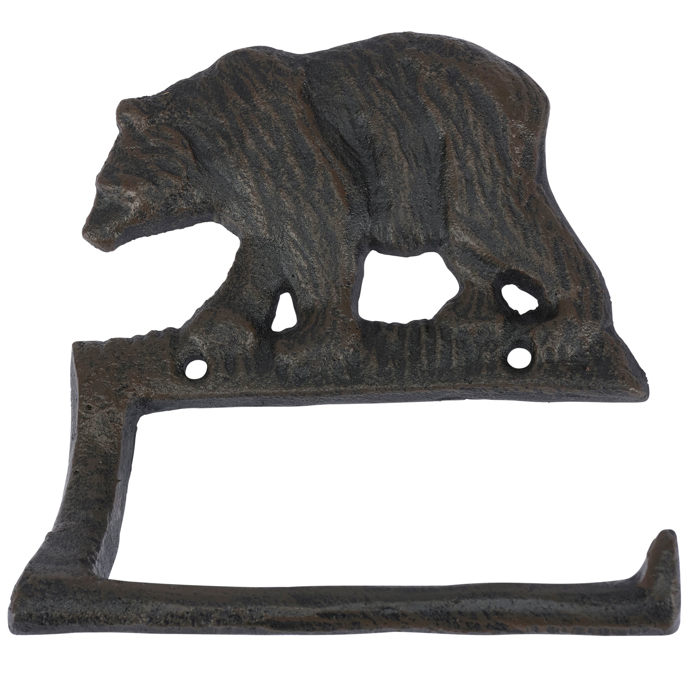 A metal toilet paper holder from our Lake & Cabin Collection displaying a rustic design inspired by cabin décor. This sturdy toilet paper holder features a sculpted black bear design with antique finish and hook to place roll. Our Black Bear toilet paper holder is easy to hang for display and use via predrilled holes. A rustic home accent that adds functional style to any bathroom.