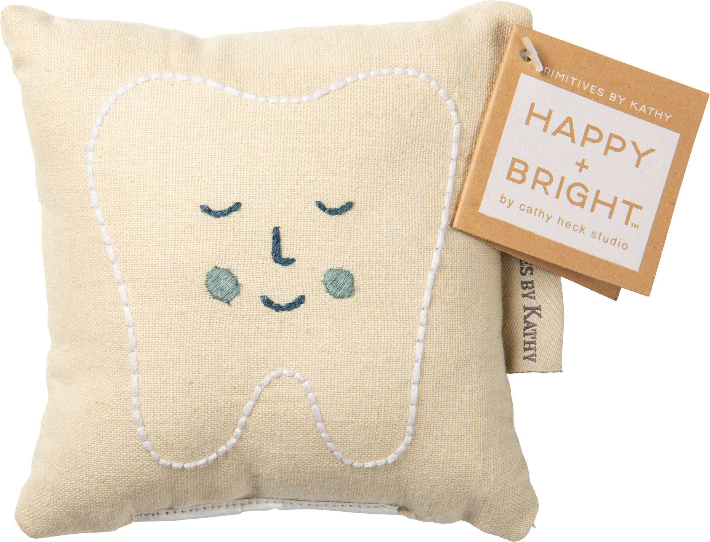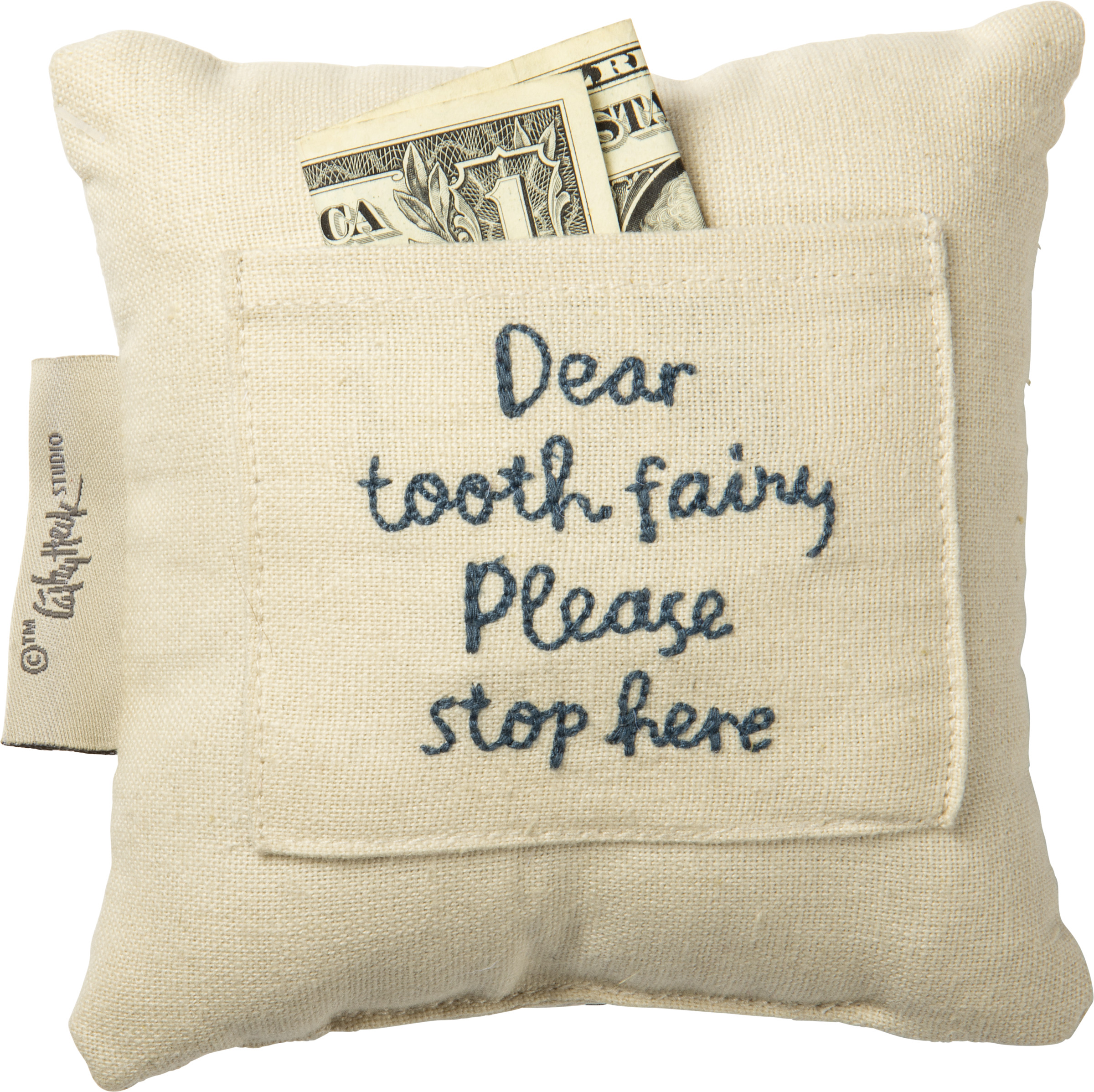 A double-sided cotton linen blend pillow from our Baby & Kids Collection featuring embroidered tooth design on front, and "Dear Tooth Fairy Please Stop Here" sentiment in blue on back pocket. Pocket is perfect for storing a tooth for the tooth fairy! Polyester filled. Tooth Fairy pillow complements well with other pieces in collection to create a cohesive display. A part of our exclusive Happy + Bright Collection. Textiles are phthalate and AZO dye free. Our Blue Tooth Fairy Pillow is shipped vacuum-sealed for protection and storage.