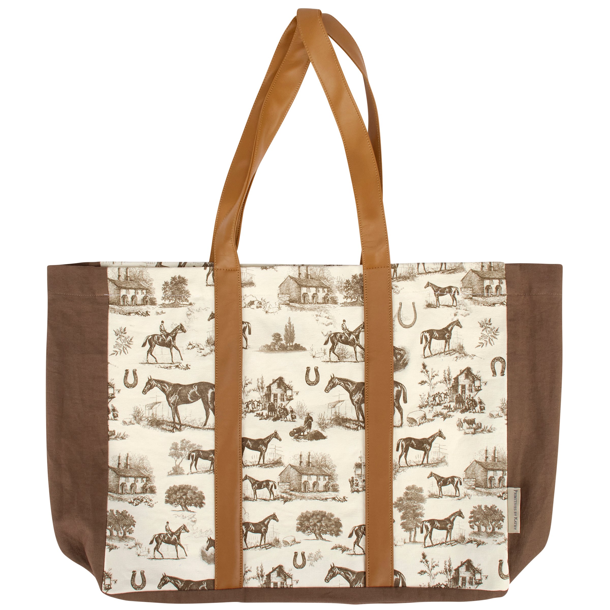 A canvas tote from our Preppy Heritage Collection featuring a double-sided design displaying a toile pattern of vintage equestrian art with faux leather strap accents. Our Horse Toile tote measures 18 inches by 14 inches ideal for shopping or travelling. An equestrian themed accessory perfect for vintage style when on the go.