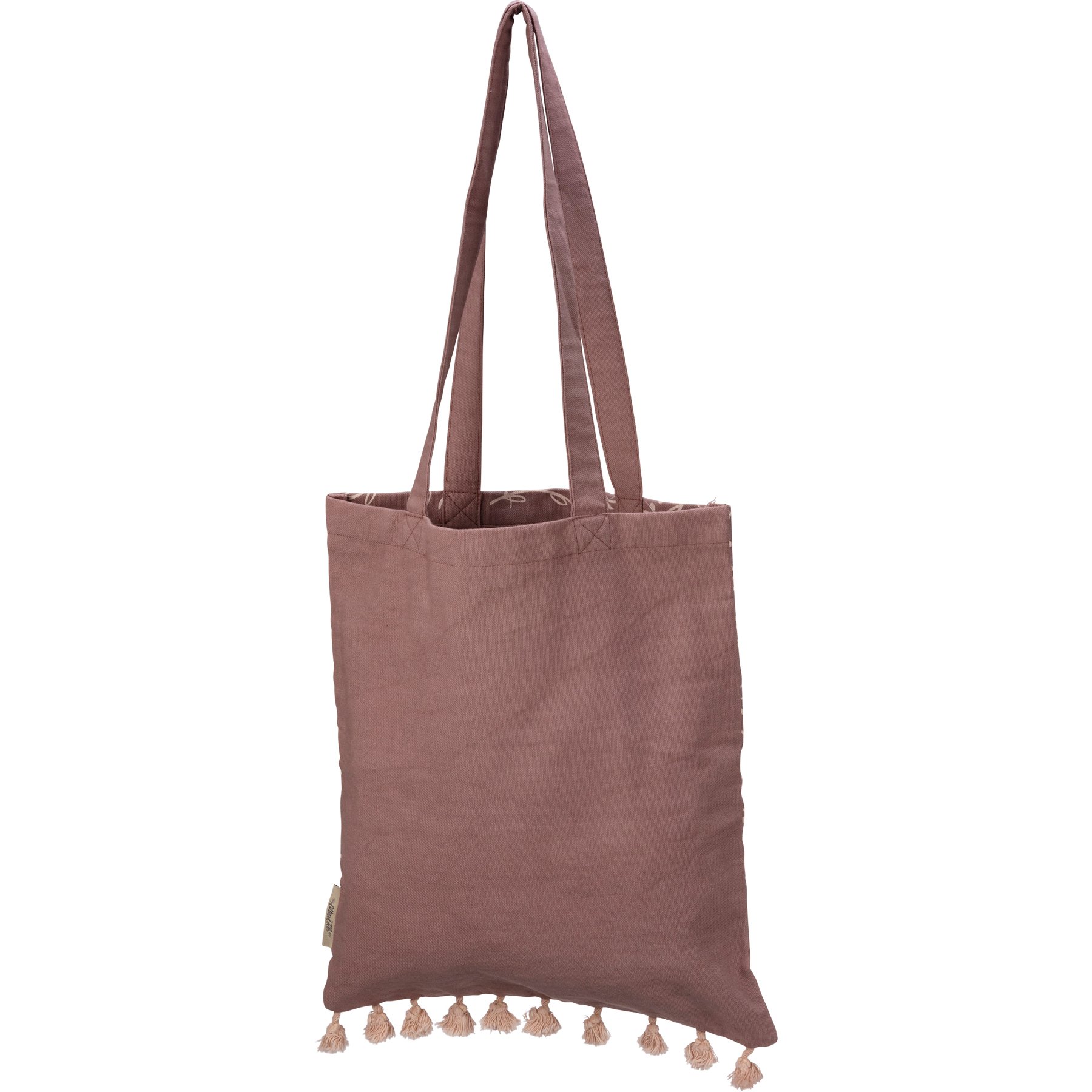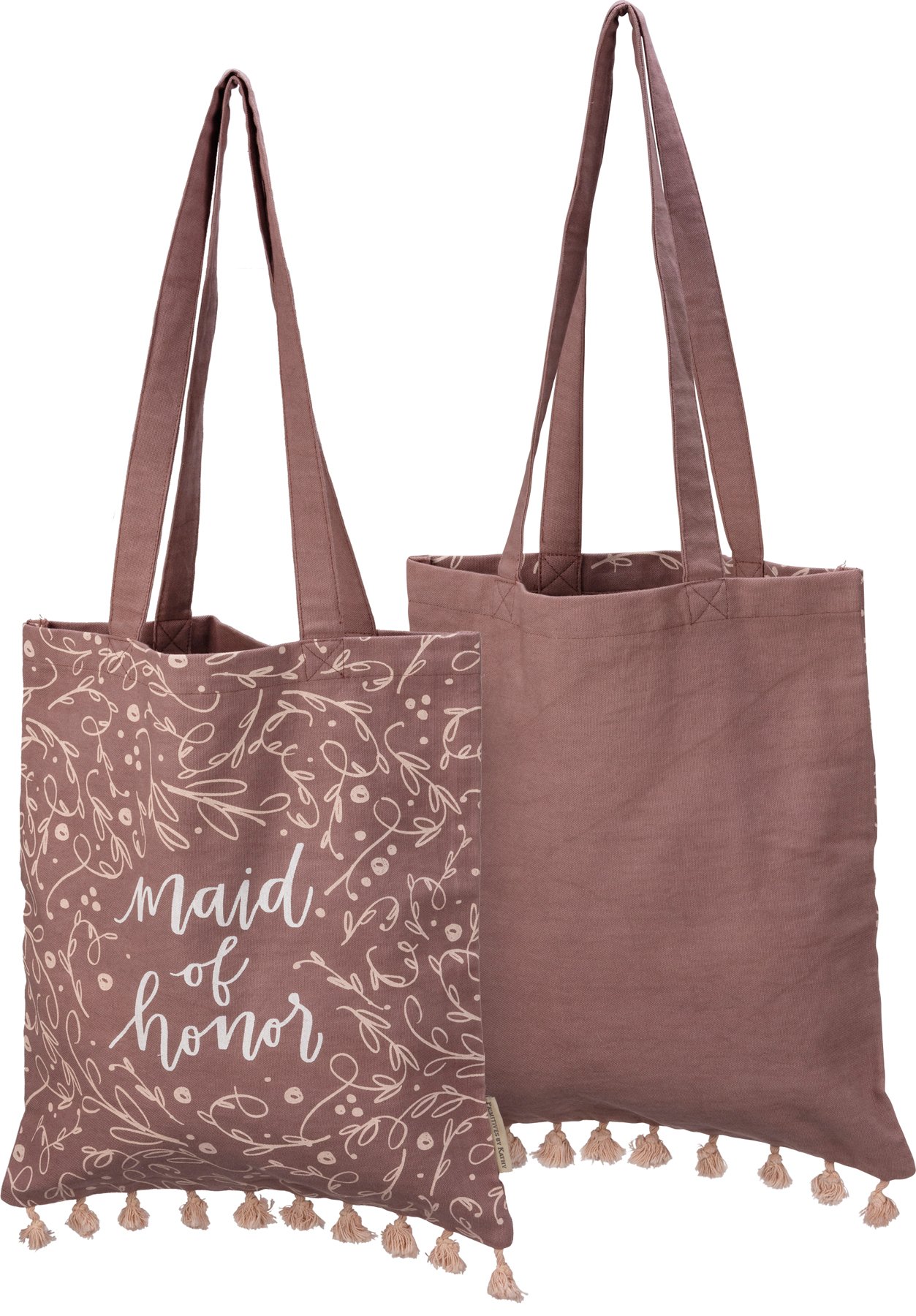 A cotton tote featuring a "Maid Of Honor" sentiment and floral pattern on the front, and a coordinating solid color on the back. Bottom tassel accents create added interest. The Floral Maid Of Honor tote includes dual shoulder straps for easy carrying.