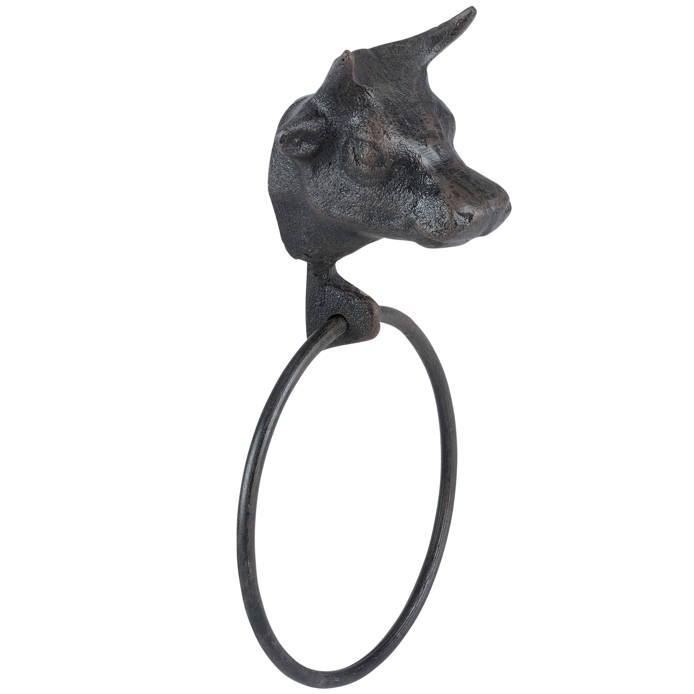 A metal towel holder from our Farmhouse Collection displaying a rustic bull inspired design. This sturdy towel holder features a sculpted bull head design with antique finish and attached ring to place hand towel. Our Bull's Head toilet paper holder is easy to hang for display and use via keyhole slot on the back. A rustic home accent that adds functional style to any bathroom or kitchen.