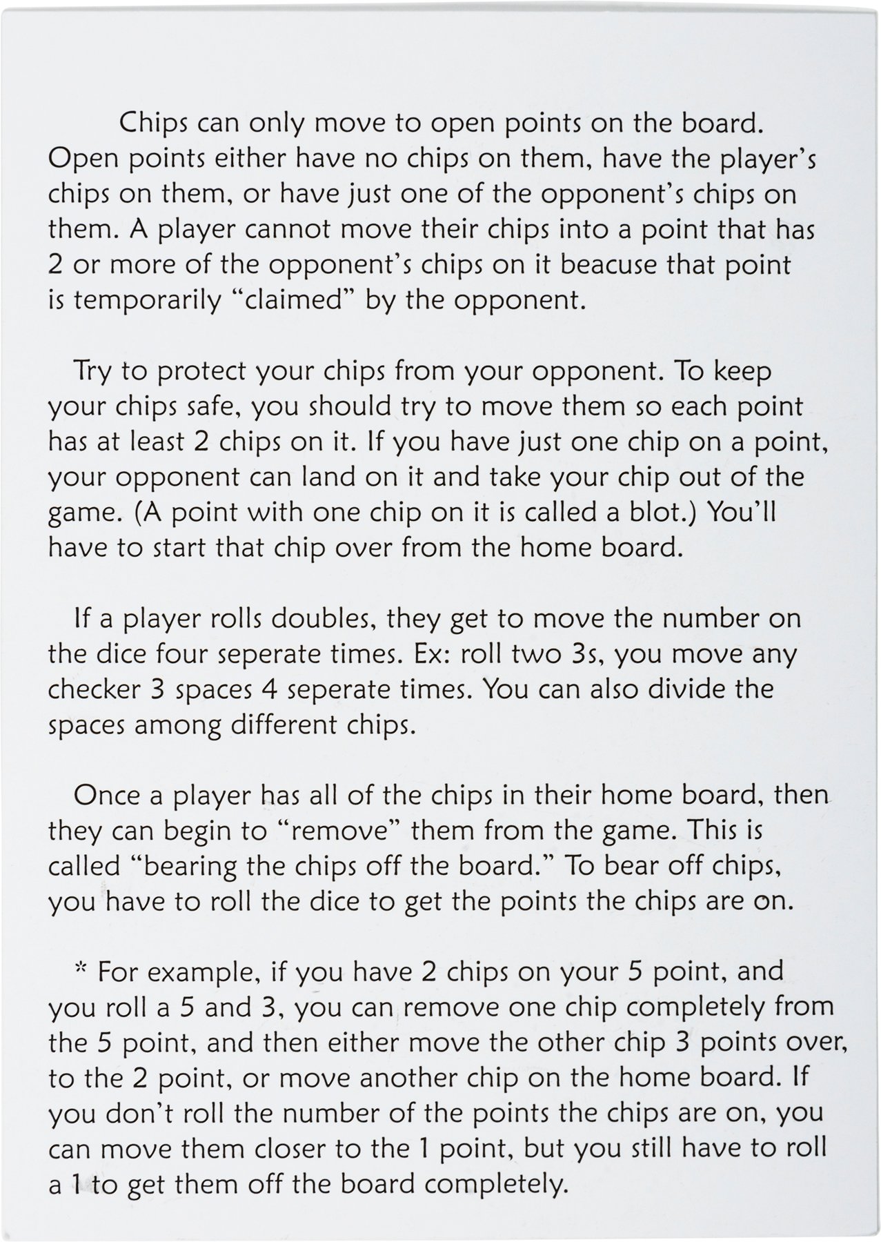 A wooden travel Backgammon game featuring intricate, vibrantly colored wood burned designs. Includes 34 game pieces that can be stored inside the latched game board. Also includes an instruction sheet.