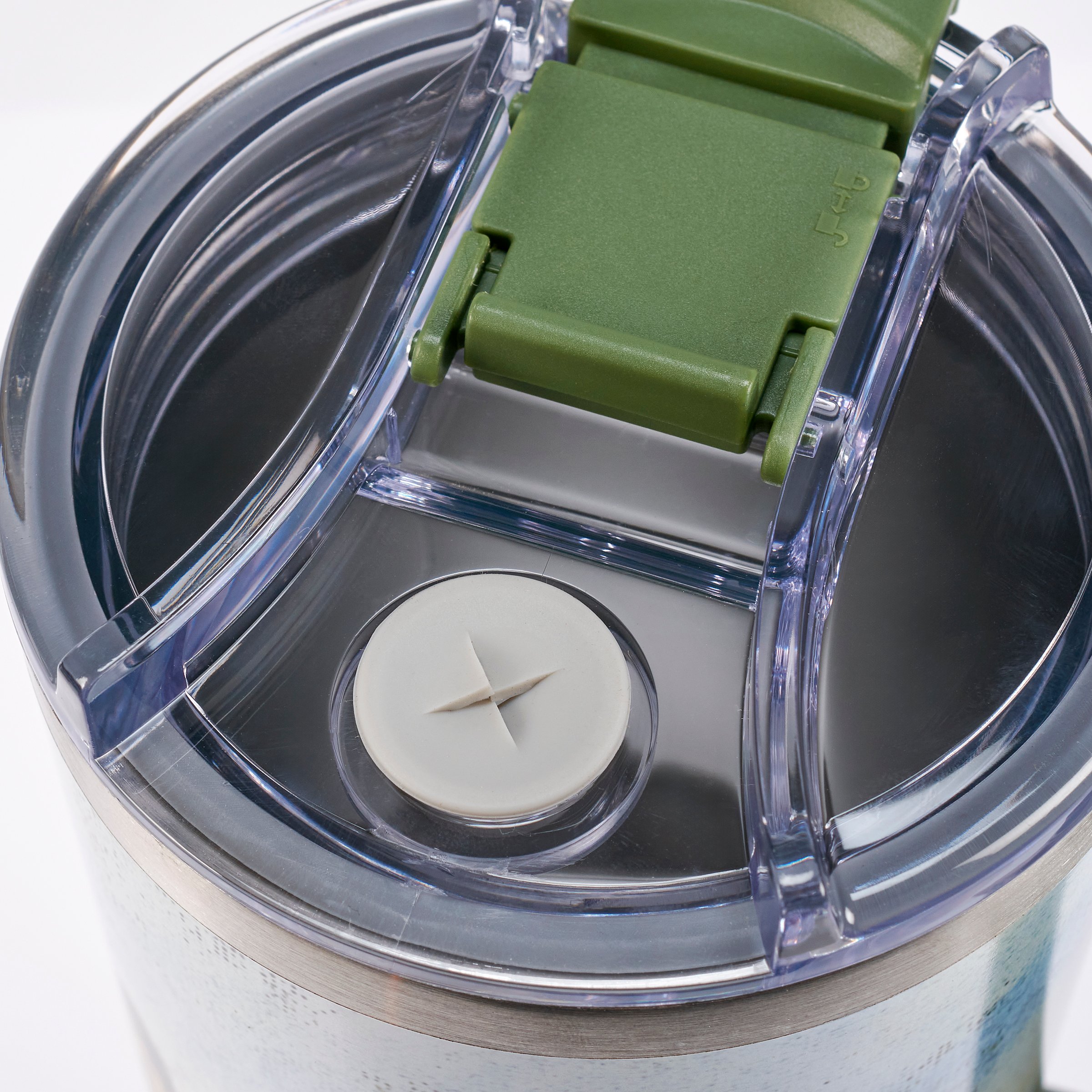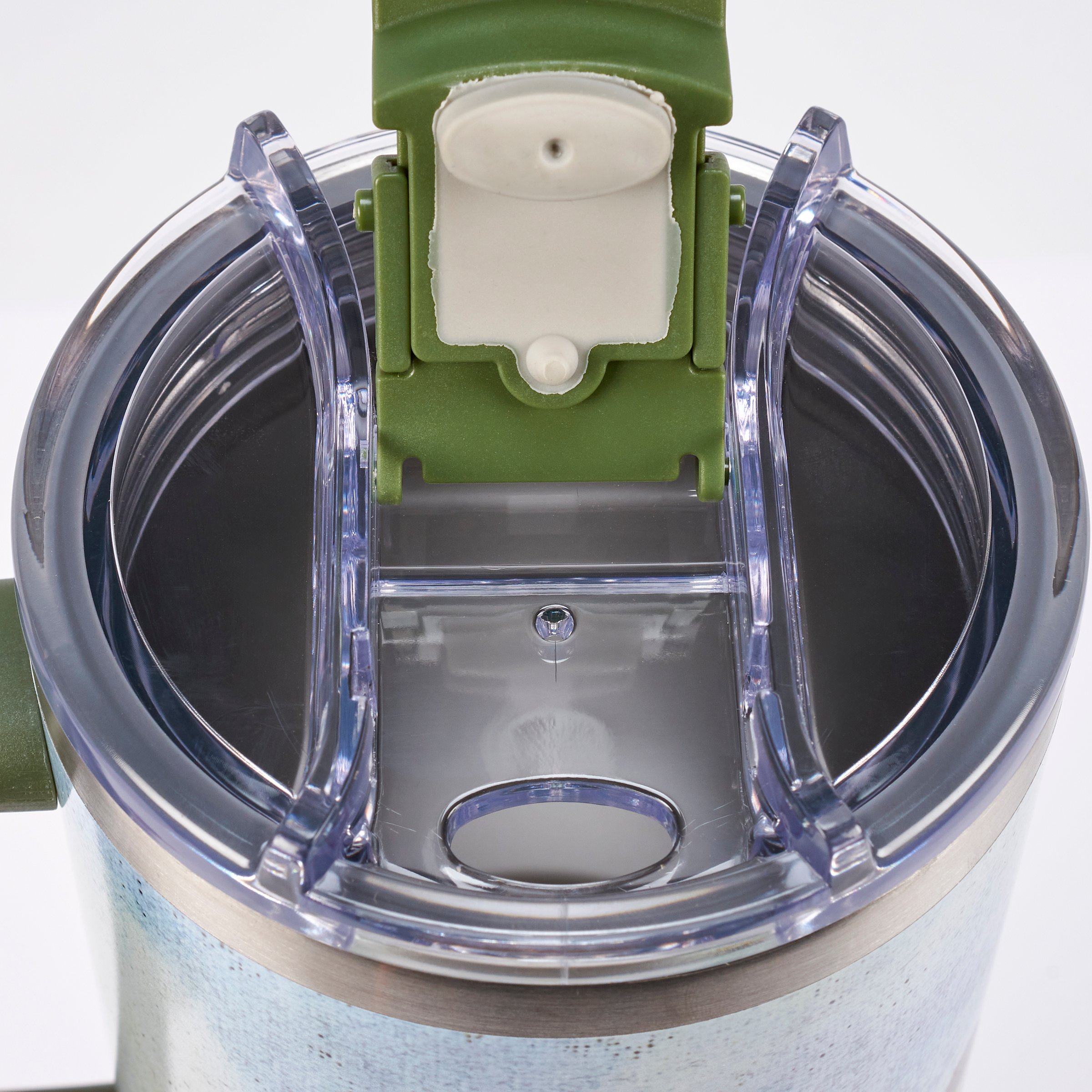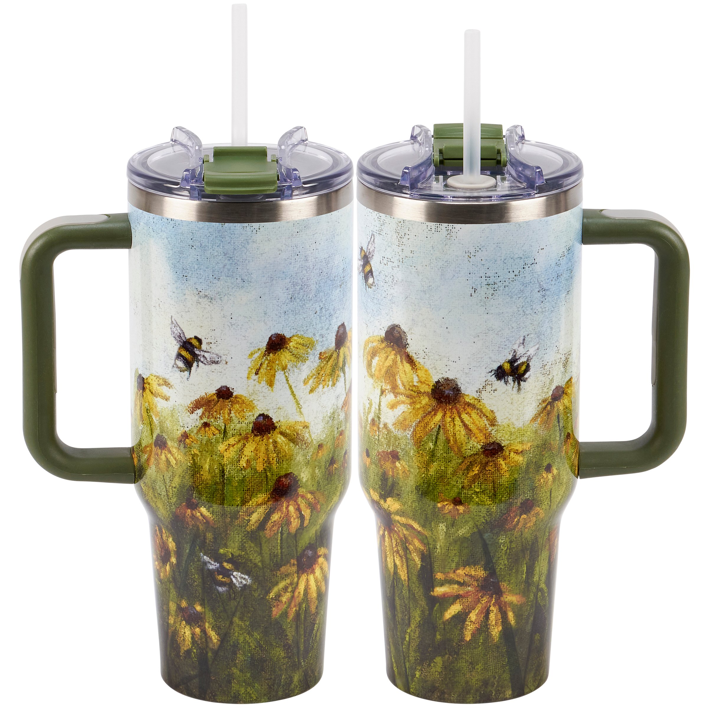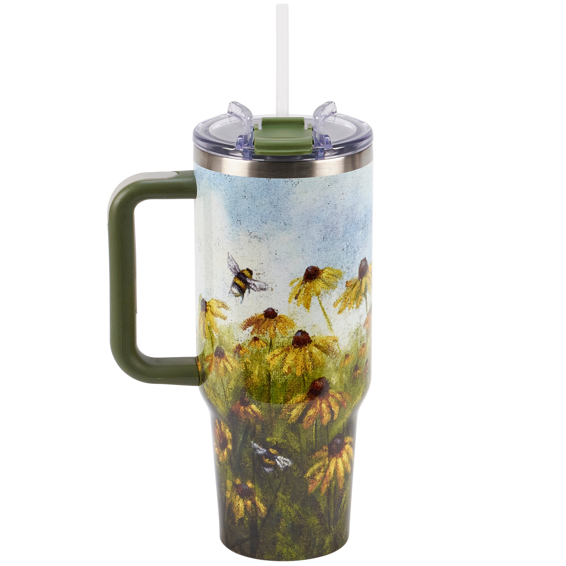 A 40 oz stainless steel travel mug from our Garden Collection displaying a full wrap-around design of a field of black-eyed susans with bees. Design is replicated from original artwork painted onto burlap canvas, giving the art a unique depth and texture. Our Black-Eyed Susan travel mug is insulated to keep beverages hot for 7 hours or cold for 11 hours and features a large handle as well as a narrow base that fits most cup holders making it great for on the go. Insulated travel mug includes a reusable straw and multipurpose lid with sip opening that can also be used with straw. Hand-wash only; do not microwave. A charming garden-themed accessory perfect for on-the-go.