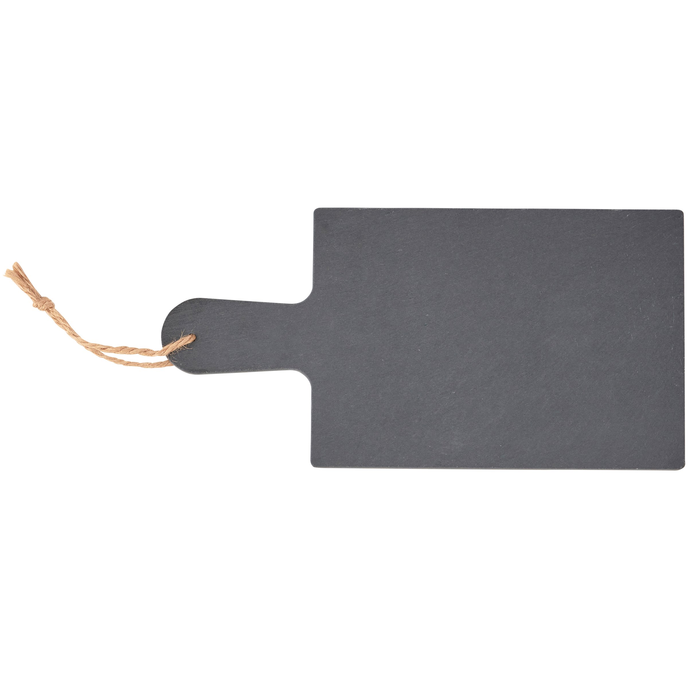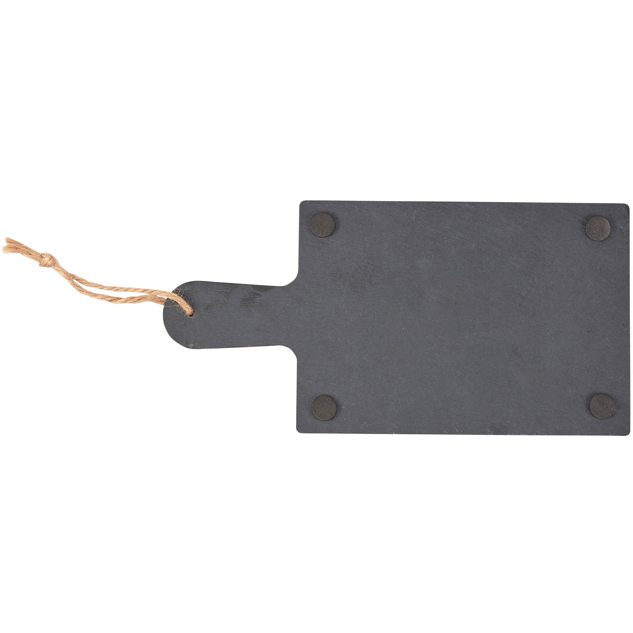 A slate serving tray from our Tabletop Collection designed to use as a stylish charcuterie board. Our Charcuterie tray features a rectangle shape with a food-safe surface and a handle to easily carry. Tray also features soft pads on the bottom for safe placement and jute loop for hanging when not in use. A stylish kitchen accessory perfect for everyday gatherings.