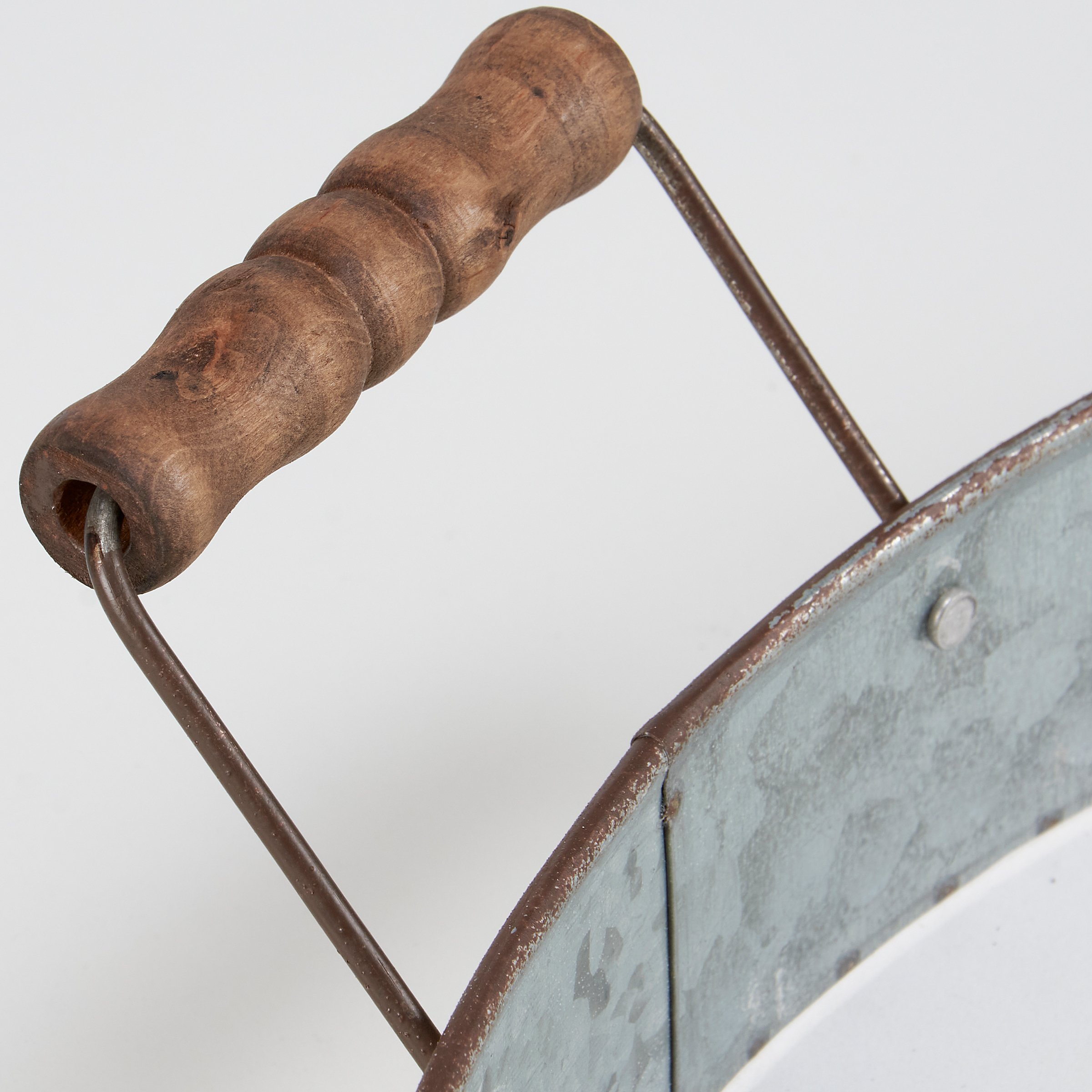 A galvanized metal tray from our Garden Collection displaying a charming scene of a gnome gathering daisies with a yellow gingham pattern along the sides of the tray. Designs are replicated from original art hand painted in a delicate watercolor style. Our Daisy Gnome tray includes dual metal handles with wooden grips for easy carrying. Decorative use only; not food safe. A charming daisy-themed home accent perfect for everyday use.