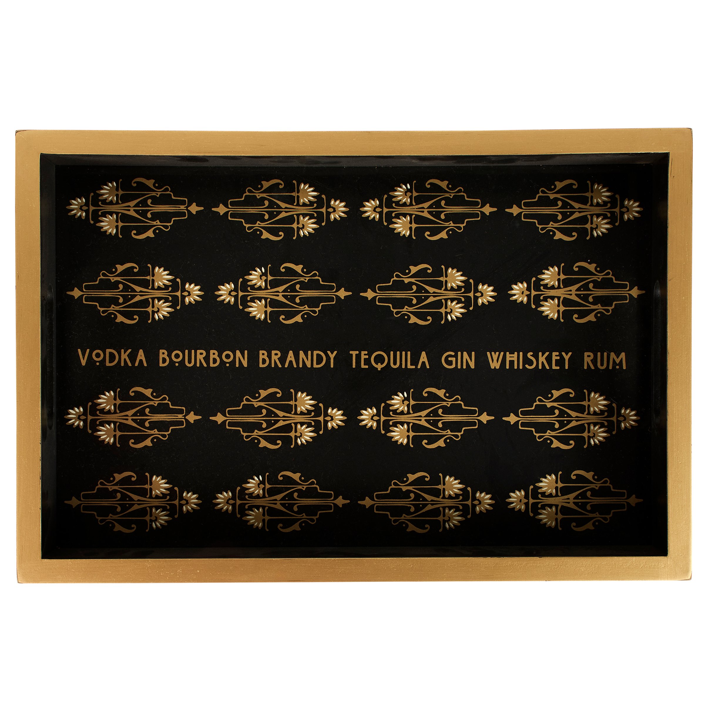 A wooden tray from our Art Deco Collection displaying and art deco inspired design with metallic gold accents and alcohol-themed sentiment that reads "Vodka Bourbon Brandy Tequila Gin Whiskey Rum." Our Deco Cocktail tray includes a glass layer on the tray and dual side handles for easy carrying. A vintage alcohol-themed bar accessory perfect for everyday use.