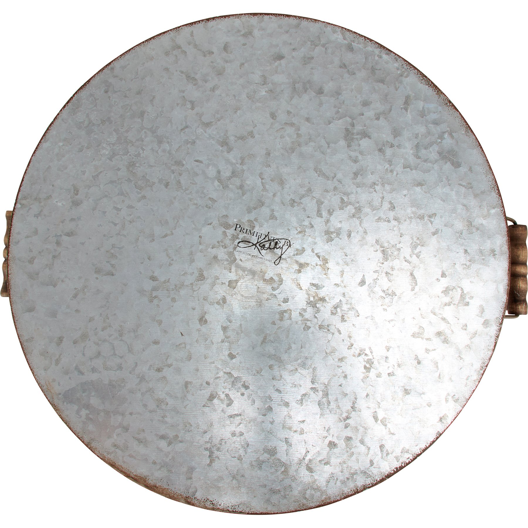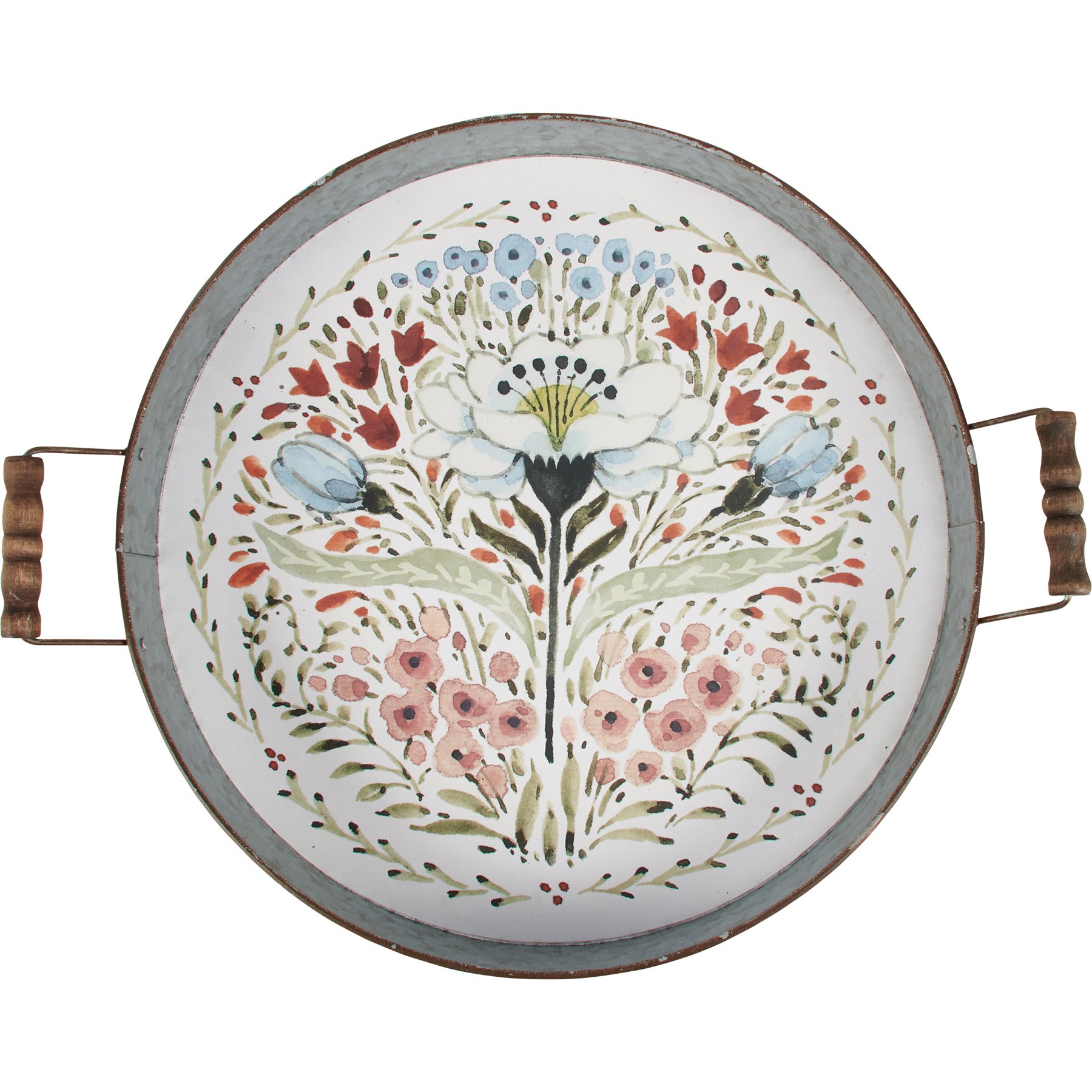 A galvanized metal tray from our Farmhouse Collection displaying a rustic hand painted floral design and red gingham along the outside. Our Farmhouse Floral tray includes dual metal handles with wooden grips for easy carrying. Decorative use only; not food safe. A charming everyday home accent with a variety of display options.