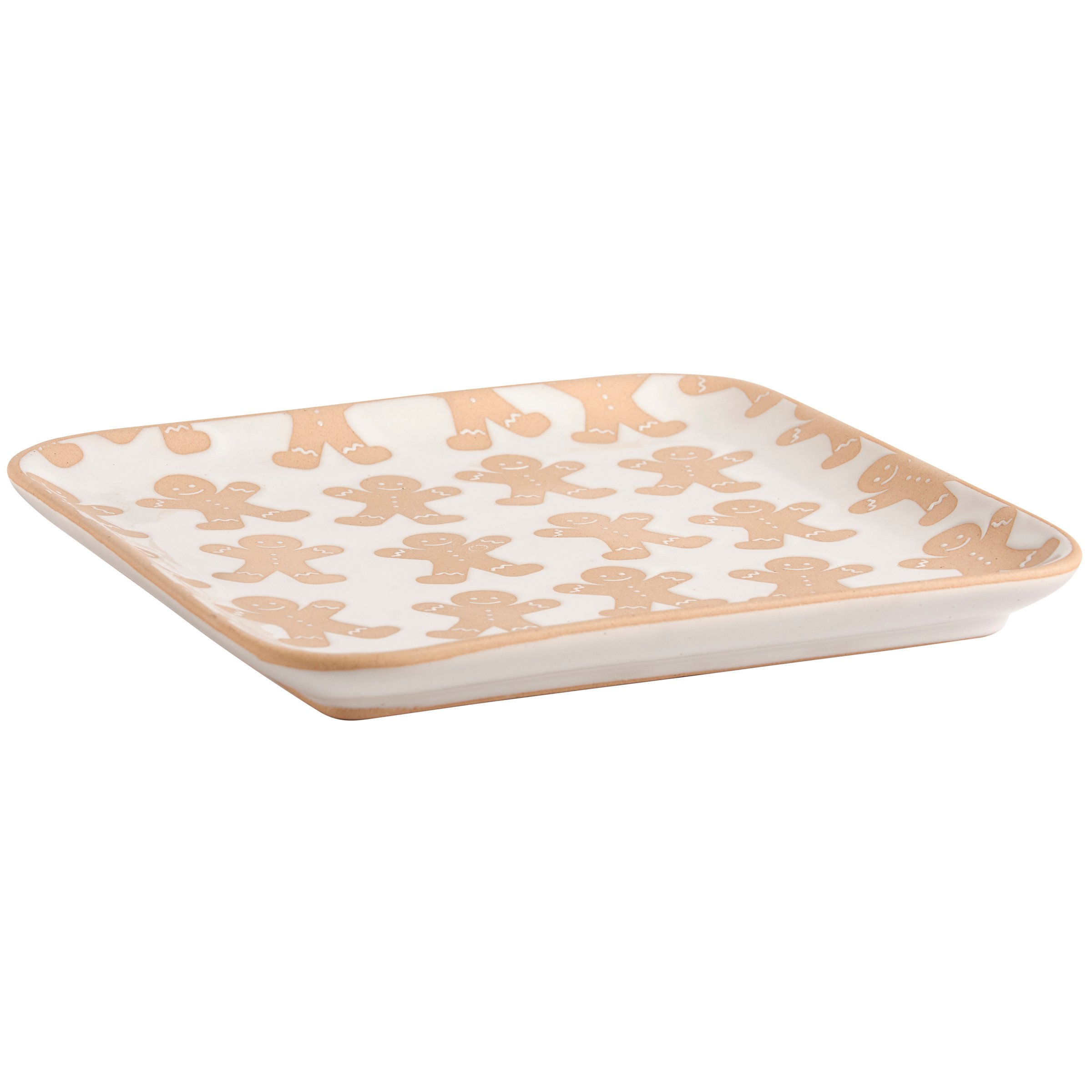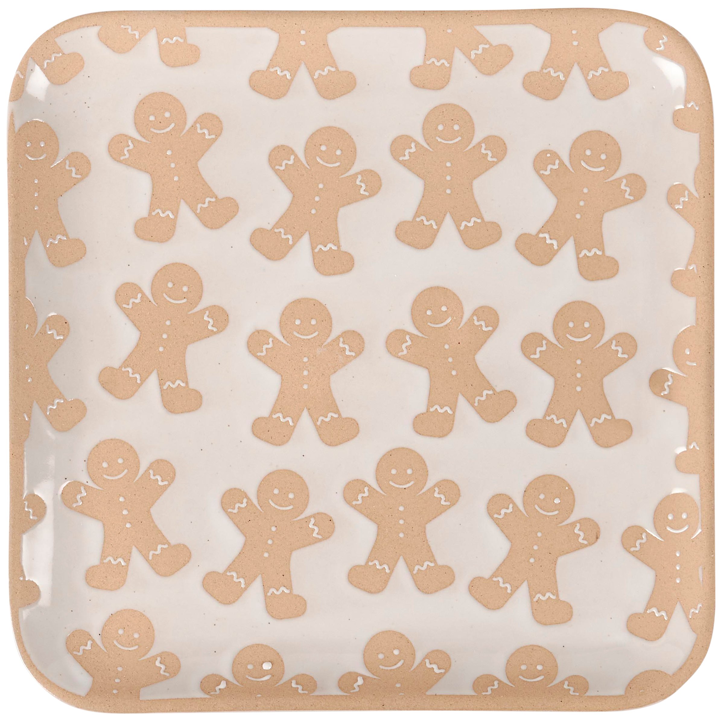 A durable stoneware tray from our Christmas Collection displaying a snowy cream color with debossed happy gingerbread men in brown on the inside and a bare ceramic accent on the rim. Our Gingerbread Man tray is conveniently microwave, dishwasher, and food safe for easy use. A fun piece of gingerbread-themed tableware perfect for seasonal gatherings.