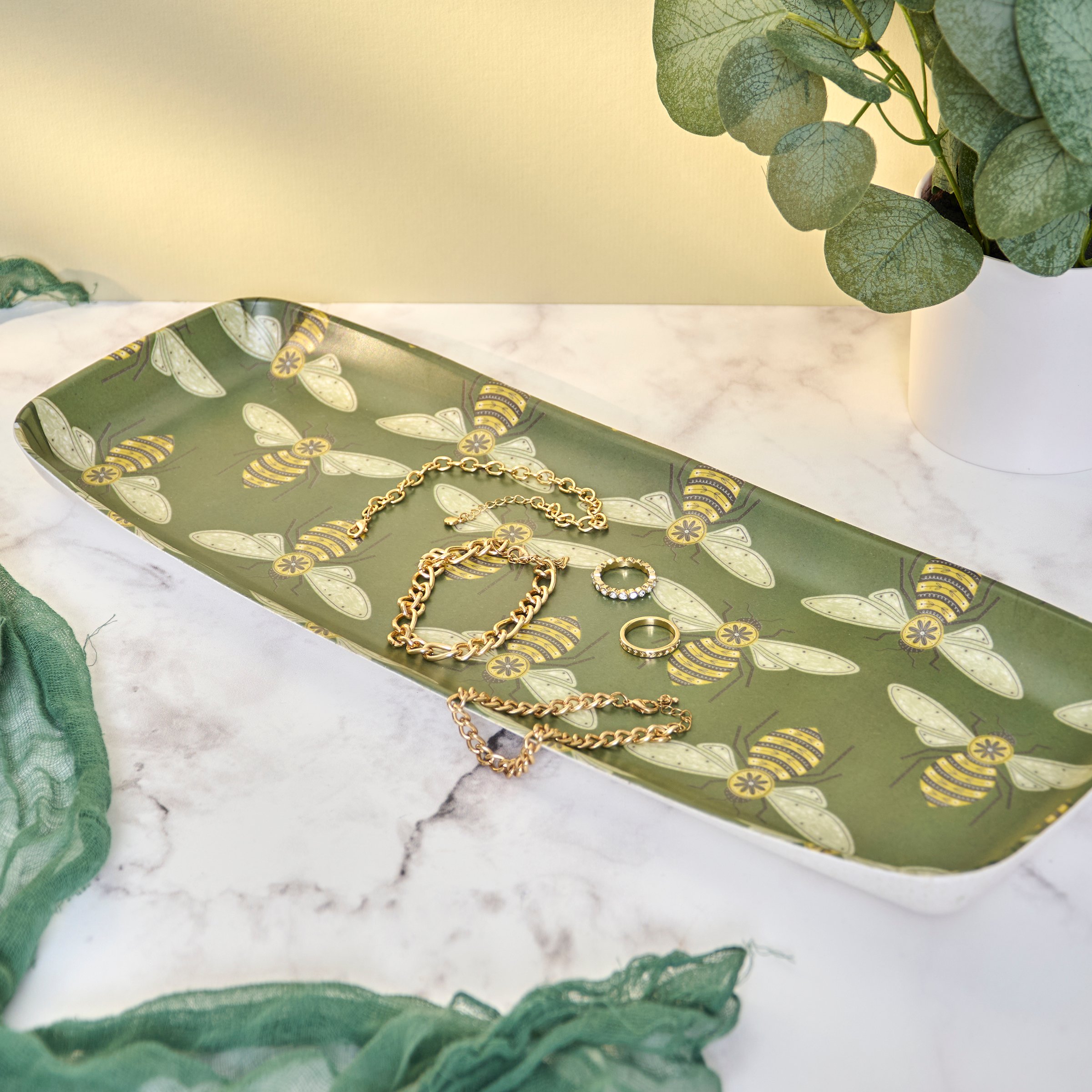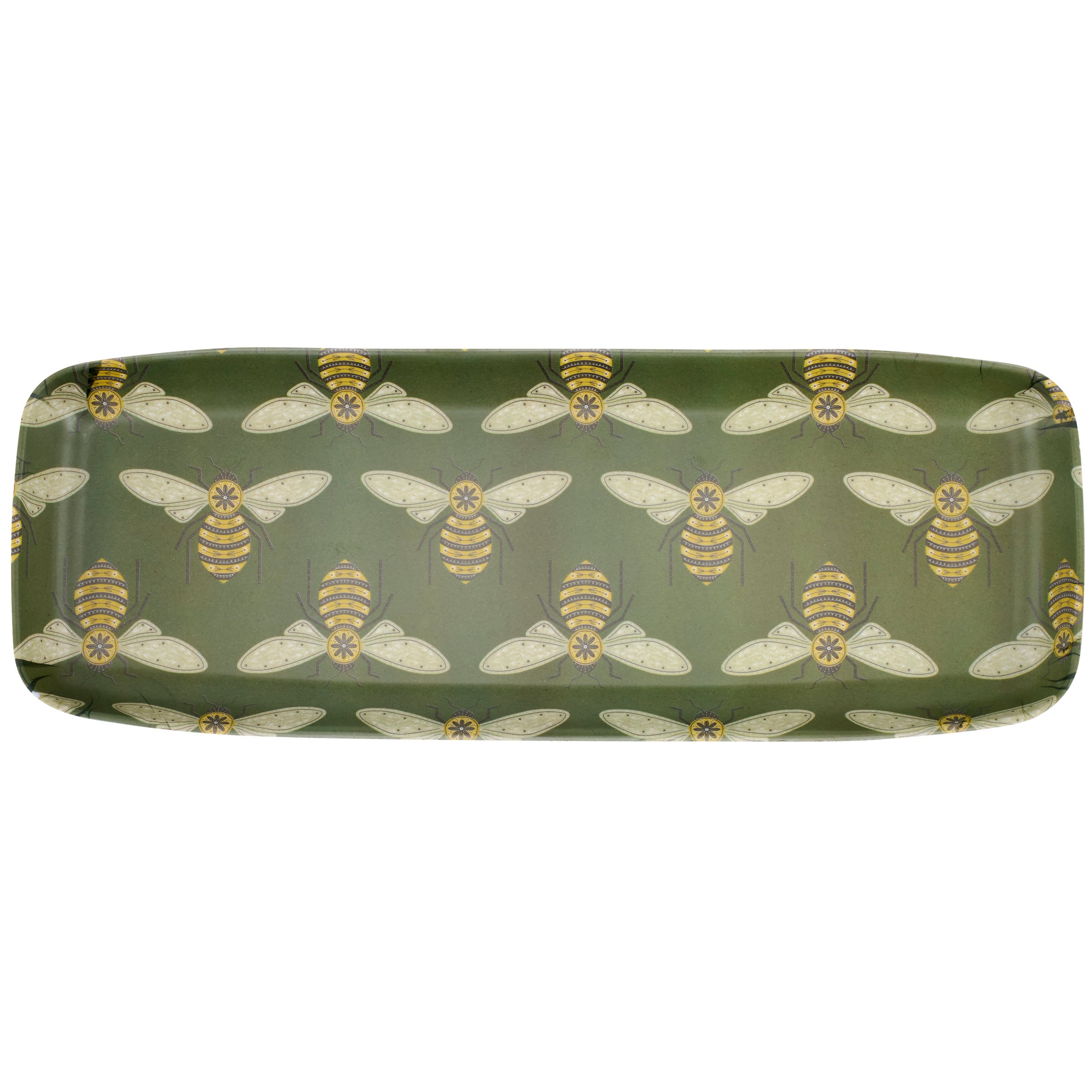 A bamboo tray from our Garden Collection displaying a garden inspired pattern of honey bees with floral details replicated from original hand illustrated artwork. Our Honey Bees tray is conveniently dishwasher safe for easy cleaning. Do not microwave. A piece of garden-themed tableware perfect for everyday gatherings.