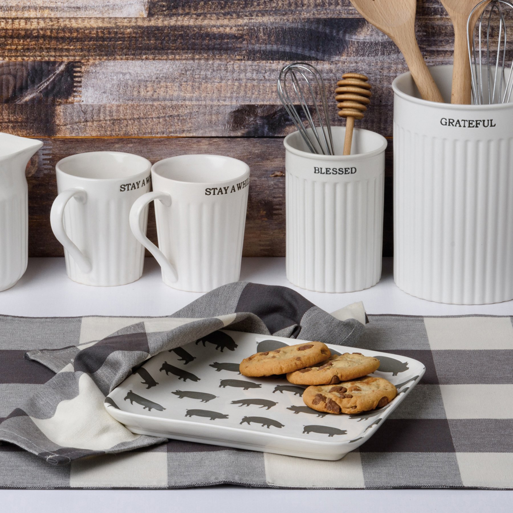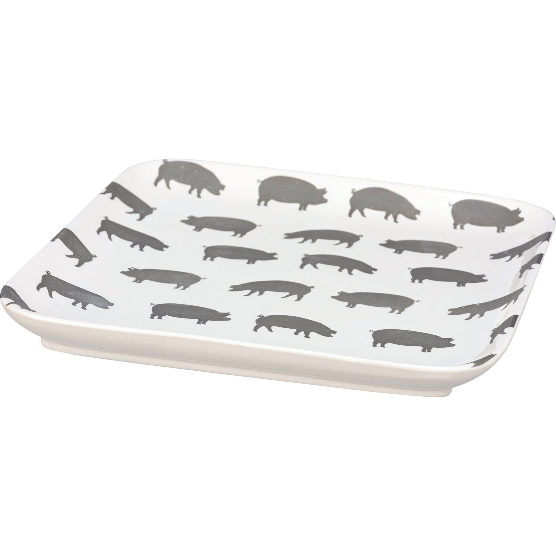 A white stoneware tray featuring debossed gray pig designs. Our Pig tray is microwave, oven, dishwasher, and food safe.