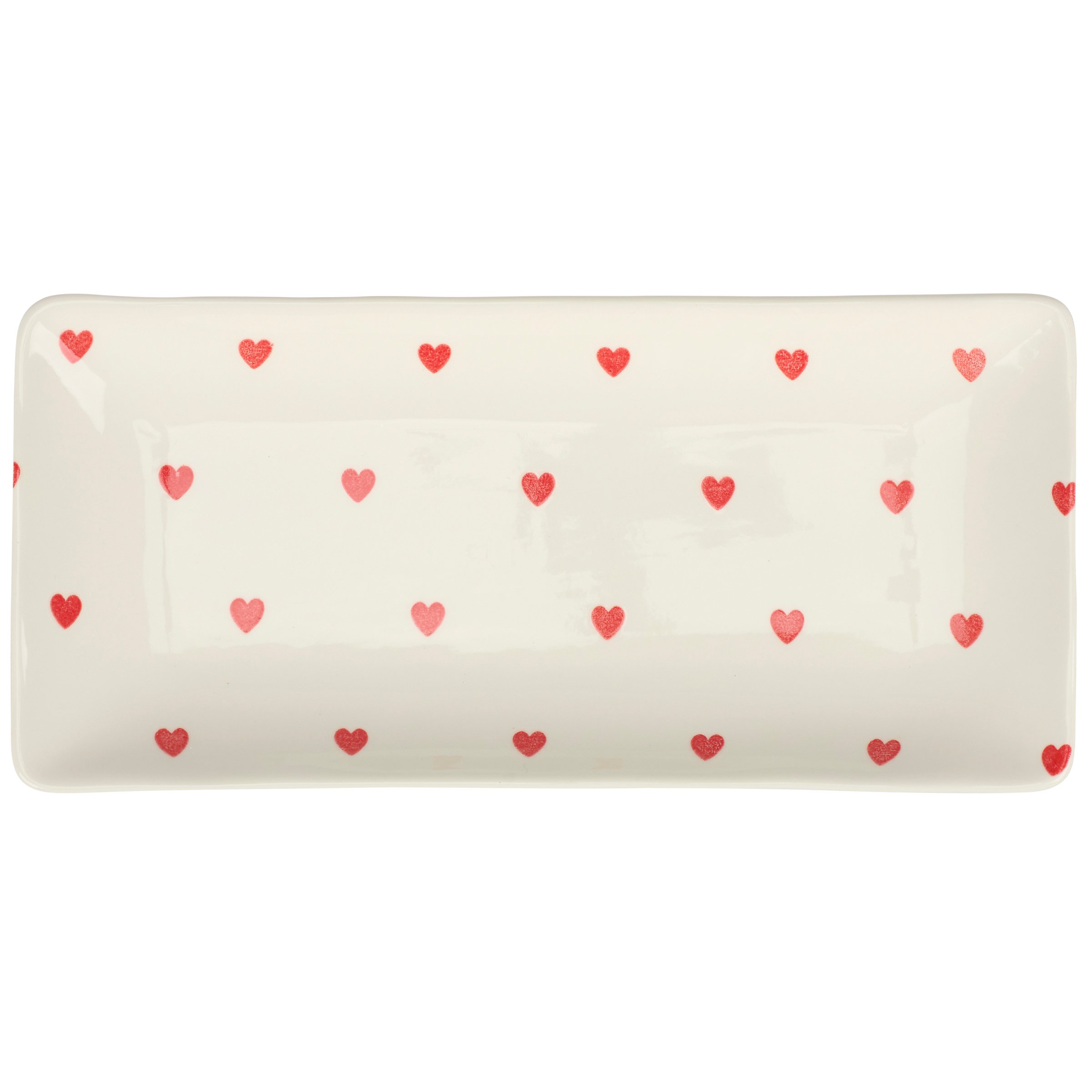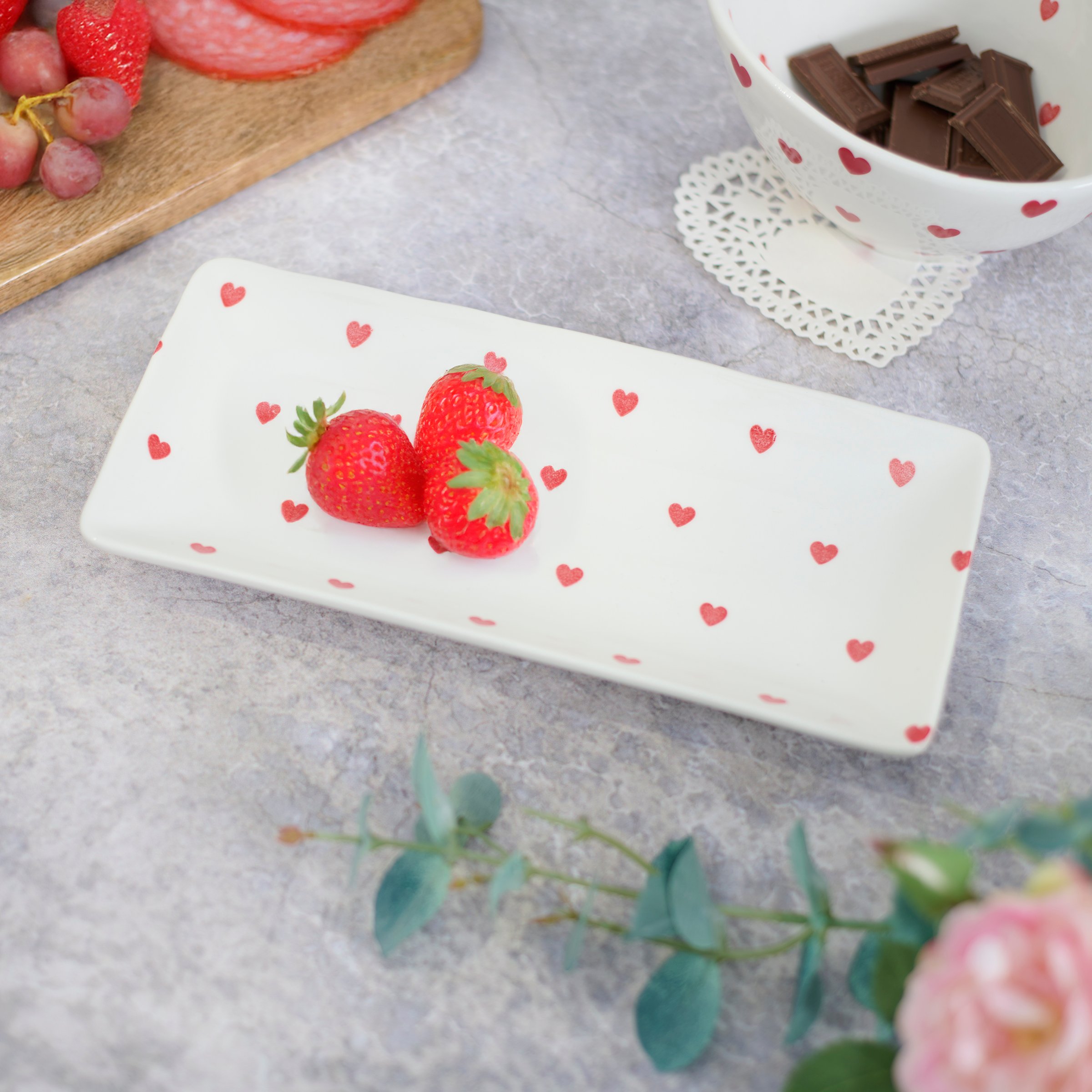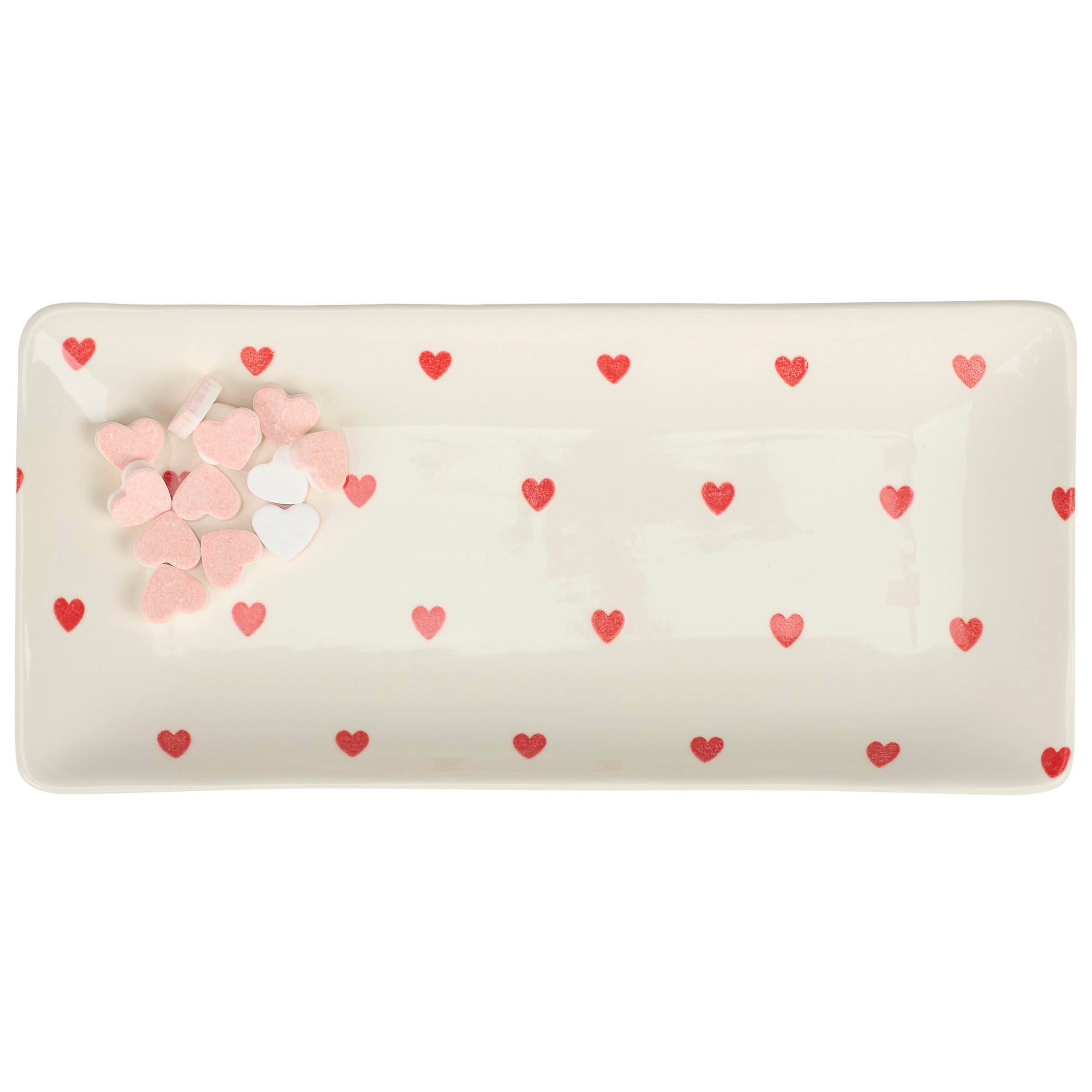 A durable stoneware tray from our Valentine's Day Collection displaying a cream glaze finish with a debossed pattern of red hearts inside of the tray. Our Red Hearts tray is conveniently microwave, dishwasher, and food safe for easy use. A piece of love-themed tableware perfect for seasonal gatherings.
