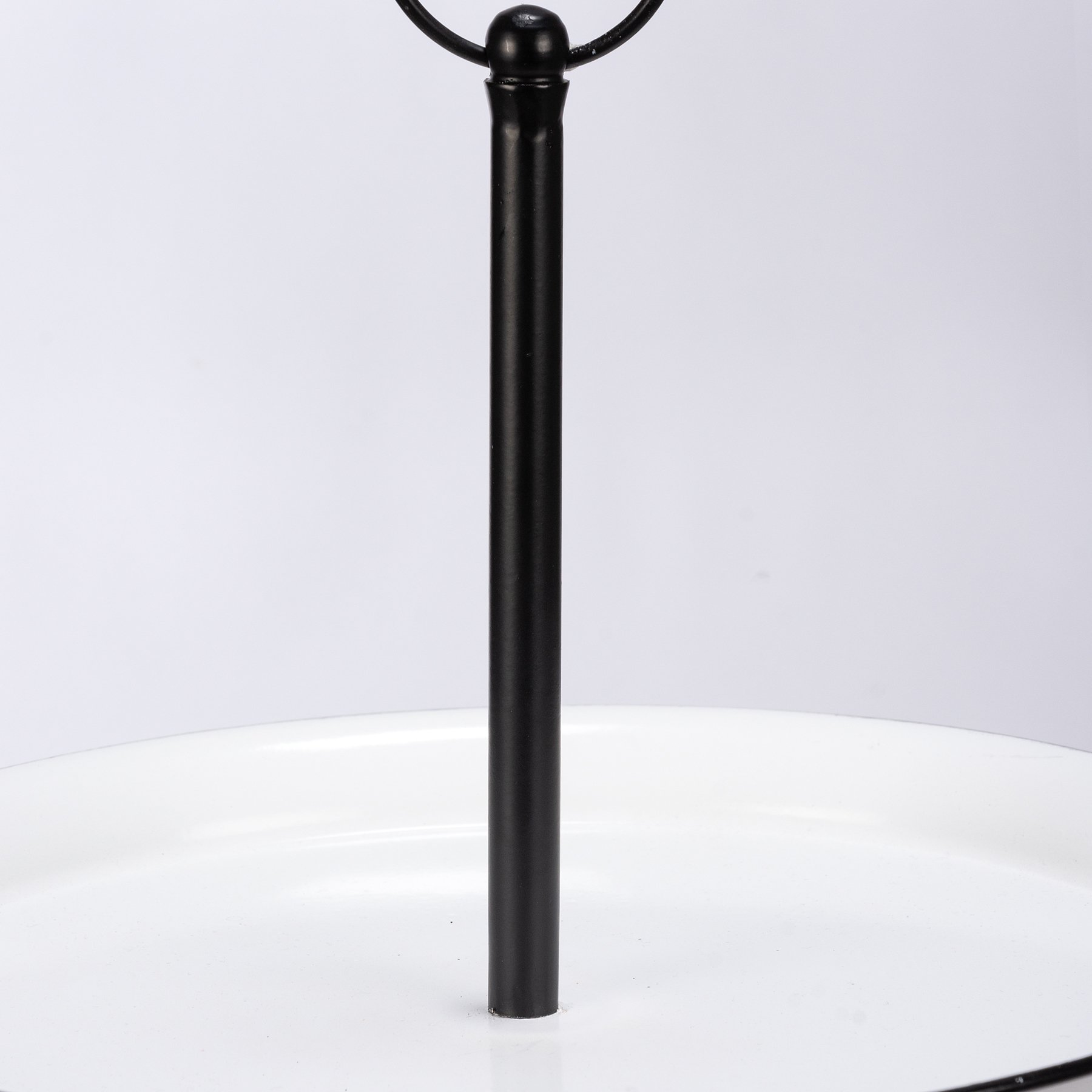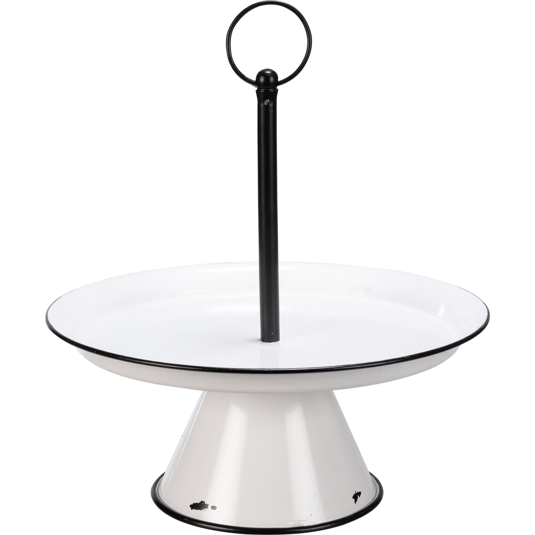 A single tier pedestal tray from our Farmhouse Collection perfect for displaying small items. This metal tray features an enamel-like finish and distressed details for added appeal. Assembly required for the single tiered pedestal tray.