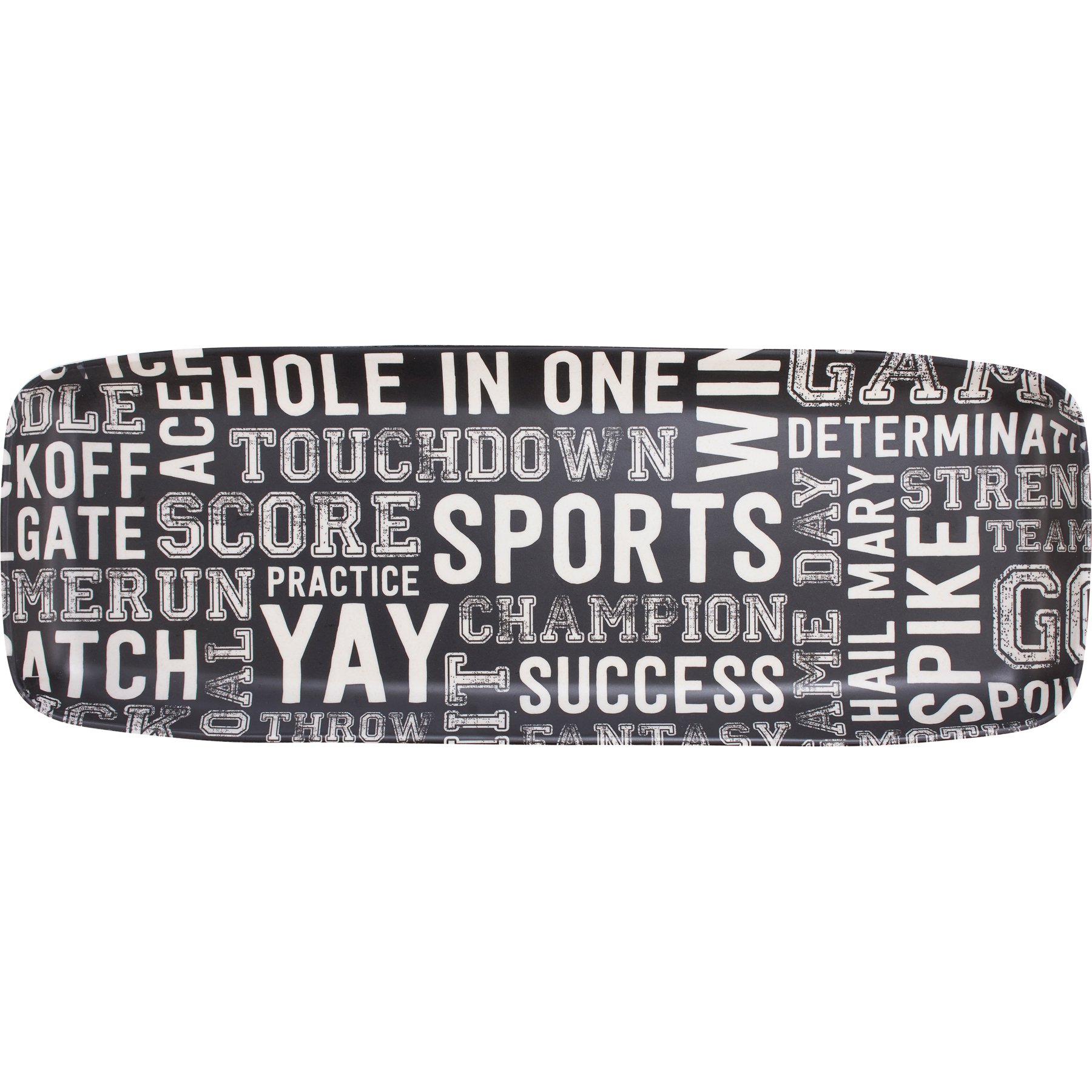 Perfect for gameday, a wide tray displaying sports-themed phrases in an all-over design with distressed detailing. Tray is large enough to place multiple food items throughout. Complements well with coordinating pieces in our Sports Collection for a cohesive table display. Our Sports tray is made with bamboo fiber, melamine, and BPA-free. Dishwasher safe; do not microwave.